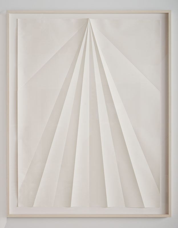 Gonzalo Lebrija has used the mediums of video, photography and sculpture to examine notions of time resulting in playful works with layers of meaning. His recent series of deconstructed/unfolded paper airplanes and paintings from unfolded paper, bring up questions of memory and transference. The austere geometry of the folds, alluding to the paper in another form, remind us that nothing is static. The reference of making paper airplanes points to a youthful symbol of imagination and crossing distance. The oil painting Veladura 3 suggests formal aerodynamics with a translucent layering of colors.