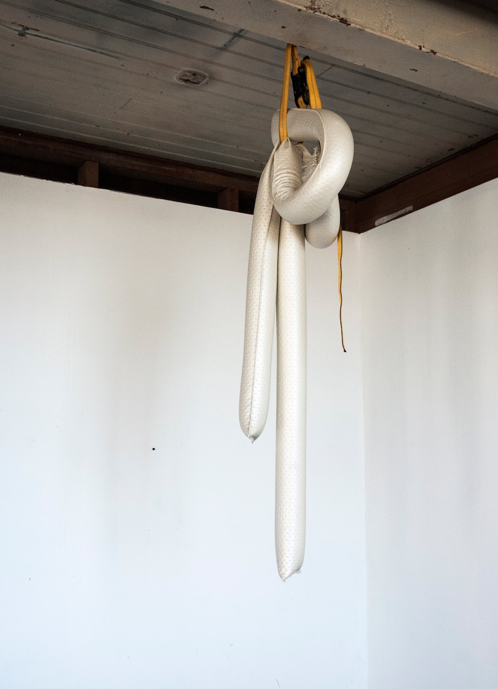MAX MASLANSKY - The Help (pillow case), 2015, Acrylic on pillow case, 33 x 17 inches MAY WILSON - Hung1 (white), 2015, Sand, vinyl, and strapping, 1 foot x 2 feet x 3 feet