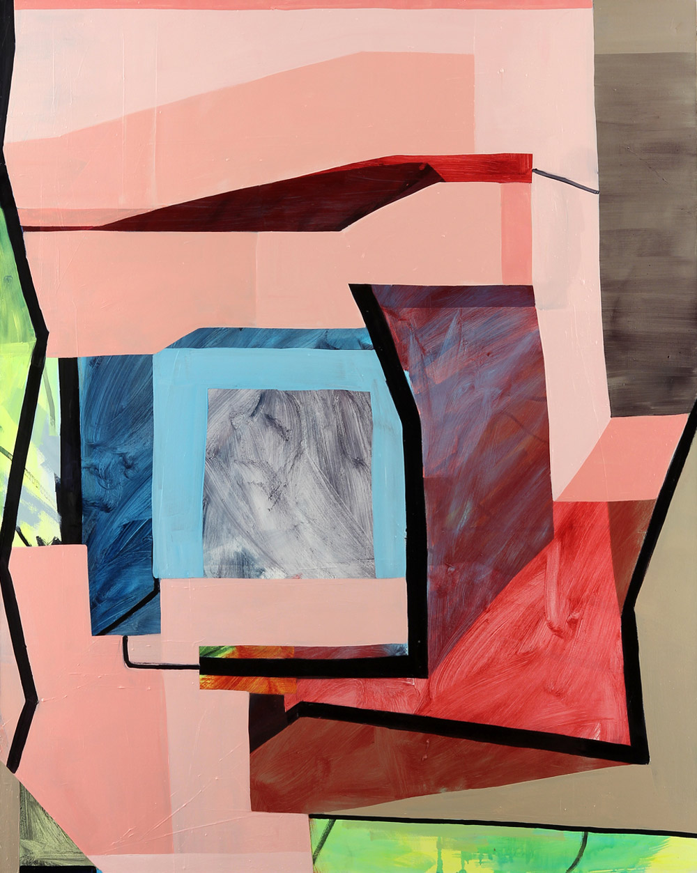 Daniel Gerwin, Rebekah Goldstein and Roman Liška’s works have less explicit formal relationships to the body, but reference it in other ways. Goldstein’s strong sense of color and playful perspectives suggest windows and doors that one could creep or crawl through–perhaps on the way to a forbidden tryst–and her titles suggest the pinks of flesh and genitals. Gerwin’s deconstructed home interiors evoke nostalgic recollections of intimate interactions through use of trompe l’oeil. Liška’s formalist constructions of sharp diagonals in contrast with materials of burlap and corrugated rubber evoke a sensual tension, suggesting censorship and bondage. Max Maslansky’s erotic scenes, created by painting images from 1970s pornography stills onto bed sheets, offer a peek into the illicit realm of the retro boudoir, where the lovers frolic amid the lines of mid-century modern furnishings.
