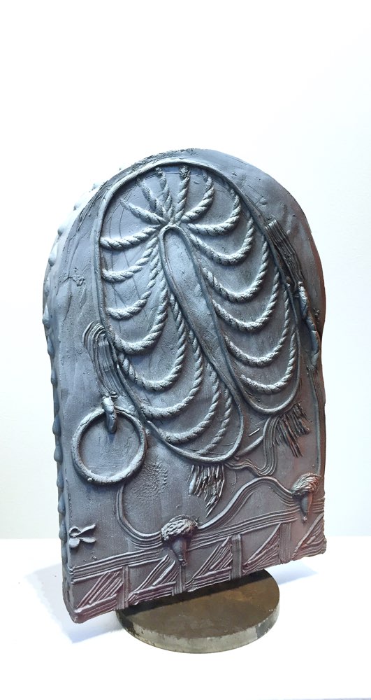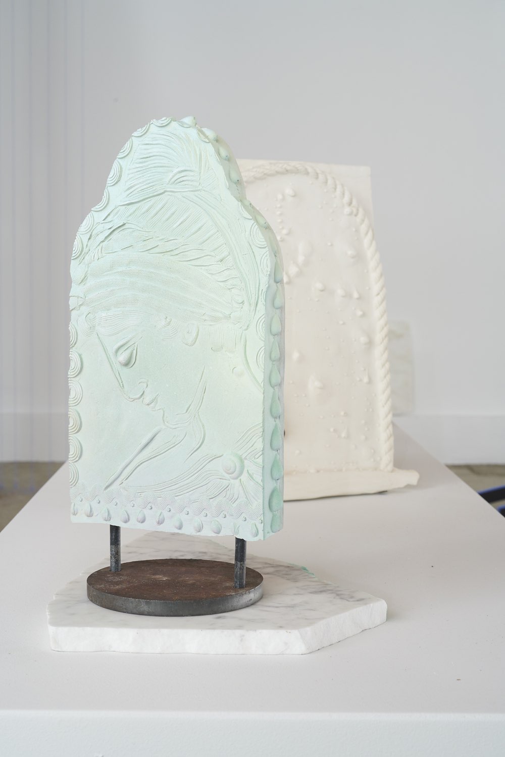 Forever separated, forever attached, 2019, Acrylic on Panel, Acrylic and Flashe on Hydrocal, Epoxy Clay, Hardware, 60 x 46 x 3 in. Offering, 2019, Acrylic on Panel Hydocal, Epoxy Clay, Hardware, Marble and Plexiglass, 63.25 x 46 x 3 in. 19. Echo, 2019, Pigmented Drystone, 18.5 x 15 x .5 in. (Outside)