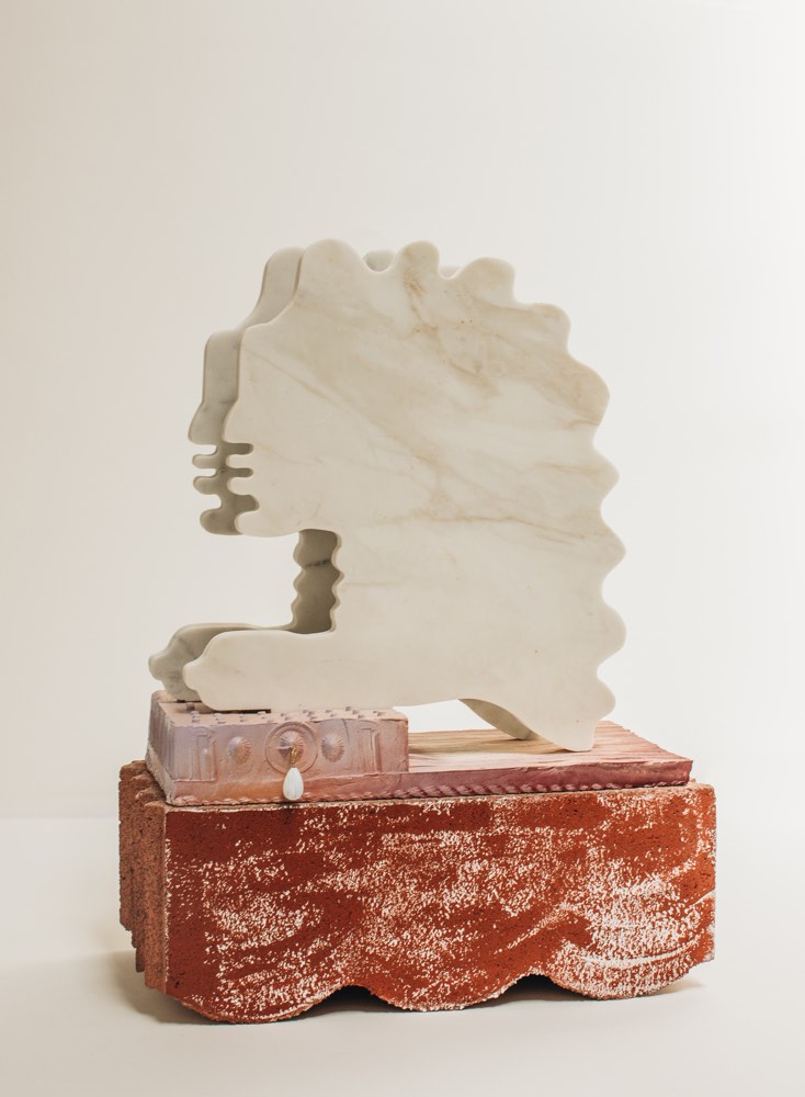 Herma, 2019, Marble, drystone, acrylic, metal fishing weights, wire, brick, 22 x 16.5 x 8 in. Forever separated, forever attached, 2019, Acrylic on Panel, Acrylic and Flashe on Hydrocal, Epoxy Clay, Hardware, 60 x 46 x 3 in.