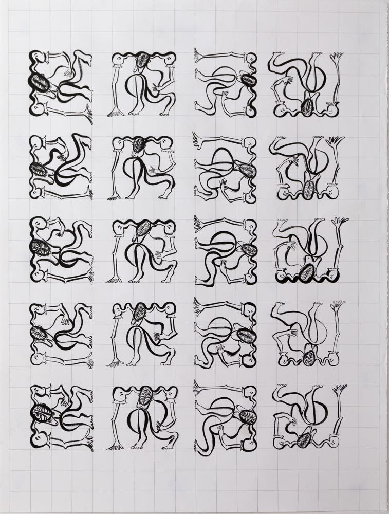 Handwriting Bows, 2019, Ink and colored pencil on paper, 38 x 50 in. Janus Flounder, 2019, Ink and flashe on paper, 30 x 22 in.