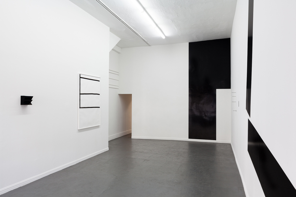 The sculptural works, while certainly evoking the traditions of Minimalism with their use of industrial aluminum and unitary geometry, in conversation with the drawings and site-specific space explorations, provoke another reading. A fractional sequence of metal parts, swaths of wallpaper, tethered shoelaces, and raw ink markings—ordinary, human gestures whose loose, irregular, asymmetrical, monochrome lines convey a sense of random assemblage. Free of boundaries, the streaks and shapes float in vast areas of untouched space as though waiting.