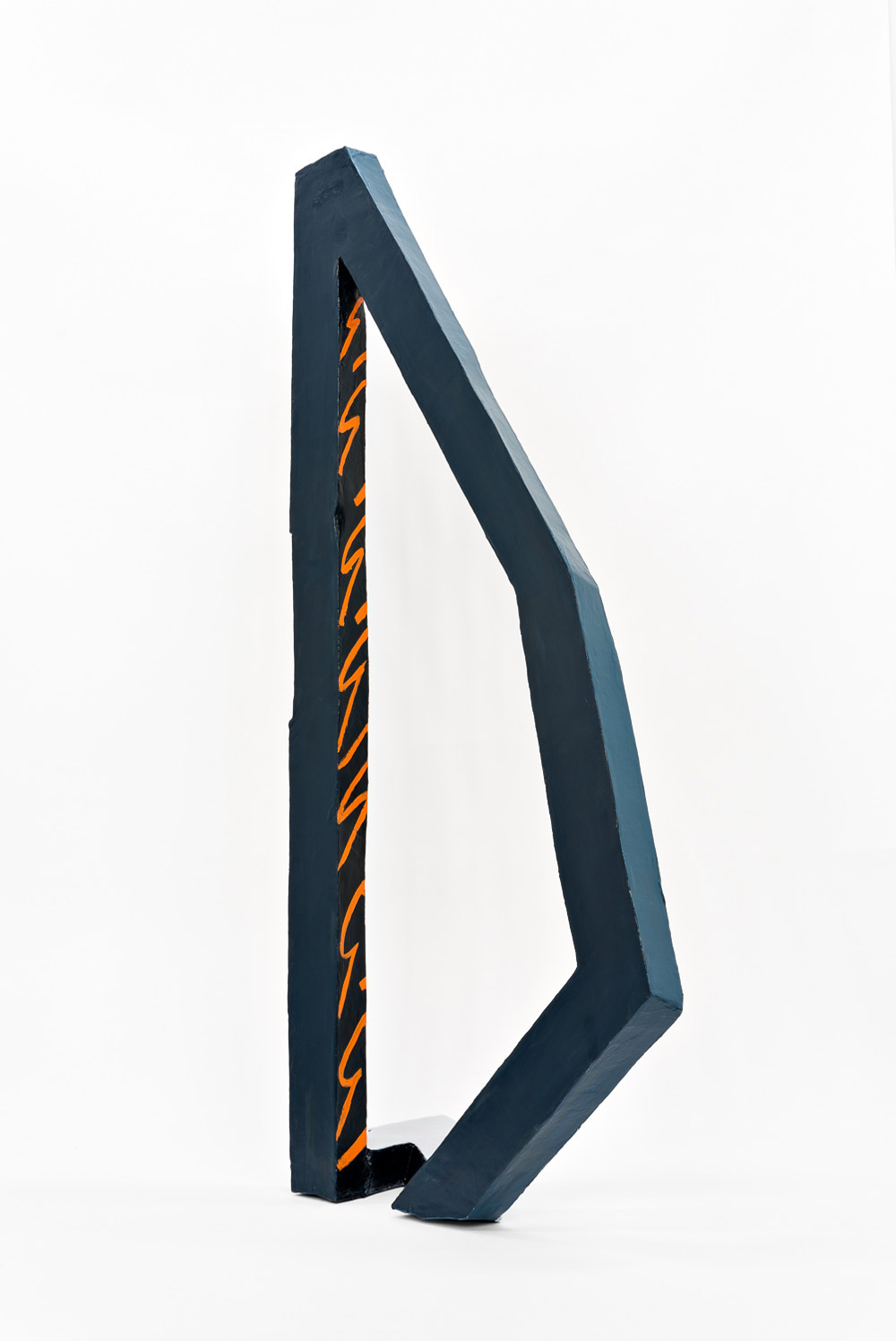 Goldstein’s paintings depict imagined structures and spaces that push the boundary between abstraction and traces of the familiar. Each painting relies on and creates its own internal logic. Ignoring laws of gravity and perspective, Goldstein’s paintings portray structures that could only exist within the world of a painting – the perspective is warped, the figure and ground constantly flip and the structure appears to simultaneously hold together and fall apart. In contrast, the sculptures – as if plucked from the paintings into real time and space, are beholden to the natural world of physics, reliant on gravity and an actualized physicality.