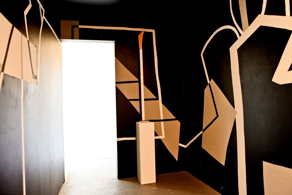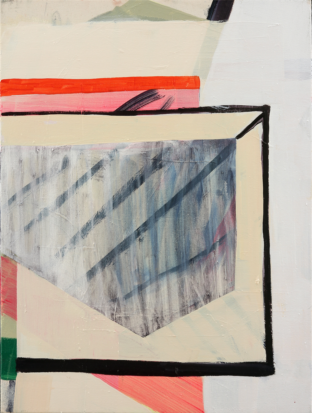 In this recent suite of paintings for Passenger, re-occurring elements suggest a loose, open-ended narrative of a mysterious figure that is at once present yet absent/hiding in all of the work. The canvas becomes a stage upon which the painterly fragments and symbols theatrically perform. The paintings draw on various art historical themes, including the Cubist still life, the avant-garde theater set, Op art, and geometric abstraction. Elements of everyday surroundings – parts of architecture, the living world, and human form – intersect with art historical references, creating forms that blur the lines between categories.