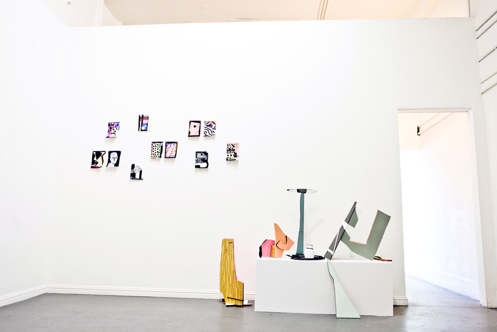 Rebekah Goldstein’s paintings depict imagined structures, spaces and characters that obscure the boundary between representation and abstraction. She synthesizes imagery from her immediate surroundings: patterns found on clothing, succulents and palm trees, the human figure and architectural tableaus she builds in studio. She considers the paintings a staging of fragments, akin to collaging. The fragments are generated by an iterative process of translating forms and images between large paintings, small paintings, and sculptural forms. What was once recognizable becomes increasingly ambiguous, idiosyncratic and part of her own pictorial language. The three dimensional tableaus, made out of wood, ceramics and paint, inform how she shapes foreground and background in the two dimensional paintings. Moving back and forth between bodies of work and media, the shapes, symbols and colors are expressed as characters appearing across multiple paintings.