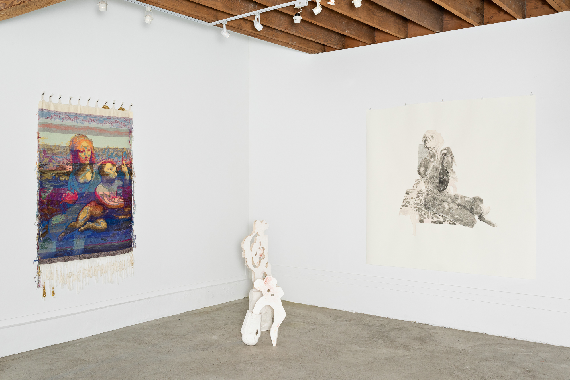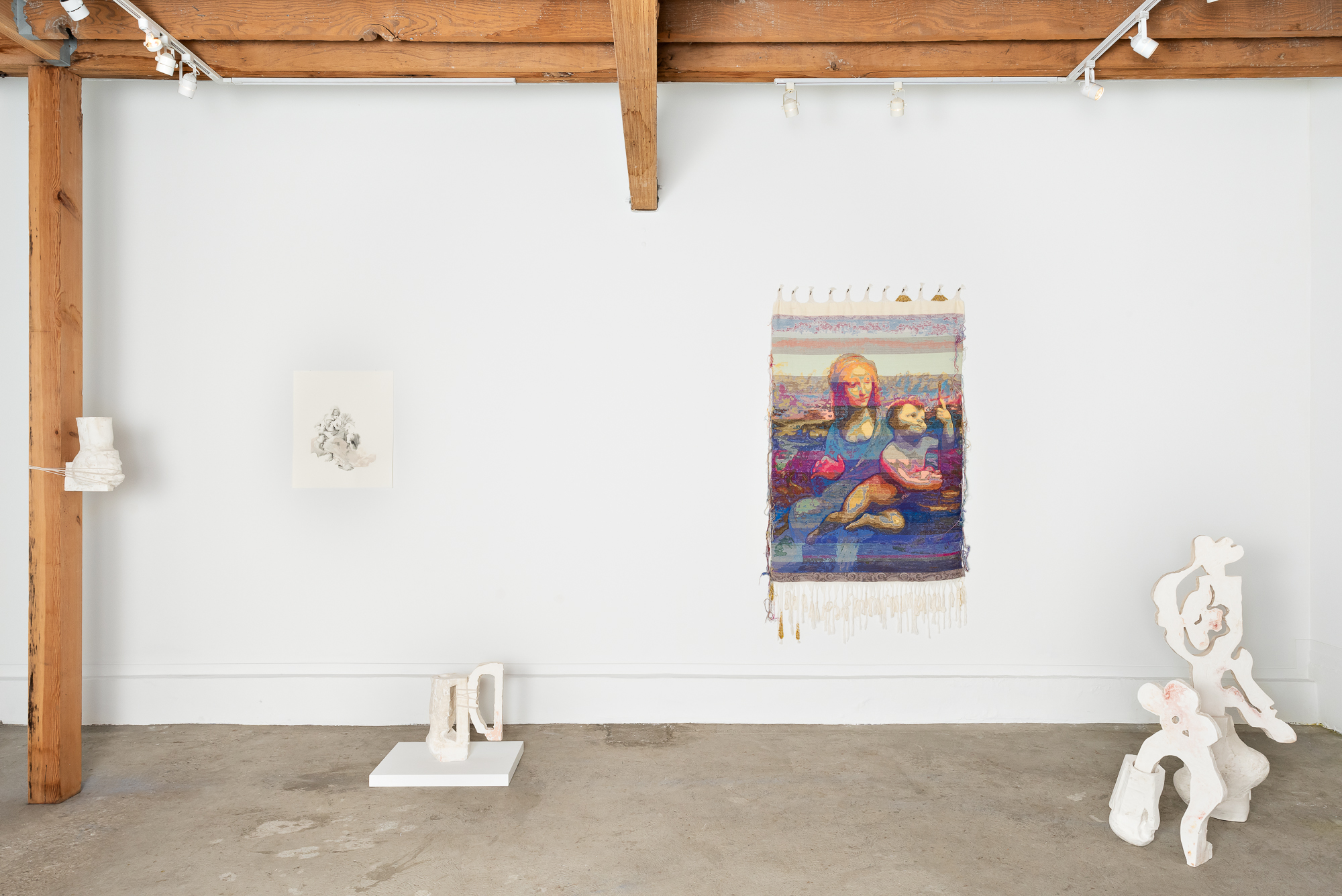 Referencing the history of tapestry and its relationship to religious and devotional iconography, John Paul Morabito reimagines this historical practice by weaving queerness into the tapestry template. By repositioning both the medium and its subject matter, Morabito conflates the sacred to create a new, more inclusive mystical plane. Similarly seeking to create a widening expanse in historical narratives, Yetunde Olagbaju threads multiple mediums in their video work to address the fantastical intersection of time travel and ancestral lineage. Through an examination of nonlinear time, Olagbaju’s recent work is about myth and its transformation into effigy and eventual commodity to illuminate myth legends or folklore surrounding Black people and their labor.