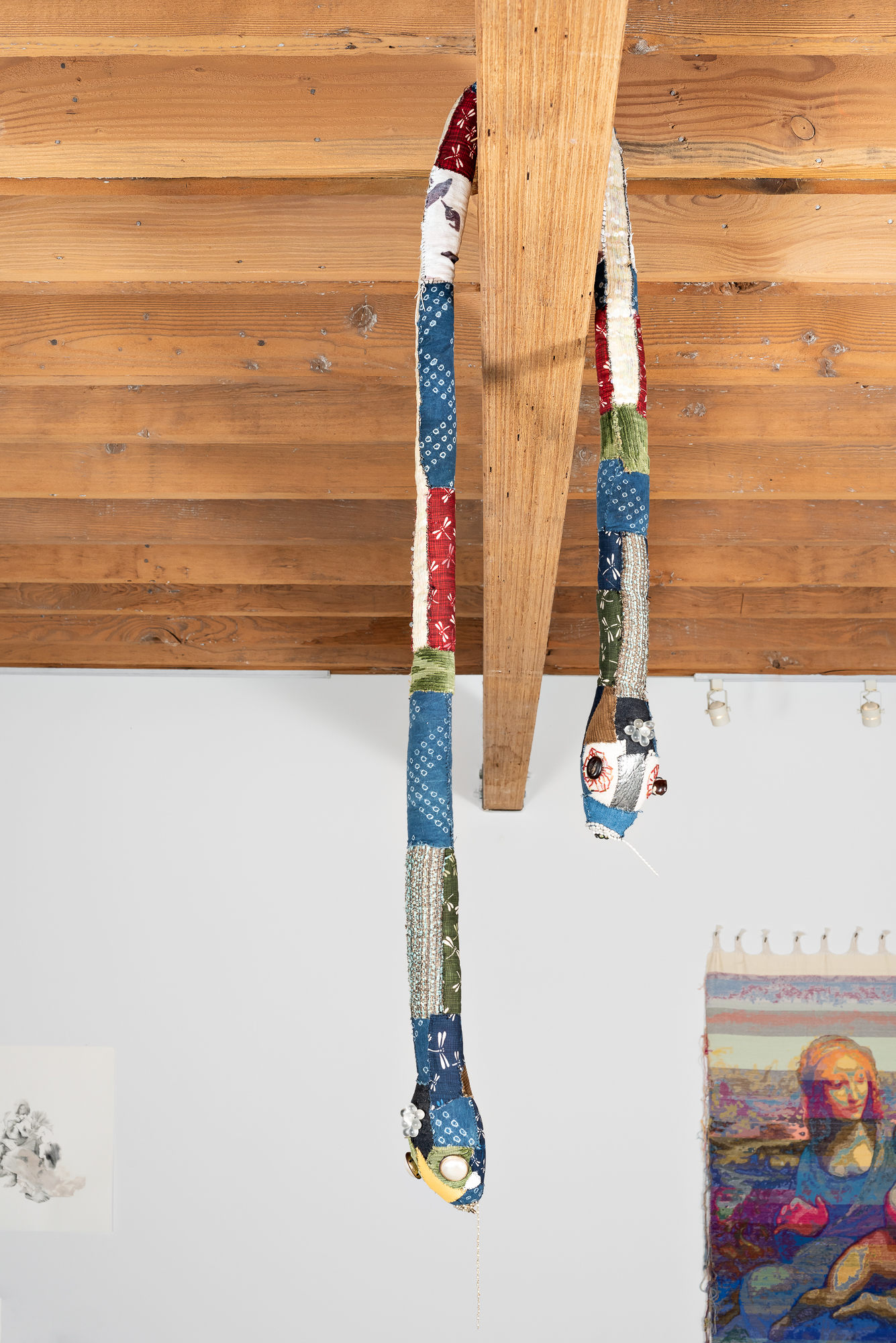 Dana Harel, originally trained as an architect uses the human body and psyche to explore the human relationship to memory and psychological impact on the body. Combining image transfer, drawing, and sculptural work, she alludes to the delicate balance of corporal resonance and restraint. Also using the built environment as a genesis for creation, Llane Alexis’ work is informed by his childhood experience living amid political strife alongside lifelong concerns about textile industry pollution. Through a unique sequence of braiding, weaving, and hand-sewing techniques, he transforms off-cut, unwanted fabric scraps into objects that serve as relics of an industry fraught with social complications, imbuing these discarded objects with new life.