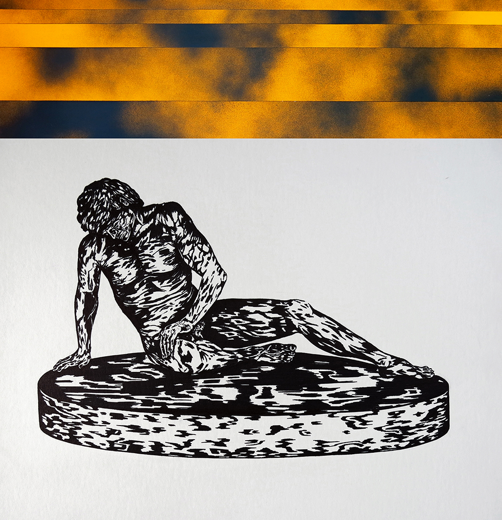 GALATA MORENTE, Ballpoint on card stock, gyclee print, spraypaint on poster board, 20.5 x 22.5 inches, 2013