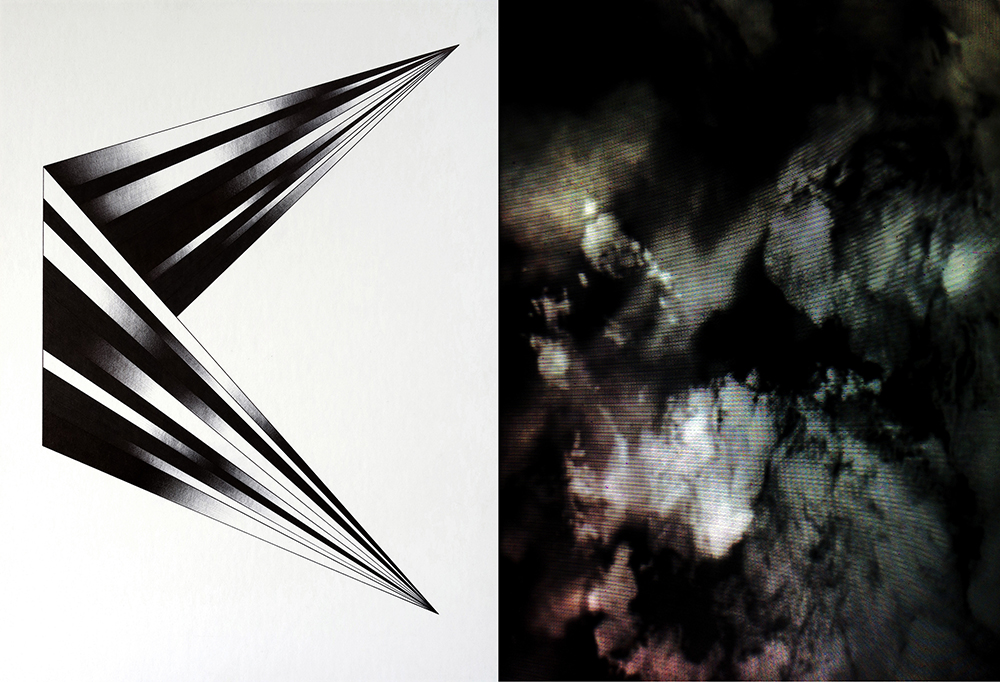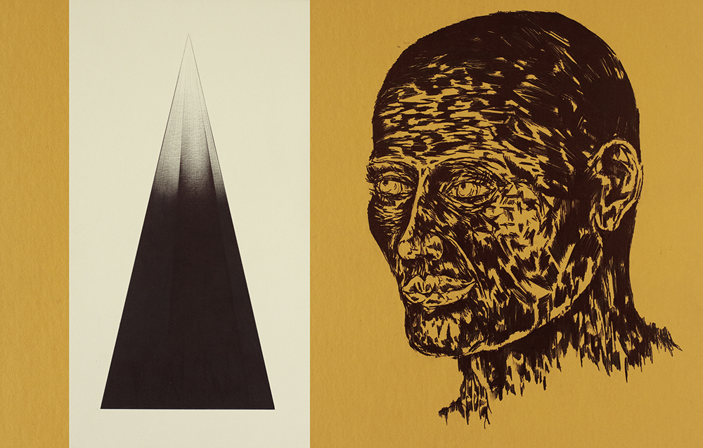 Untitled "Columns", Ballpoint on card stock / Collage spraypaint on posterboard / Found print, 43 x42 inches, 2013