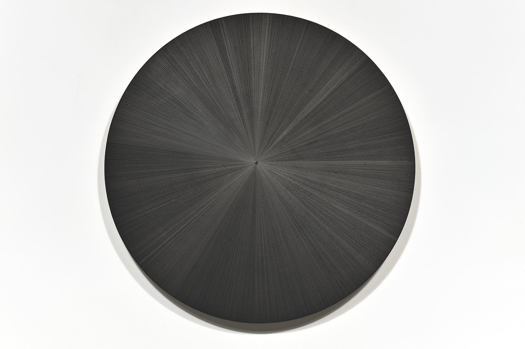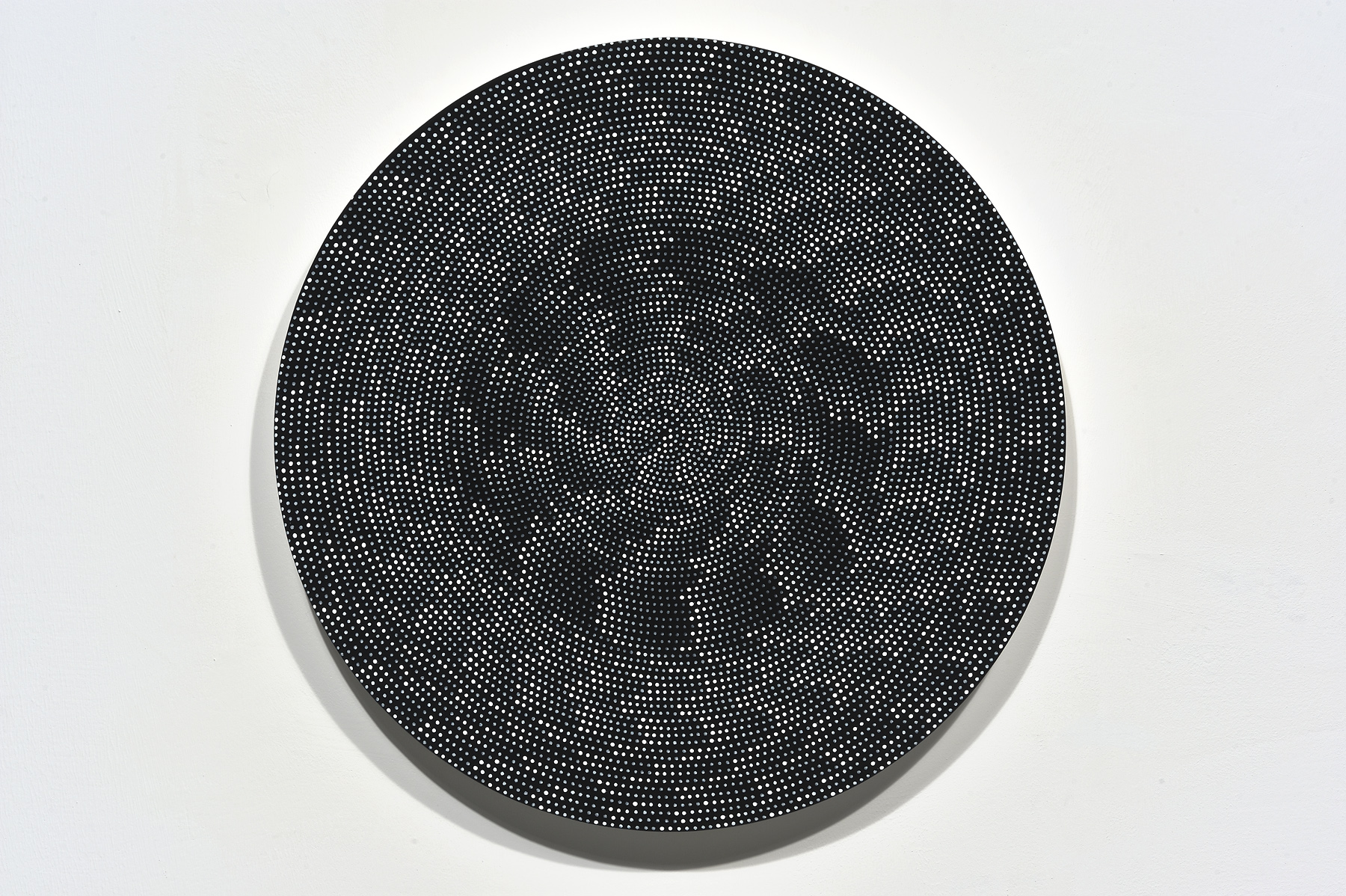 Untitled (dot tondo), Flash and black gesso on canvas, 30 inch-diameter, 2014