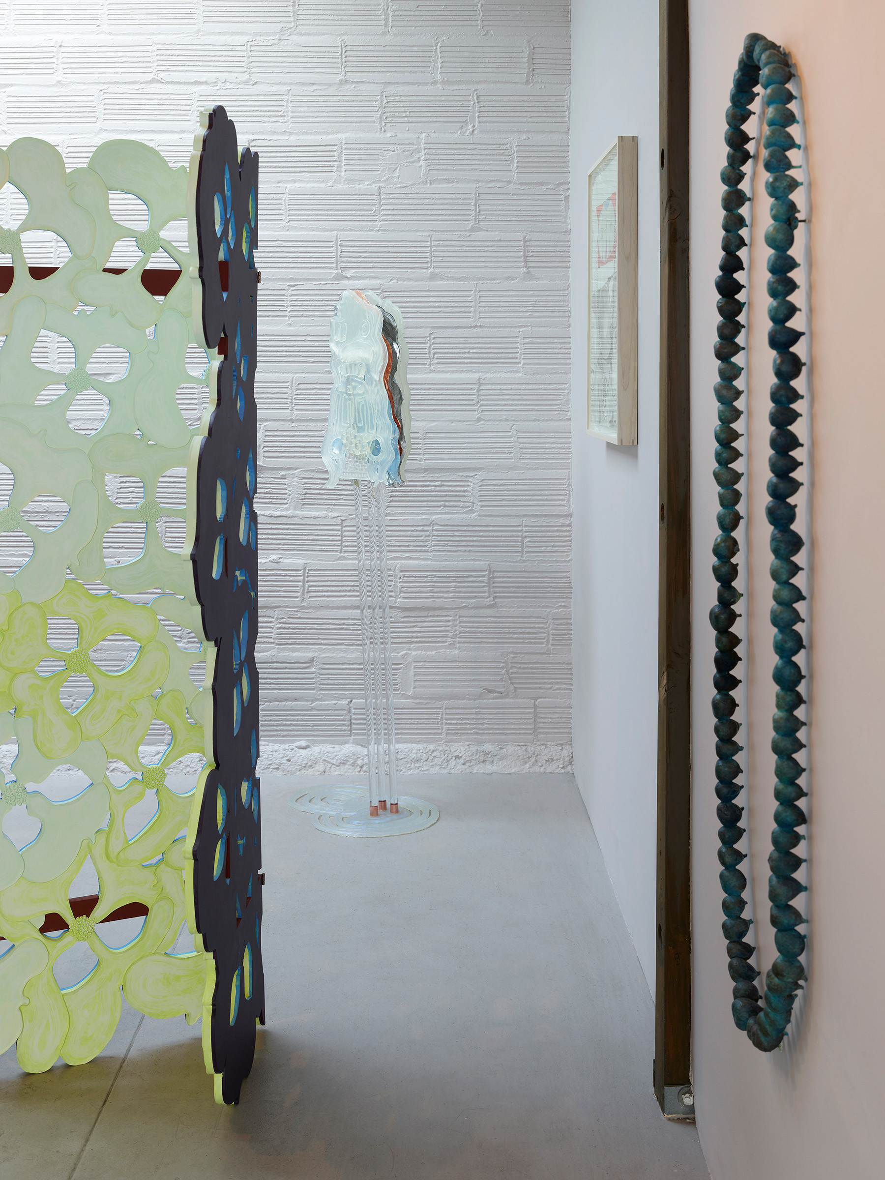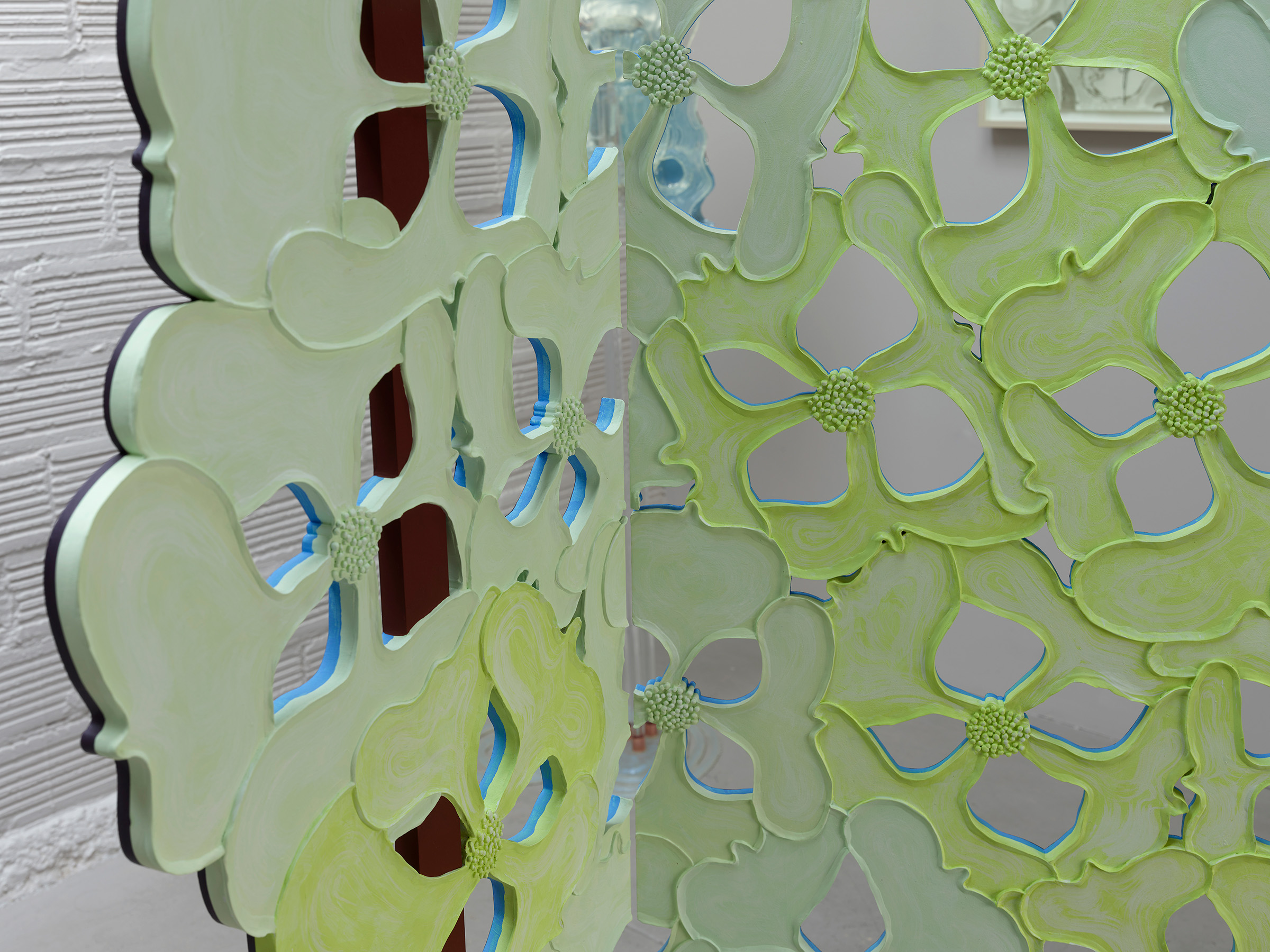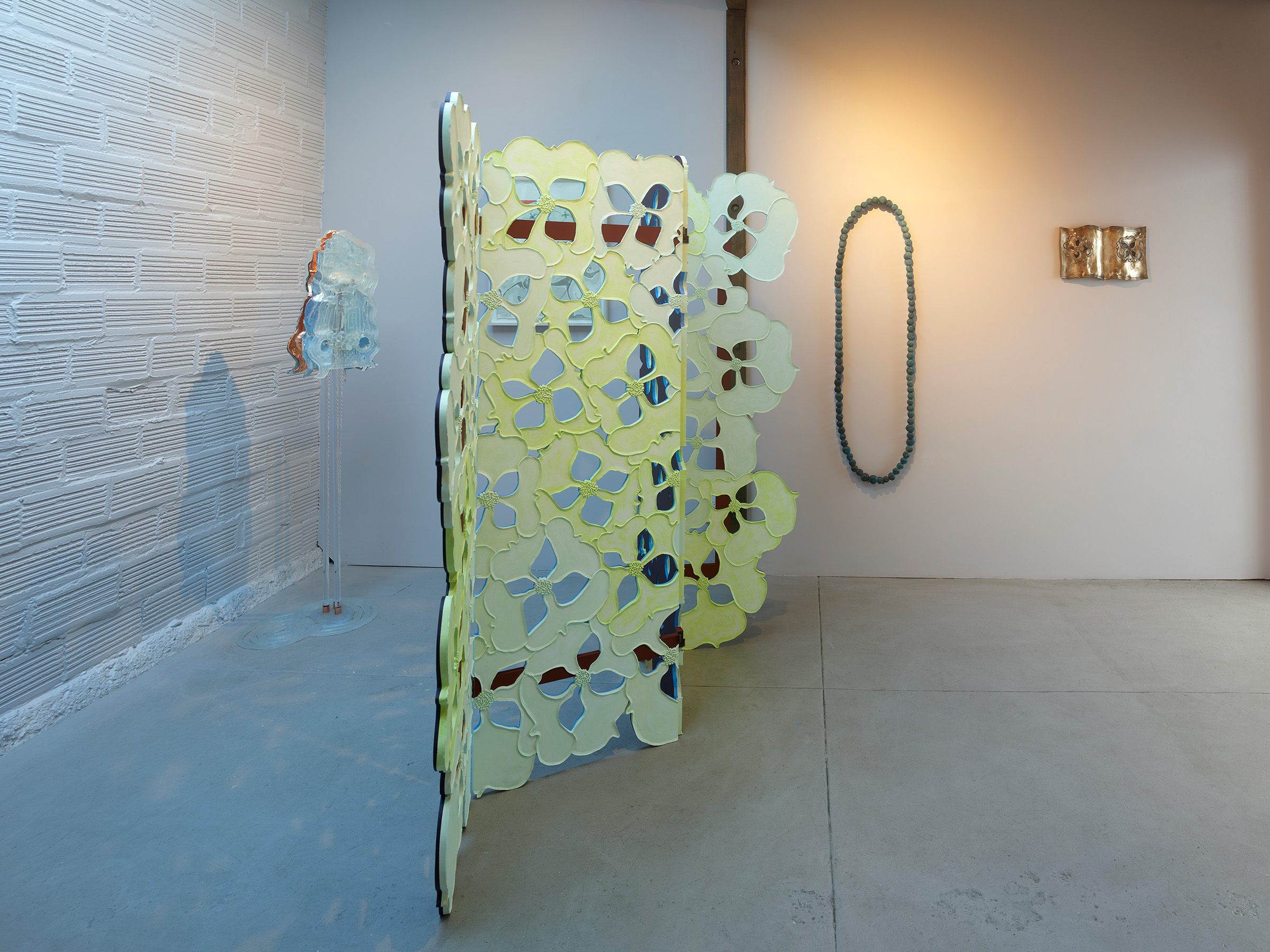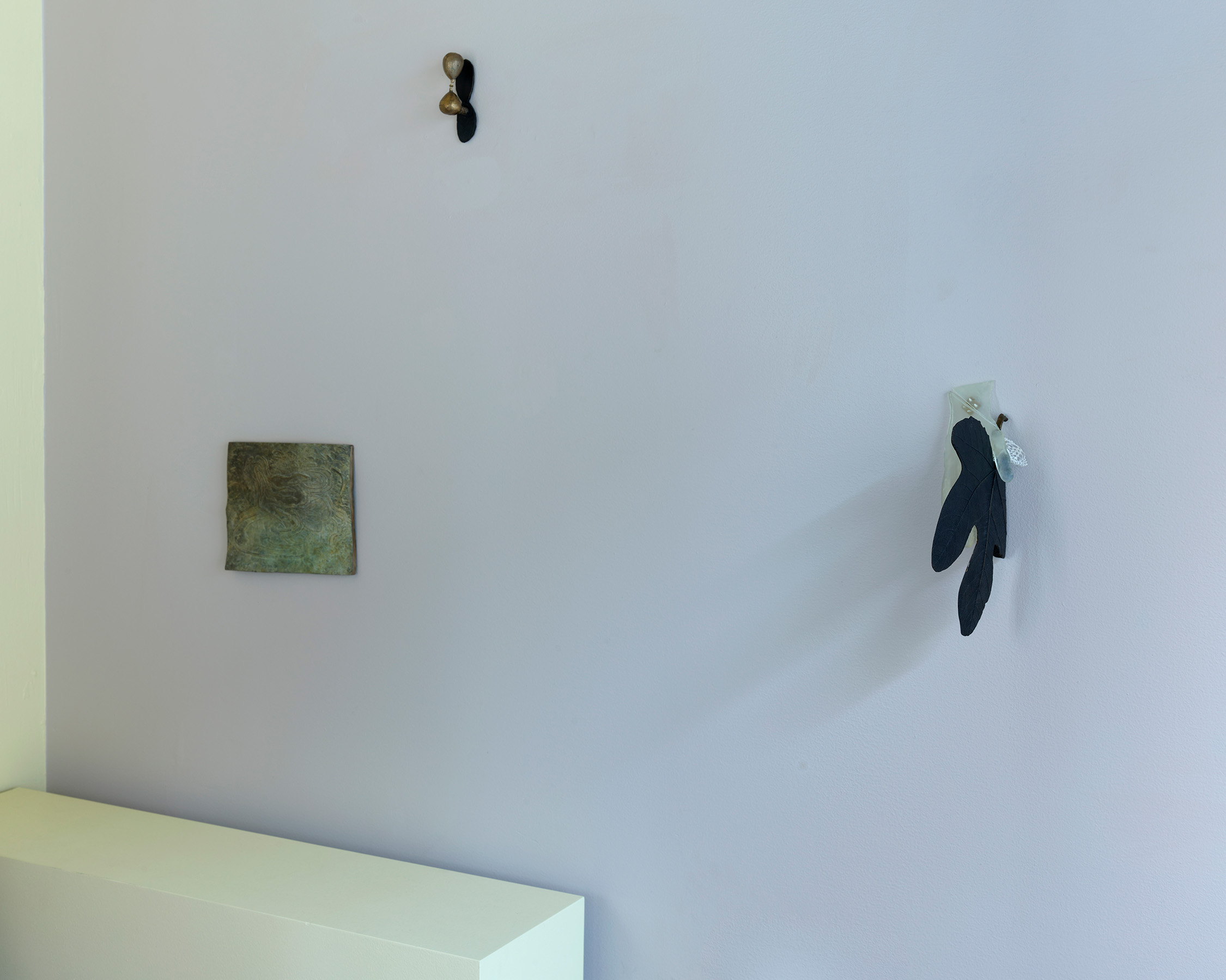 There is a doubling running throughout–objects that Nathan collects appear as themselves in one instance, and act as catalysts to build from in the next. For instance, a crocheted doily from her mother-in-law’s house is clasped between a translucent resin handprint and a bronze fig leaf in Shaking, 2024. Its lacy interlocking shapes are echoed in the room divider titled Tangle like a bramble, like a rose, 2024. Nathan notes that in her intention to codify a way to draw a dogwood blossom, the outer edge of each petal reads like a bracket. Typographically, brackets establish limits and assign order. The artist notes that in the drawings and note-taking in her sketchbook, she uses a single bracket to encompass ideas and point forward to her next thought. Incidentally, etymologically, ‘bracket’ contains ‘crochet,’ a double support in wood, also a stitch in cloth. Which is to say that words and images contain ghosts in their peripheral vision, and are perhaps still pointing us to metaphorical relationships between the body and the processes we use to enclose, encapsulate and clothe it.