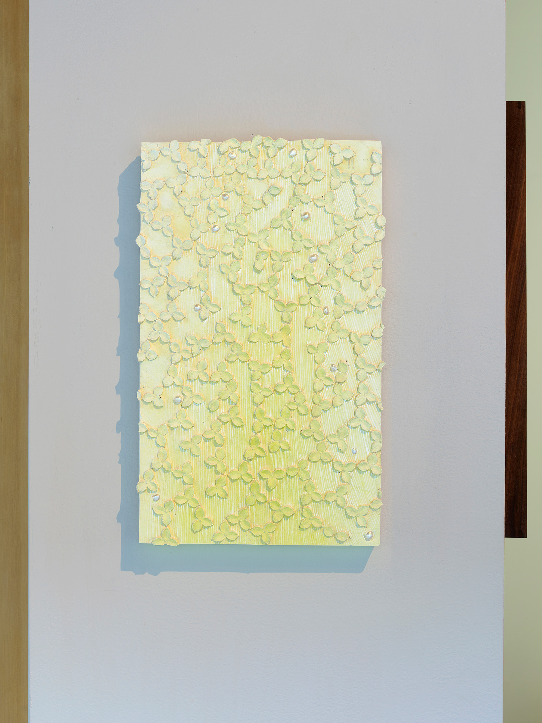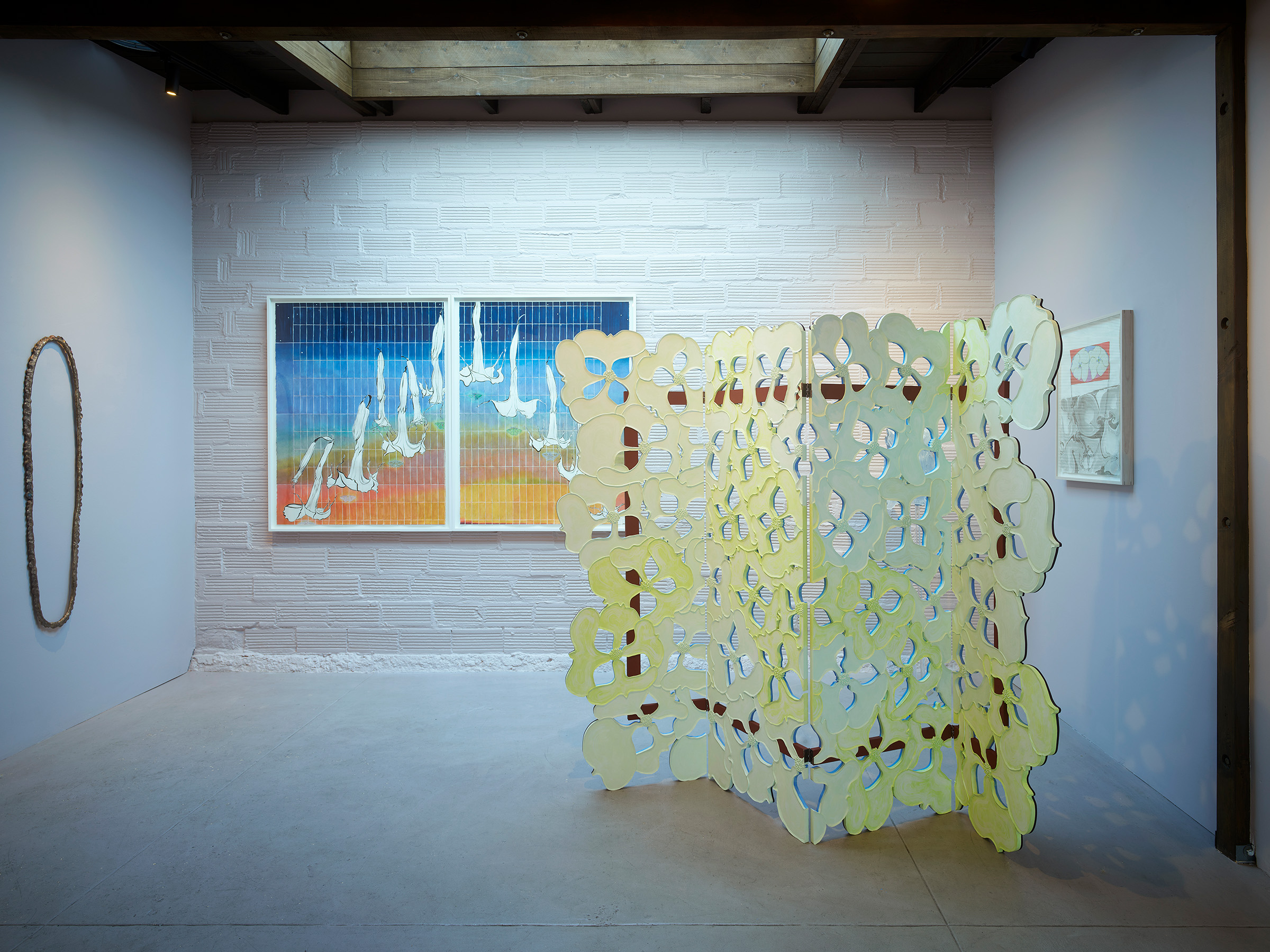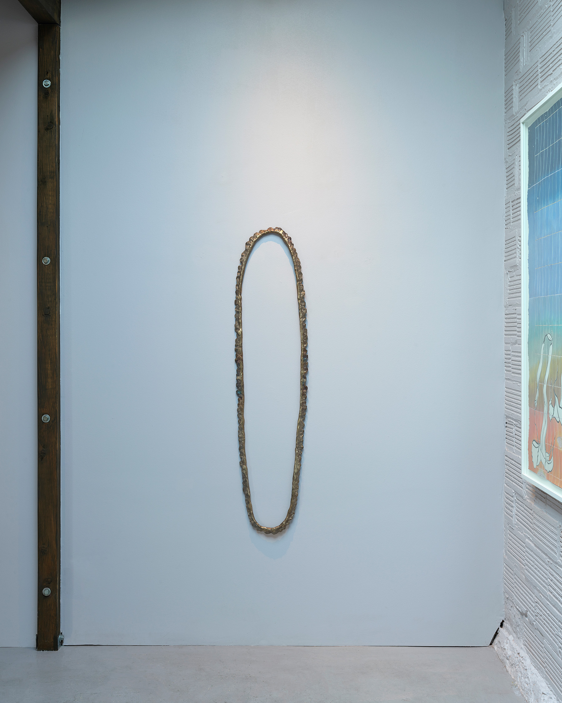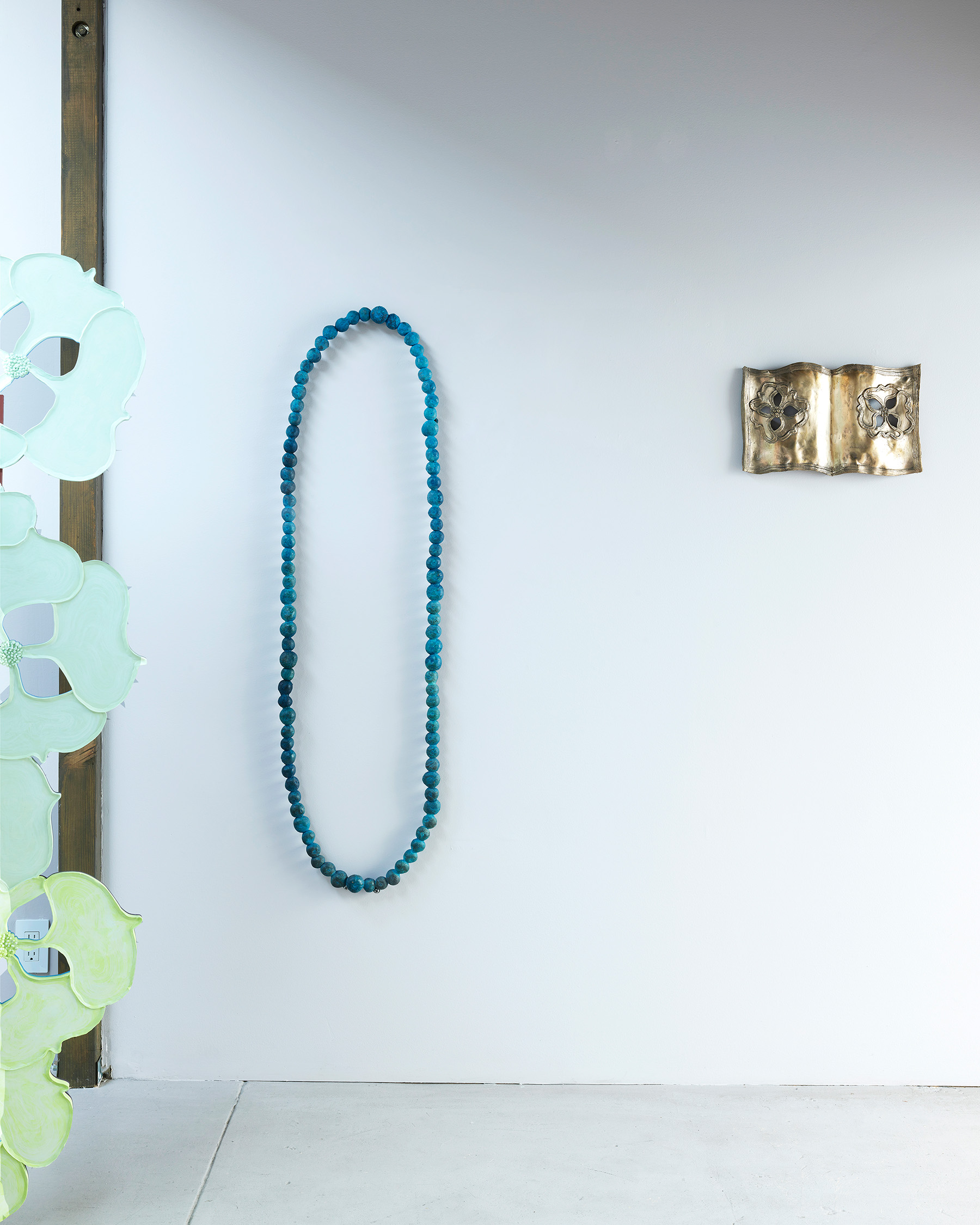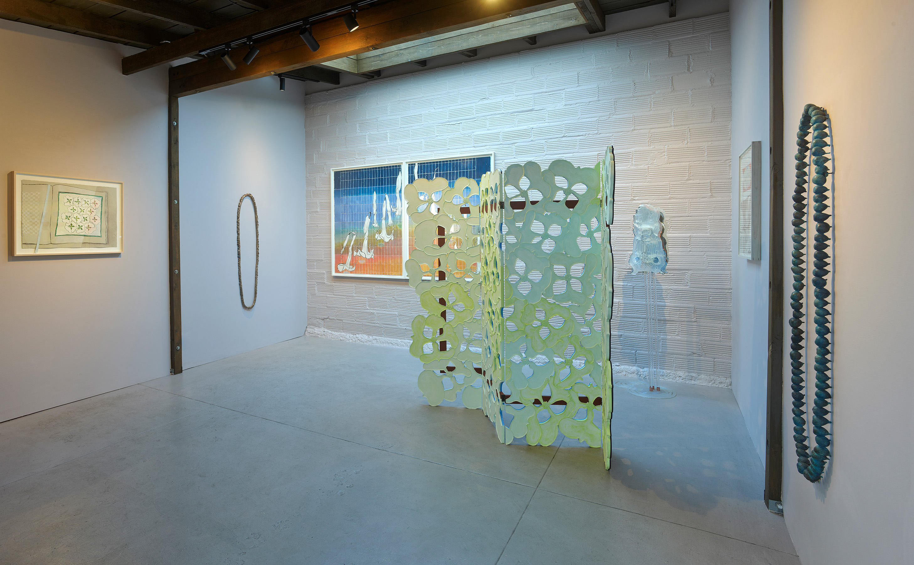 There is a doubling running throughout–objects that Nathan collects appear as themselves in one instance, and act as catalysts to build from in the next. For instance, a crocheted doily from her mother-in-law’s house is clasped between a translucent resin handprint and a bronze fig leaf in Shaking, 2024. Its lacy interlocking shapes are echoed in the room divider titled Tangle like a bramble, like a rose, 2024. Nathan notes that in her intention to codify a way to draw a dogwood blossom, the outer edge of each petal reads like a bracket. Typographically, brackets establish limits and assign order. The artist notes that in the drawings and note-taking in her sketchbook, she uses a single bracket to encompass ideas and point forward to her next thought. Incidentally, etymologically, ‘bracket’ contains ‘crochet,’ a double support in wood, also a stitch in cloth. Which is to say that words and images contain ghosts in their peripheral vision, and are perhaps still pointing us to metaphorical relationships between the body and the processes we use to enclose, encapsulate and clothe it.
