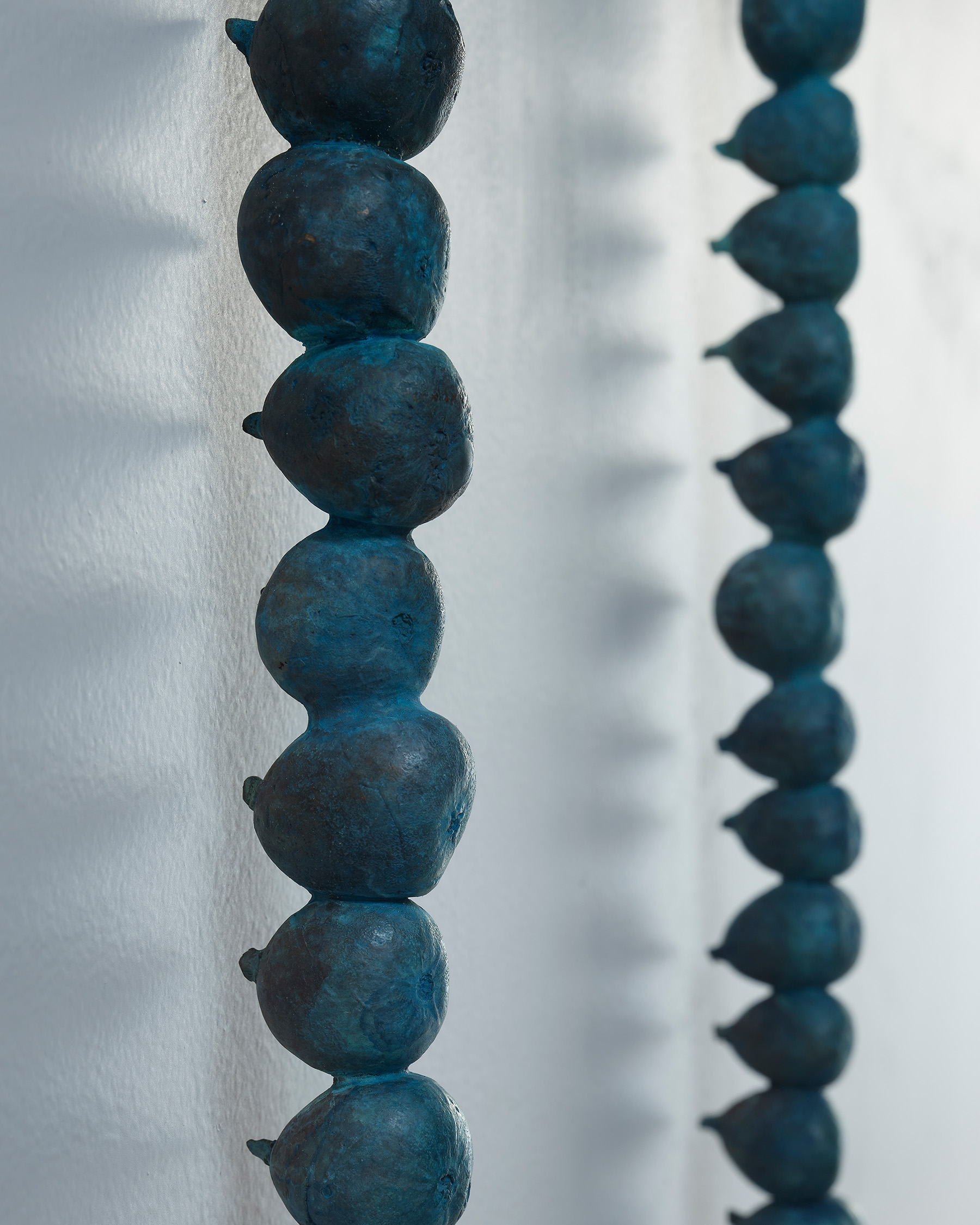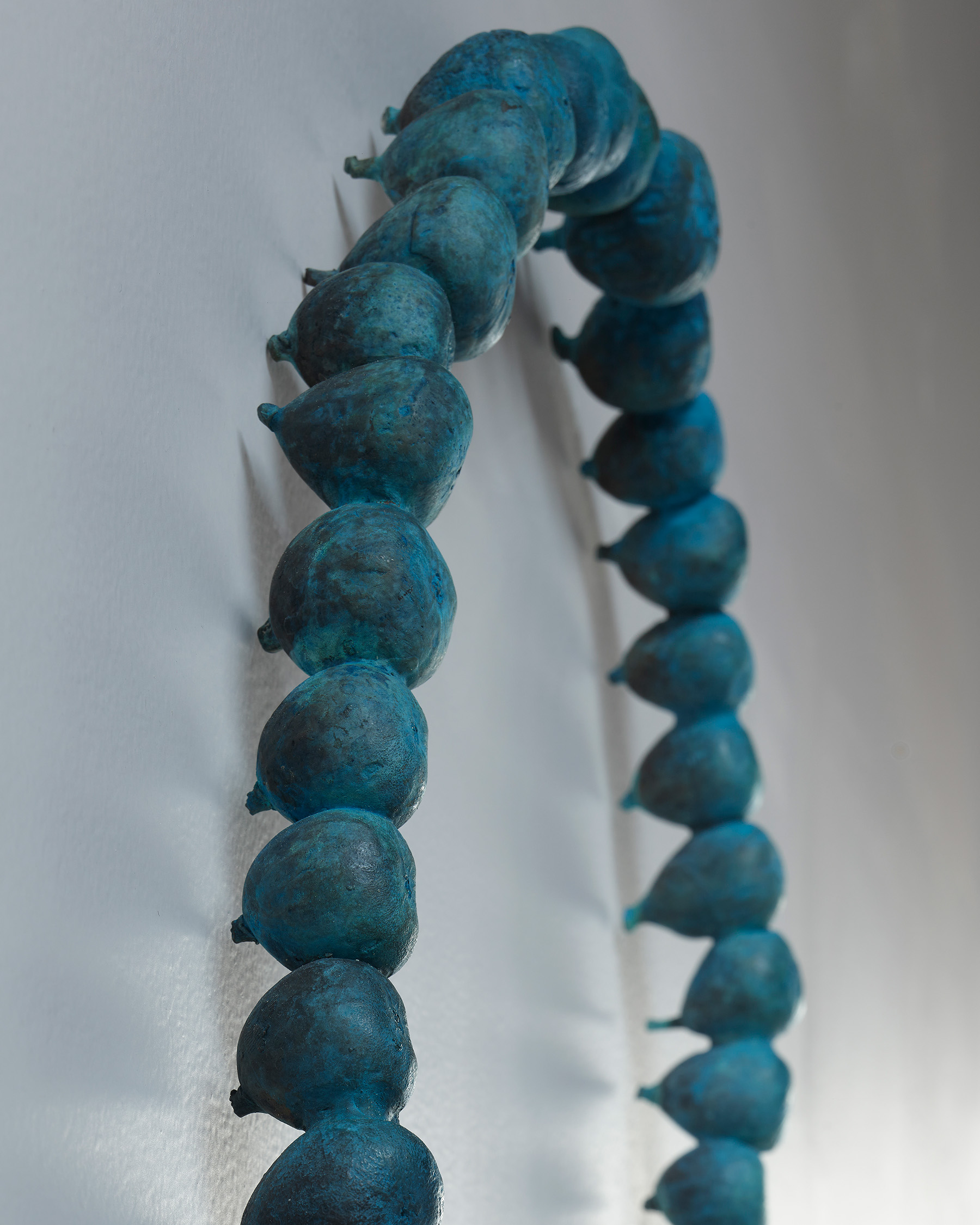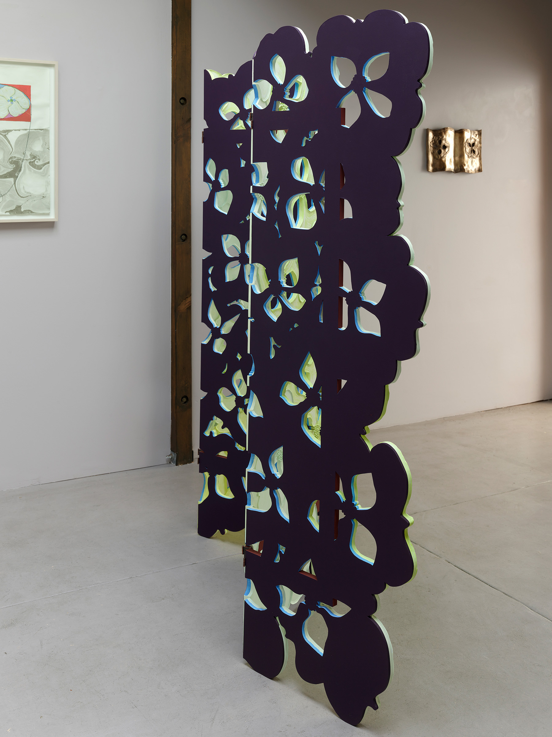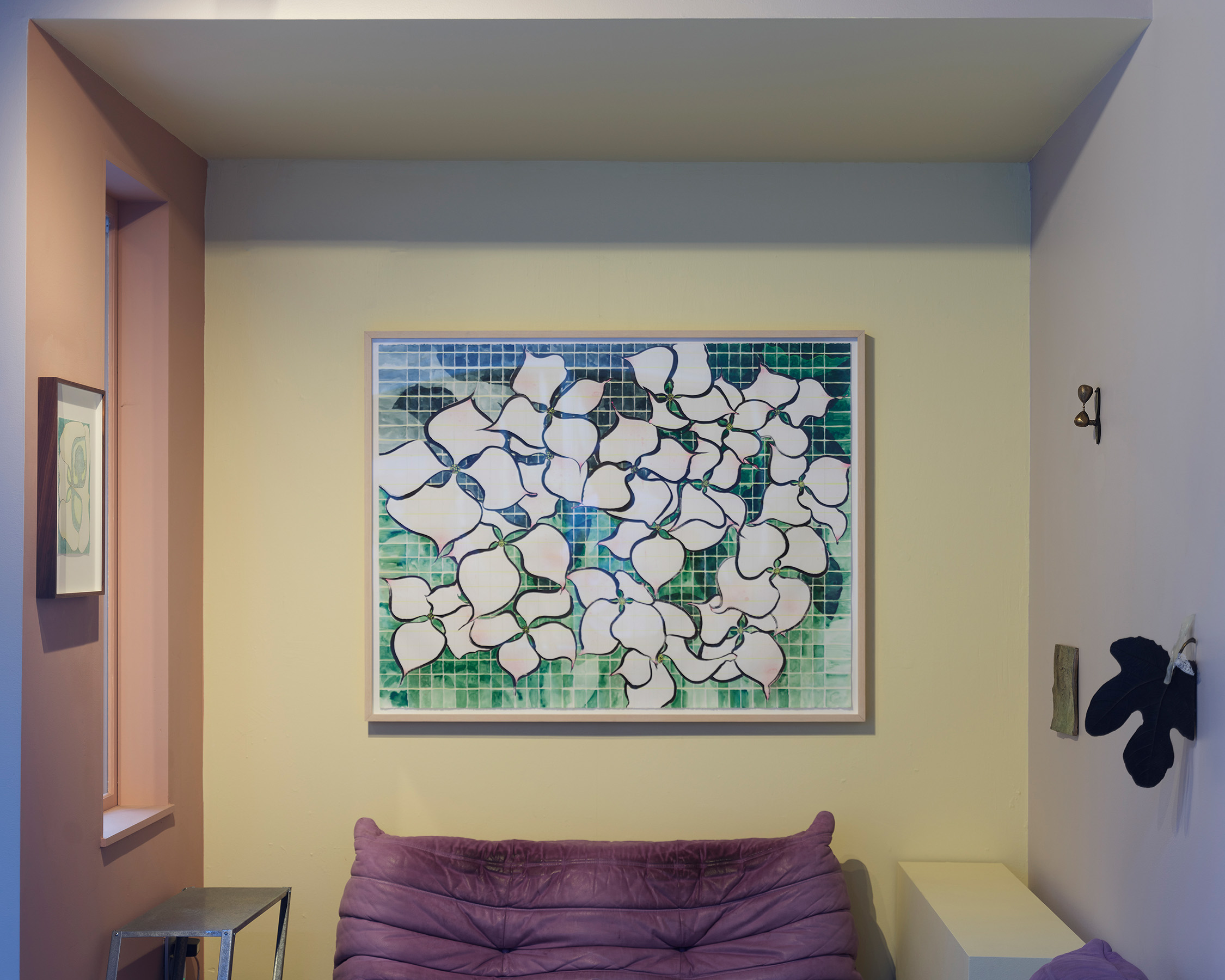 Nathan’s garden is built of form, sustenance, fragrance, and hydration. In this current body of work, her recurring theme of metamorphosis unfolds as theatrical floriculture, and a place for the body to ruminate on change. The folklorically fabled dogwood is lingered over, its quatrefoil inflorescence a form that includes an internal aperture and an external undulation. These petals are emphasized through repetition and move throughout the exhibition, translated in versatile form–from bronze, to wood, to watercolor–ultimately framing, fragmenting, and flexing. Nathan relates the dogwood’s heraldry to the compass or the four winds, and notes its usefulness, such as its bark as a bulwark against fire and as a medicinal healer. Nathan also returns to her depiction of the fig, its pointed swell echoing a water droplet and evoking deep history–the human connection to hospitality, sweetness, sensuality, which she casts in bronze and repeats many times, creating a portal of joined talismans in To see what is in motion you must move, 2024.