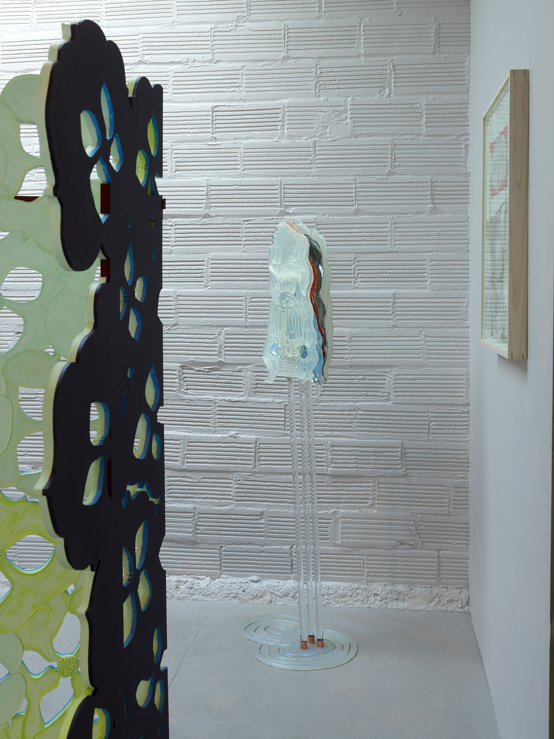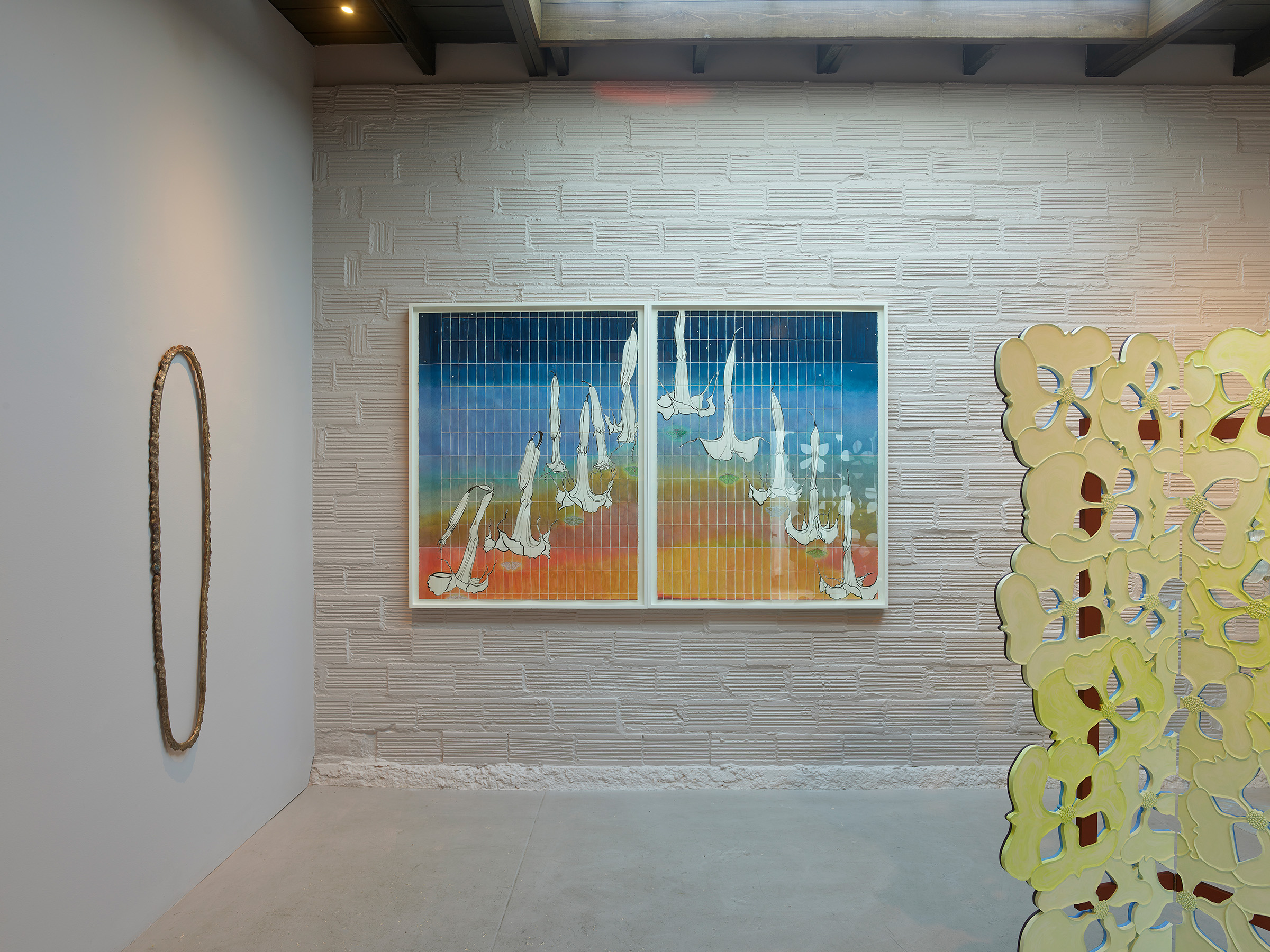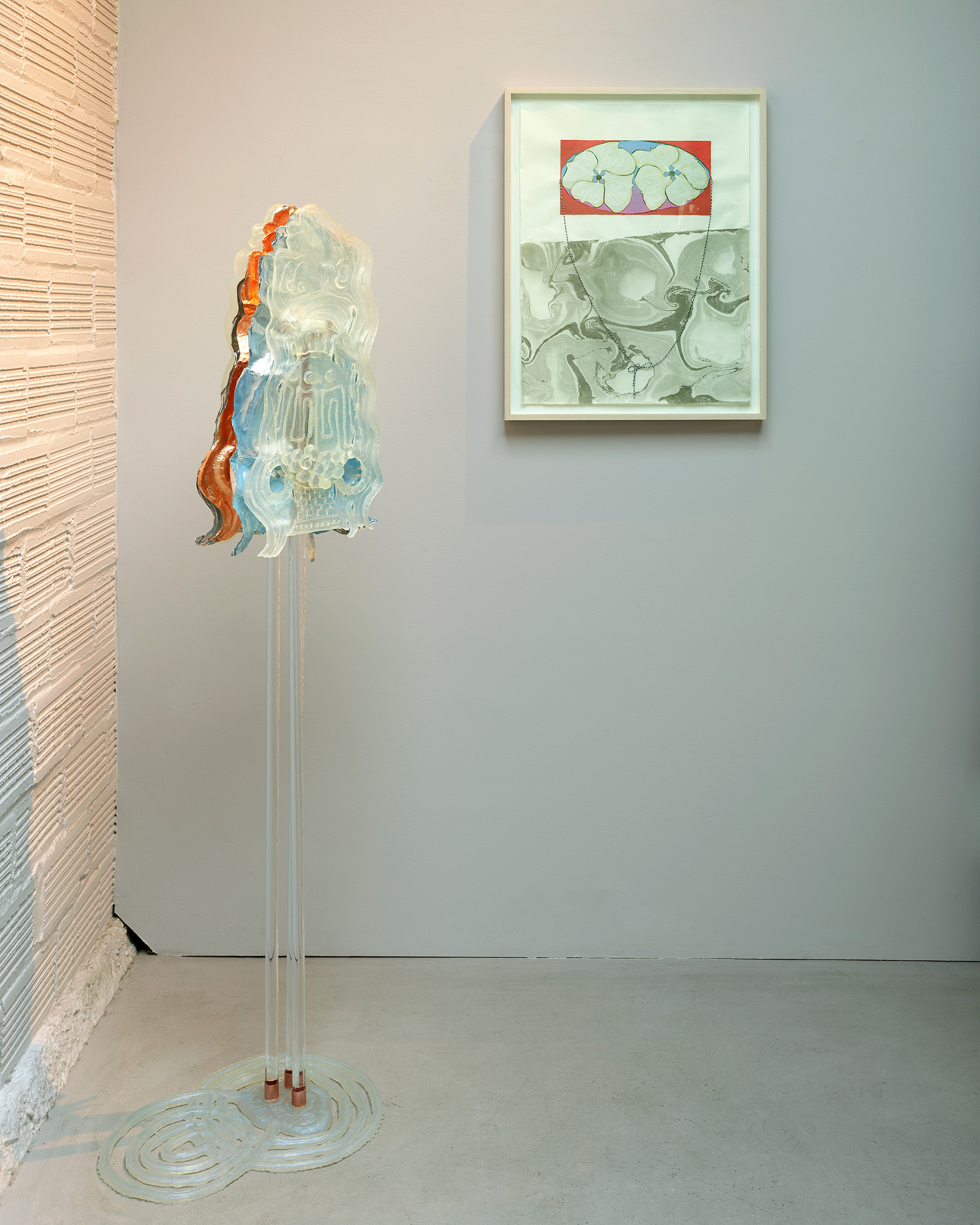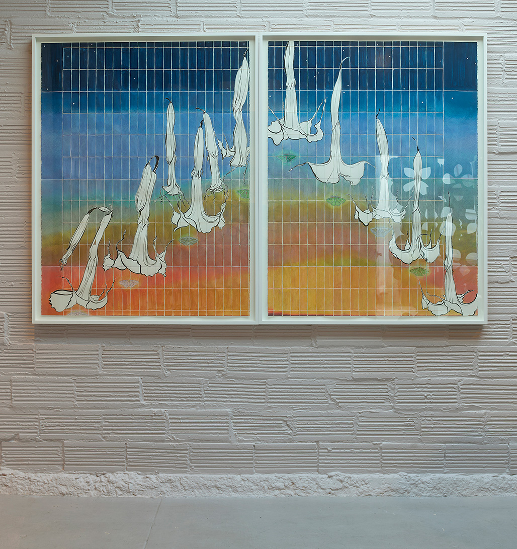 In the dusk-lit diptych Volta, 2024, Nathan depicts an arc of floating Brugmansia on a gridded ombre-washed background from sunset tones to a deep-night indigo hue. These ‘angel’s trumpets’ swaying bells emit a deeply sweet scent to draw in pollinating moths at night, an intoxicating aroma that while alluring for humans alike, can be highly poisonous. This motion of a trumpet’s form: funneling in while pushing out, is akin to the circular movement of a fountain, a regular feature in a garden or park. For the sculpture The tipping up from flat was gradual, you must assume, 2024, Nathan has fabricated a vertical fountain-like form of resin, marble, plexiglass, and crystal depicting an inverted head—a recurring cartoon self-portrait—whose balancing act has gone awry: the water vessel upended and spilling forth. Here, the cycling water of a fountain suggests the ever-changing composition of a woman’s body through the hormonal shifts of puberty, pregnancy, and menopause. Ripples form as the water hits the surface, creating a hieroglyph of liquid, movement and time.
