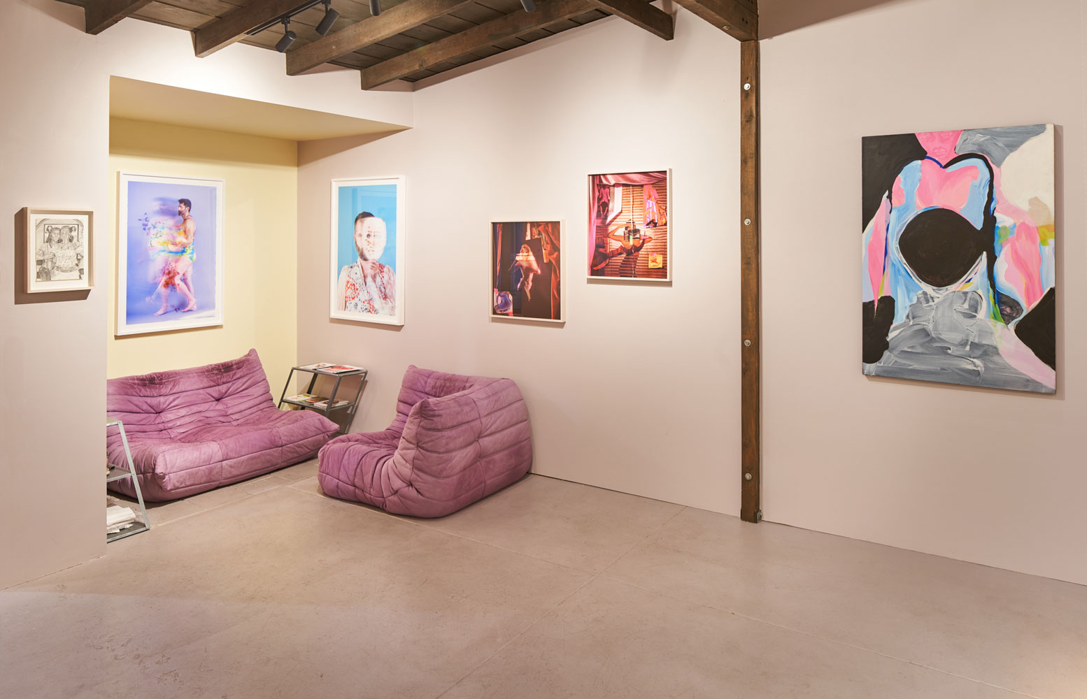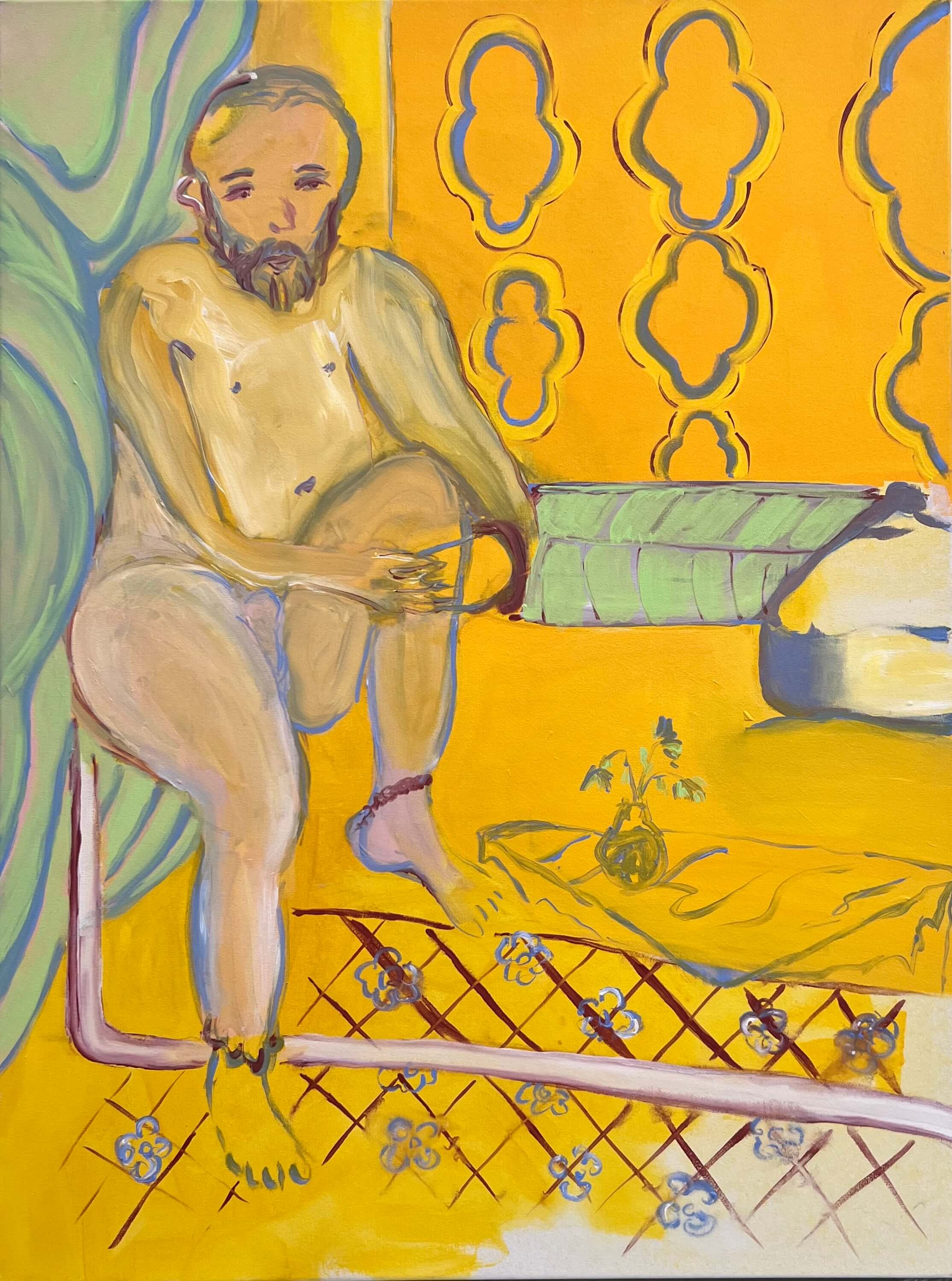 Raised in an authoritarian regime under government control and oppression, Iran-born, Los Angeles-based artist Shagha Ariannia examines the contrast between public and private behavior, and the desires quieted by societal norms. Ariannia’s paintings in Gaze Interrupted engage questions of vulnerability, doubt, desire, shame, love and awkwardness. In her recent series, and as depicted in the work Antony Sitting with Flowers, 2022, Ariannia uses her lover as a muse, shaping an auto-fictional narrative reminiscent of Orientalist paintings of the 19th century. Ariannia paints her subject in classical odalisque poses, inserting her agency over this history, and inverting the Western art historical master/muse power structure.