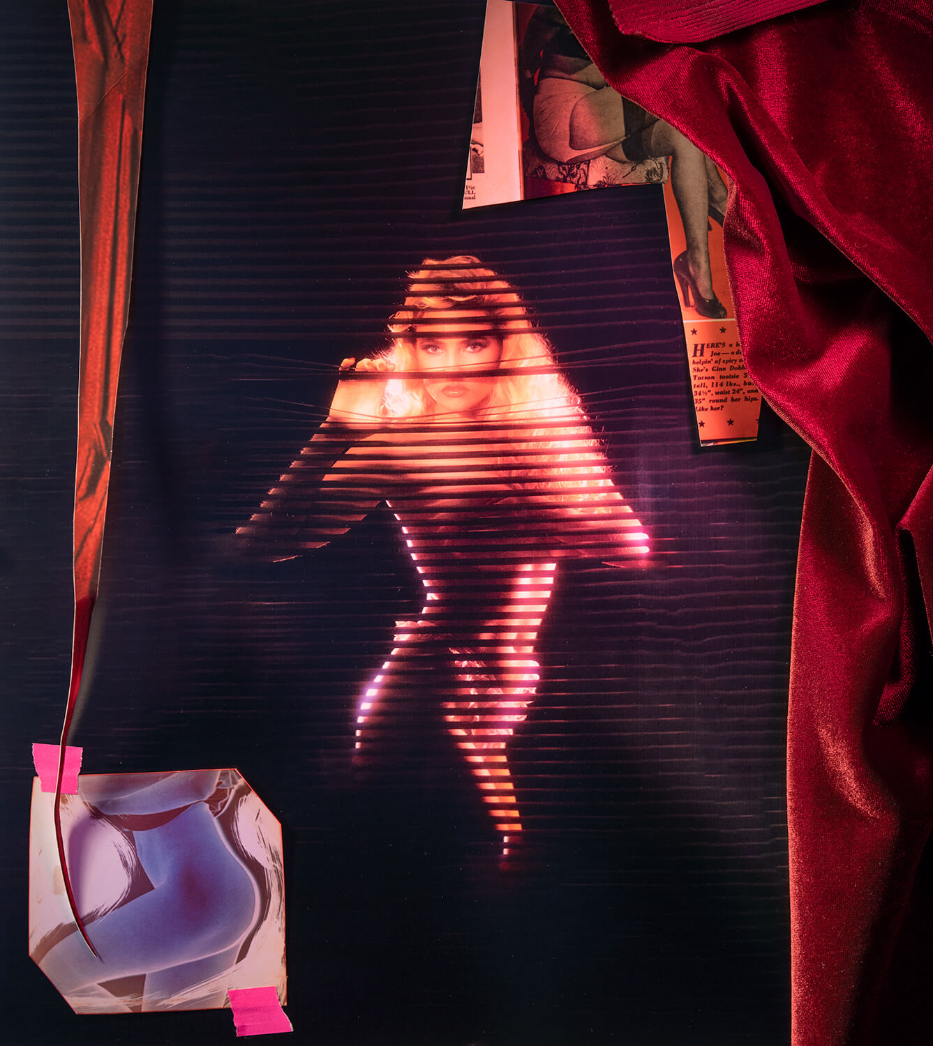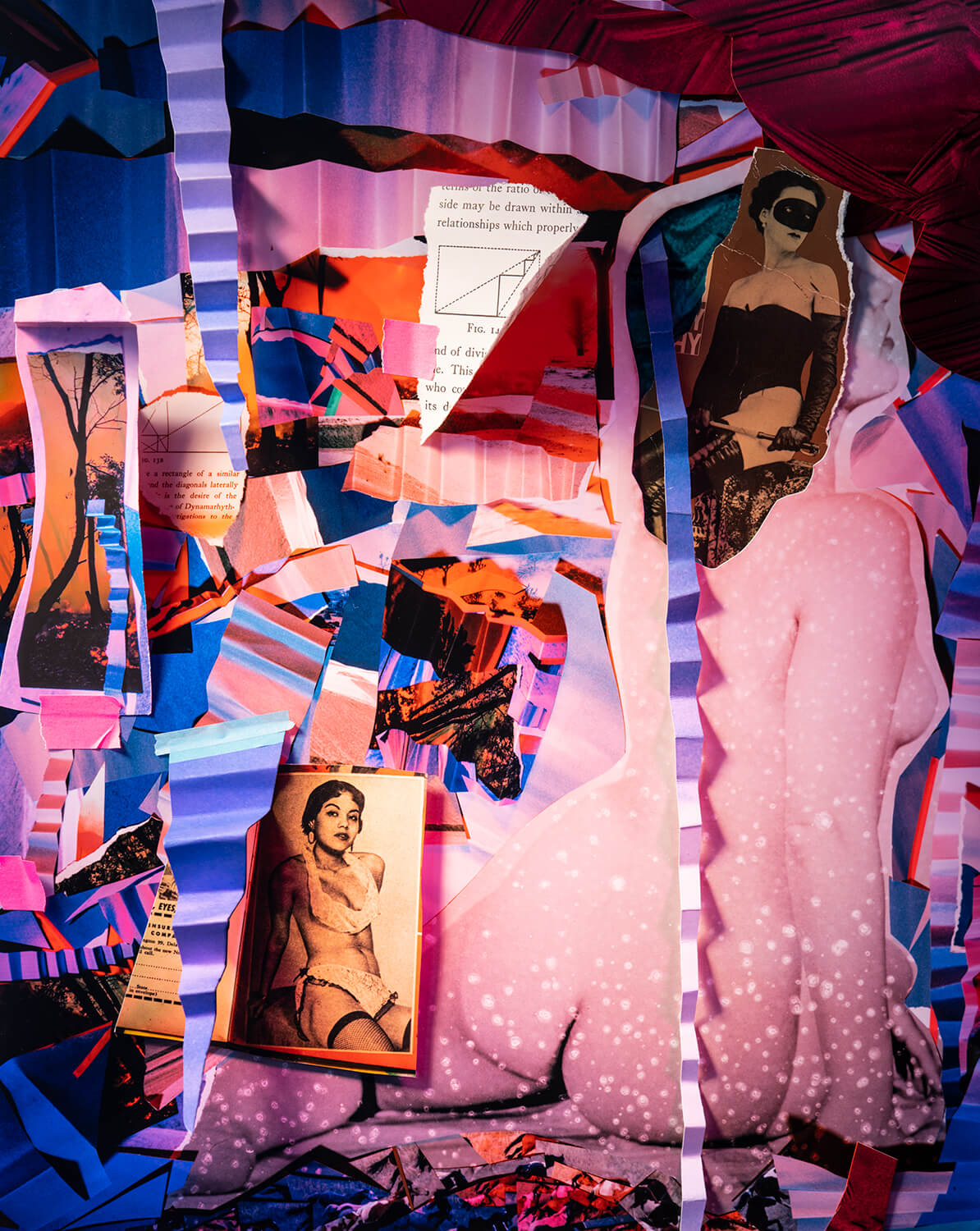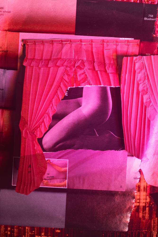 San Francisco born (and New York-based) artist Sarah Palmer explores a varied terrain of human vulnerability through her collaging, photographing and re-photographing. Palmer composes these layered, textural vignettes sourced from photographic diagrams of the body, rape-prevention manuals, historical photographs of dance, Sears catalogs, and found amateur erotic photographs, resulting in a centering of the feminine figure within surreal and reimagined contexts. Here, bodies are chaotically juxtaposed with textures of rugs, clenched fists, and heavy baroque drapery, calling into question the act of looking, and of hiding.
