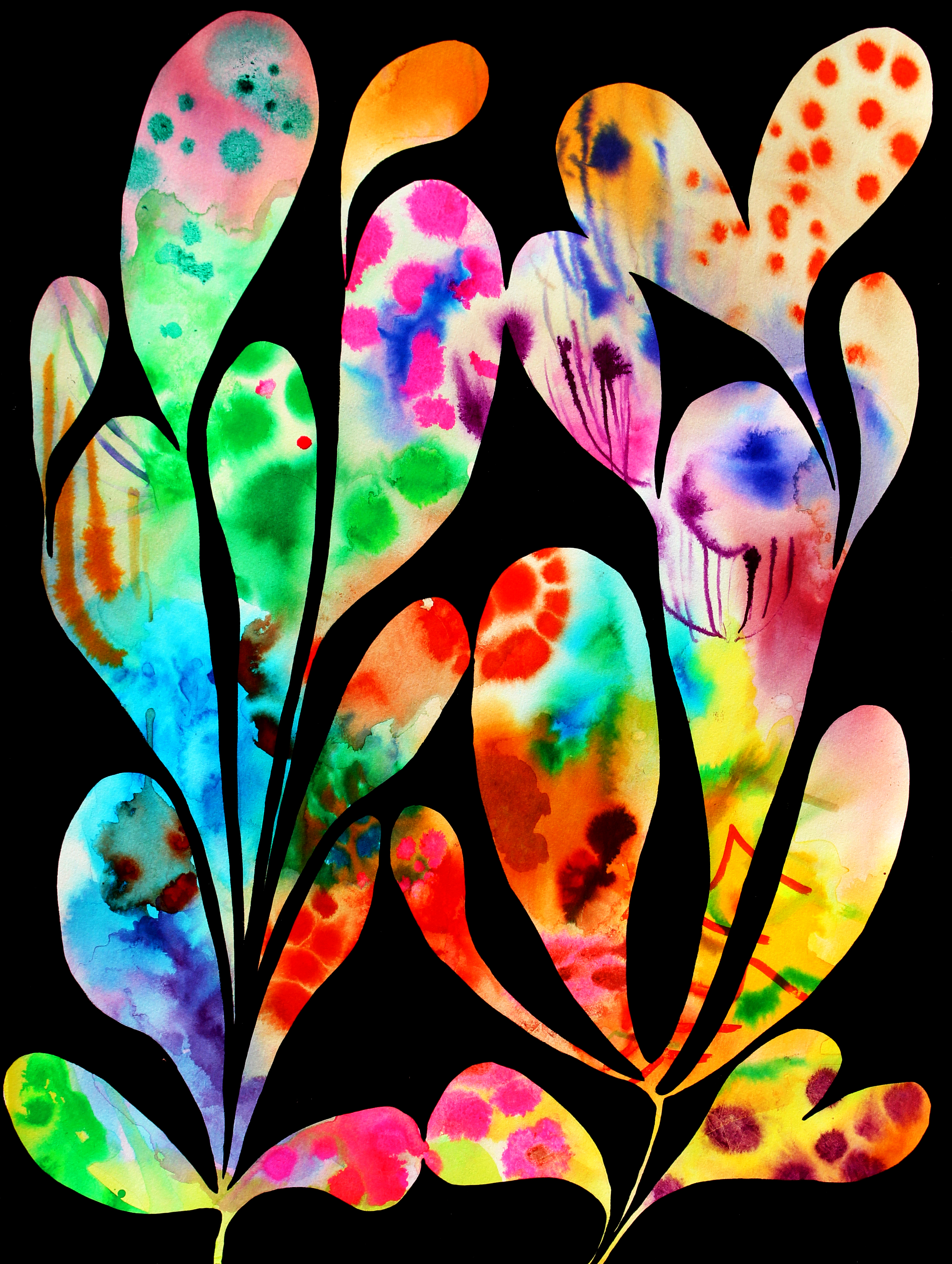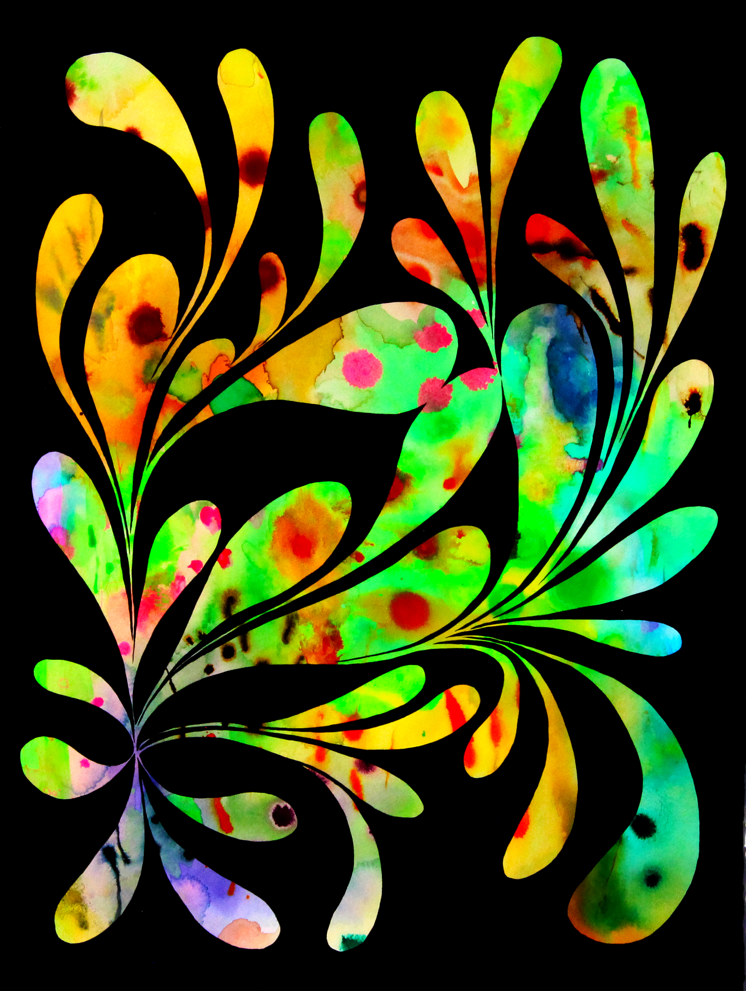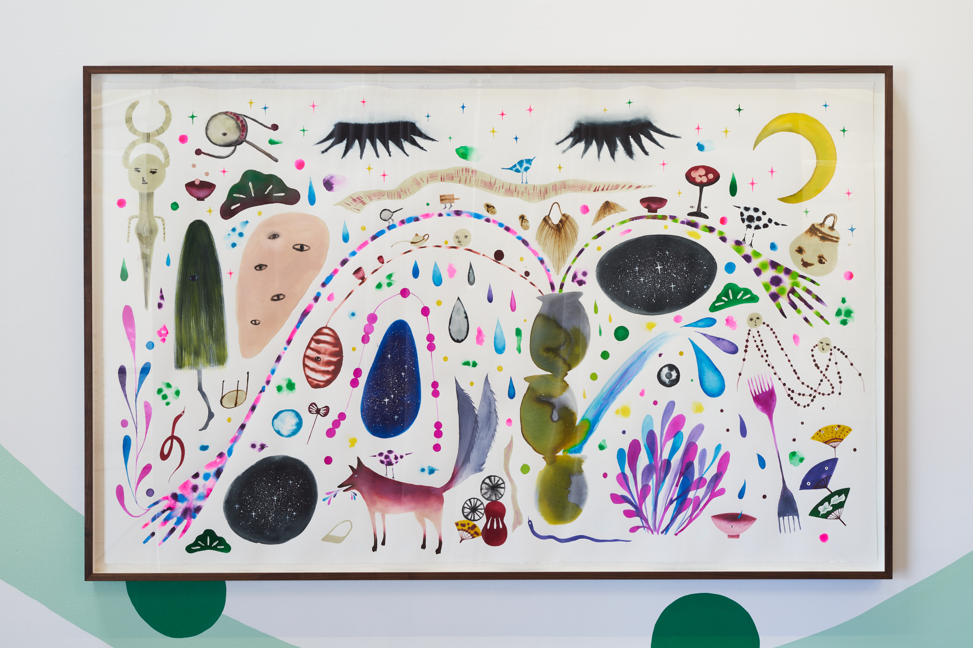 New Mythologies also includes new watercolor paintings offered in a range of sizes, including one large, wall-length artwork, that recall the appearance of Japanese scrolls. In yōkai tradition, the spirits saunter through the physical realm in a rhythmic night parade. The transparency of the watercolor medium underscores the fluidity of the spirits, who are depicted in the midst of their parade. Additionally, the artistic process of creating watercolor highlights the concept of chance and metamorphosis inherently embedded in the medium.