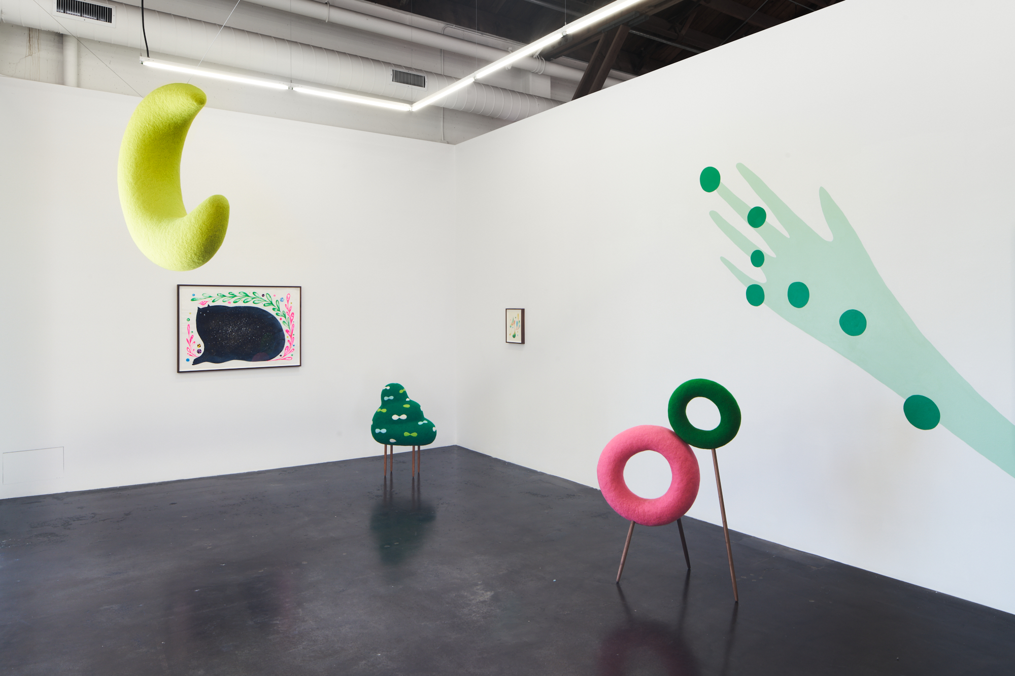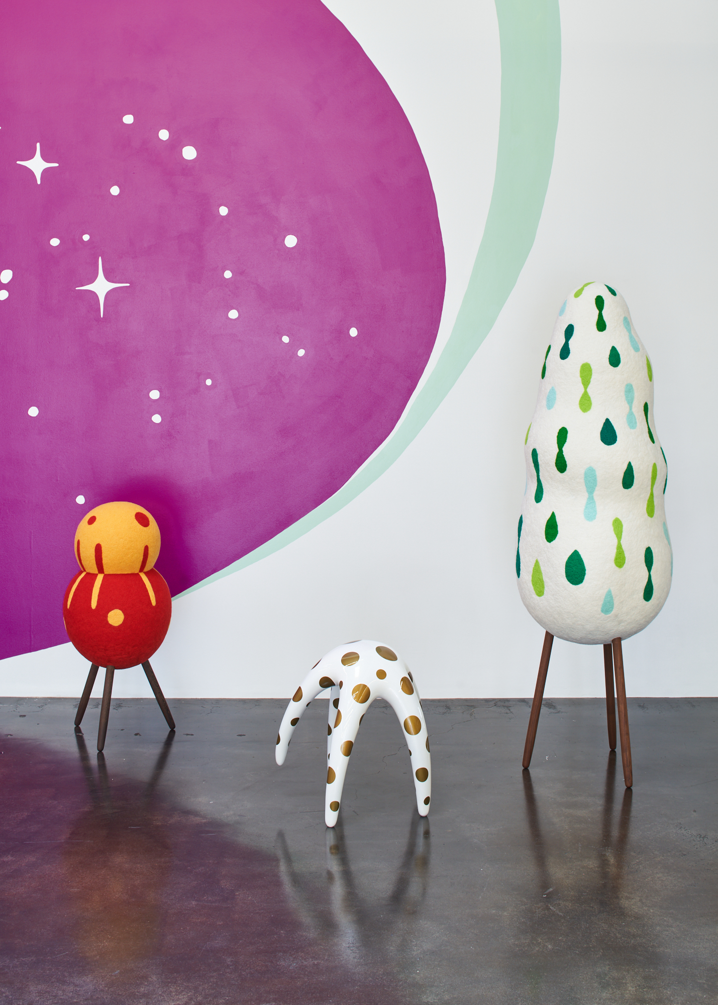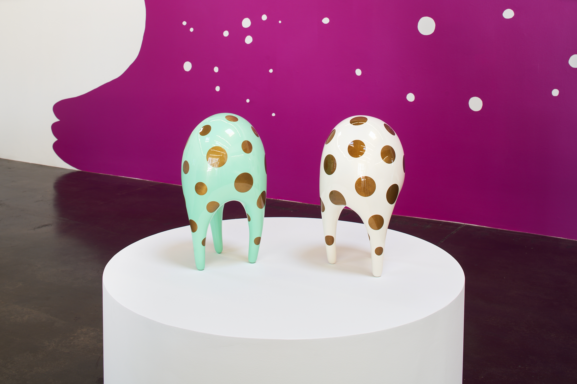 For her previous two solo exhibitions with CULT, Miki created the anamorphic yōkai in human scale from brightly-colored felt wool. The artist now contrasts the hand-felted wool medium with bronzes: densely layered in opalescent automobile paints that results in a glassy finish that continuously engages the eye through reflection and shifts in color. The figures—present in the gallery exhibition at table top size—are presented in monumental scale outdoors at the corporate installation. The varying scale of Miki’s yōkai allows viewers multitudinous engagements with the sculptures, aligning with the spiritual figures’ existence as fluid, frictionless forms.