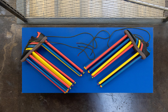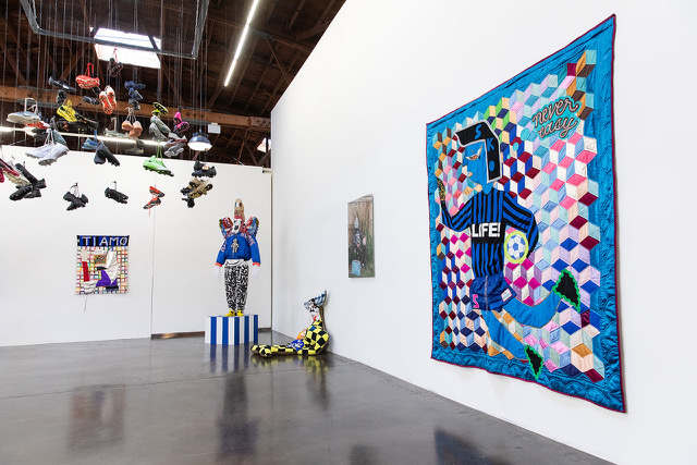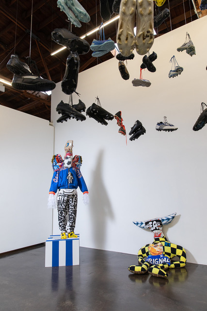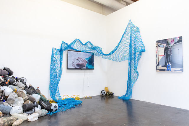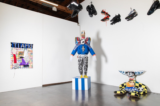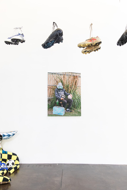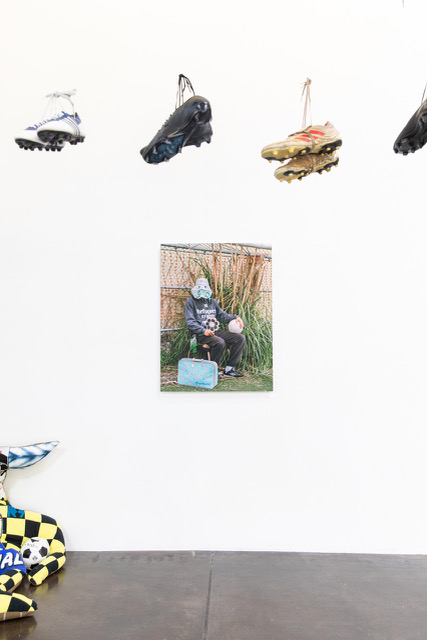 Collaborations include a restaging of Adam Feibelman’s Movement of the Ball (2017), an installation in which water jugs collected from border-crossers in Arizona and California are stacked, with some cut and stitched into deconstructed soccer balls — honoring those who have risked or lost their lives seeking asylum. And, Dania Cabello’s new installation, Memory in Motion, incorporates 41 pairs of cleats donated by the families of deceased players, suspended within a transparent floating pyramid. The installation functions as both altar and offering — a space where grief, memory, and transformation converge — while elevating play as a sacred human practice.