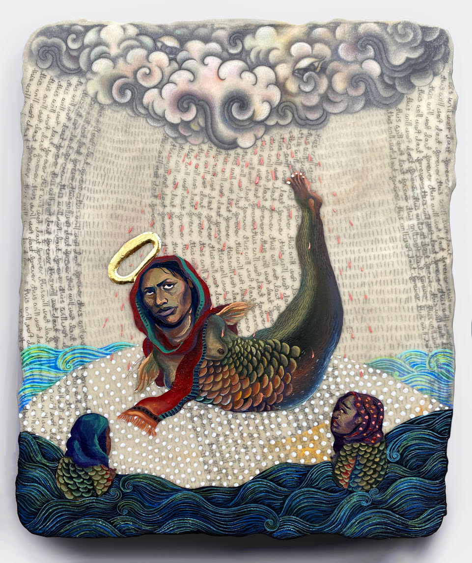 Sahana-Ramakrishnan, The Wrong Kind of Mermaid, 2021 Oil, acrylic, color pencil and graphite on canvas 12 3/4 x 10 3/4 x 2 1/4 inches 32.4 x 27.3 x 5.7 cm