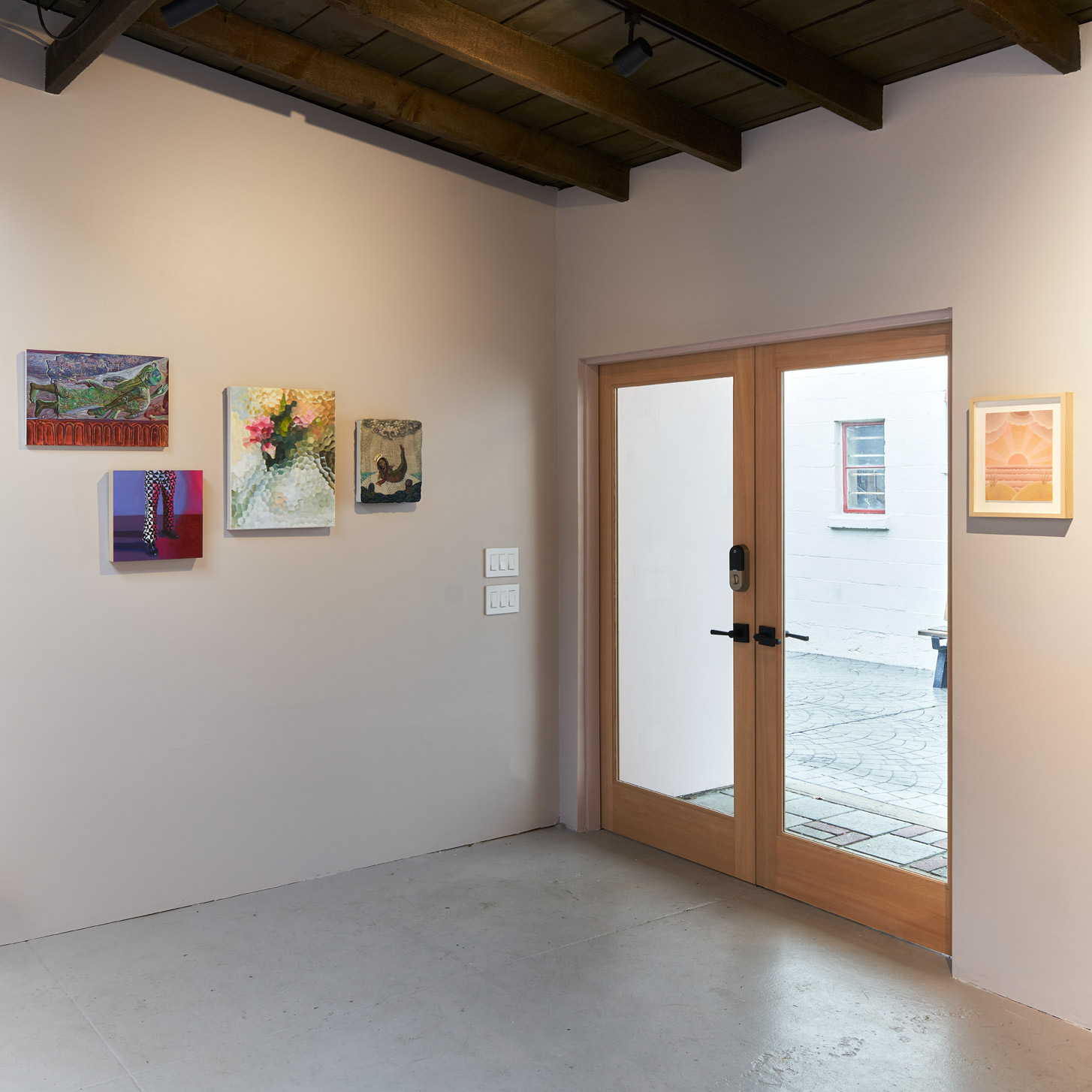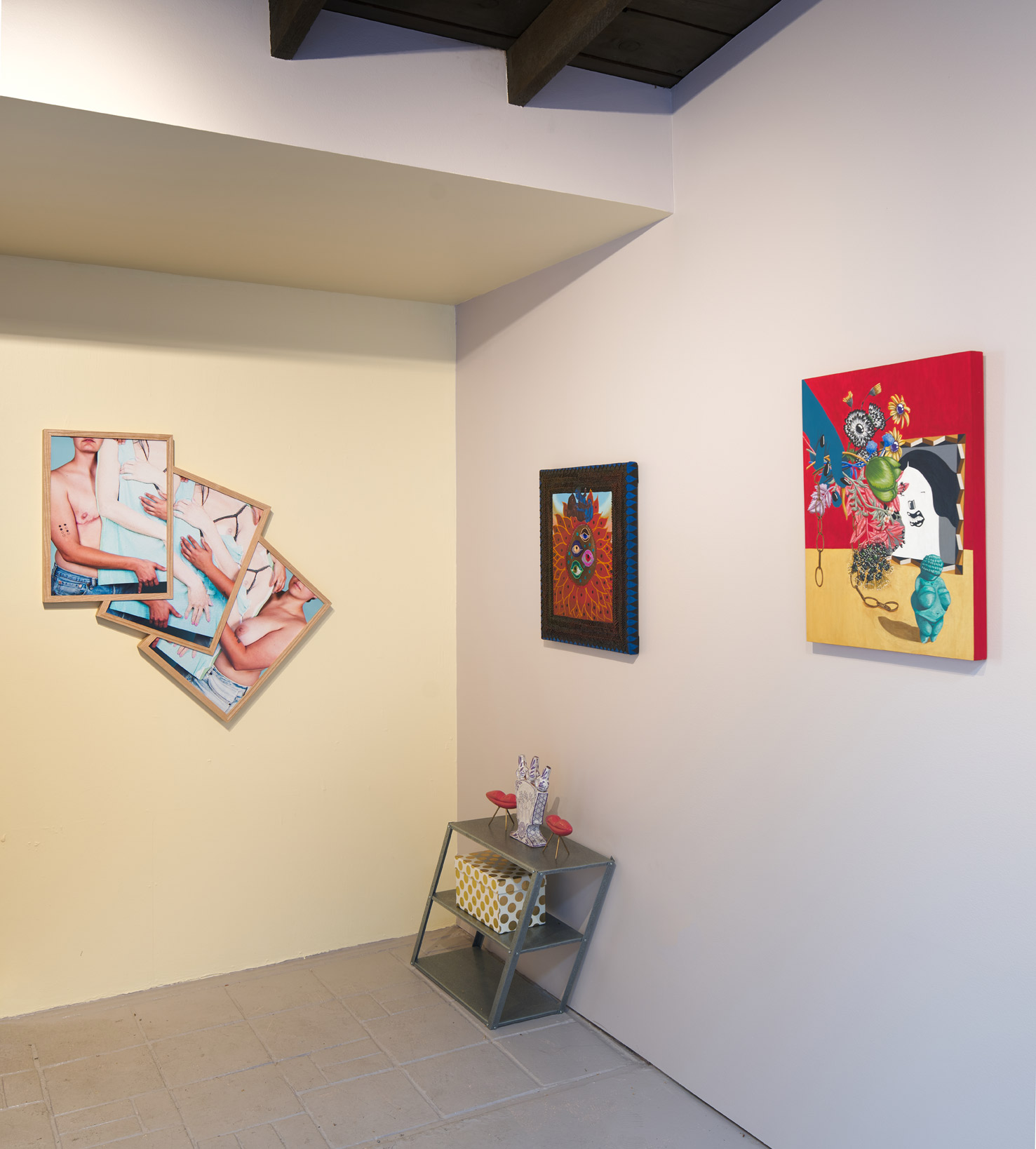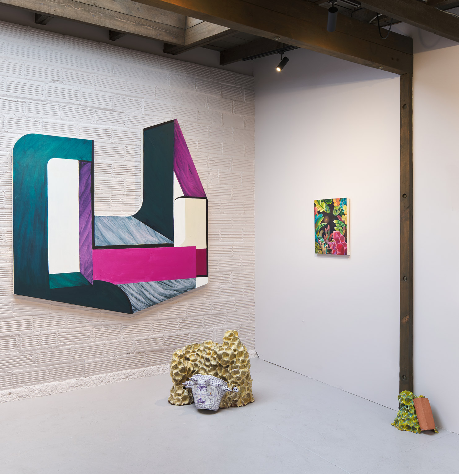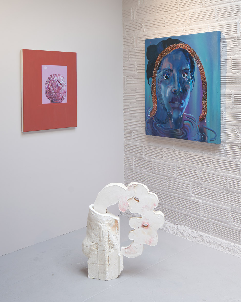 Chris Fallon, Loaded Compliment, 2021 Acrylic on canvas 24 x 18 inches Marcel Pardo Ariza, Rosie, Cait and Kat, 2018 Mounted Inkjet print, ash artist frame, Pool Blue paint 53 x 53 inches