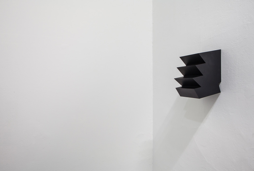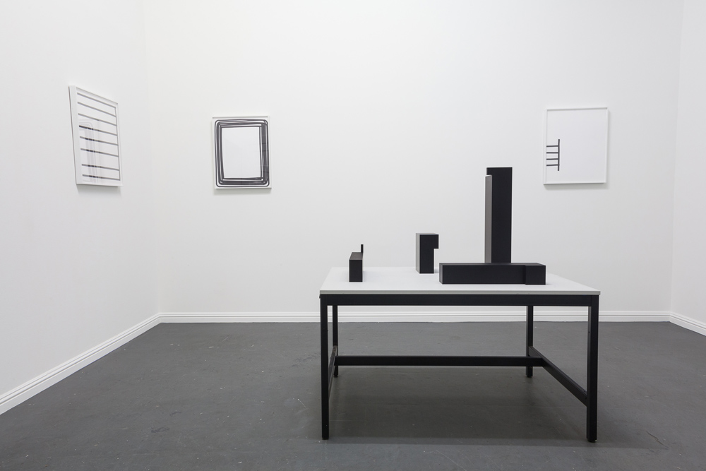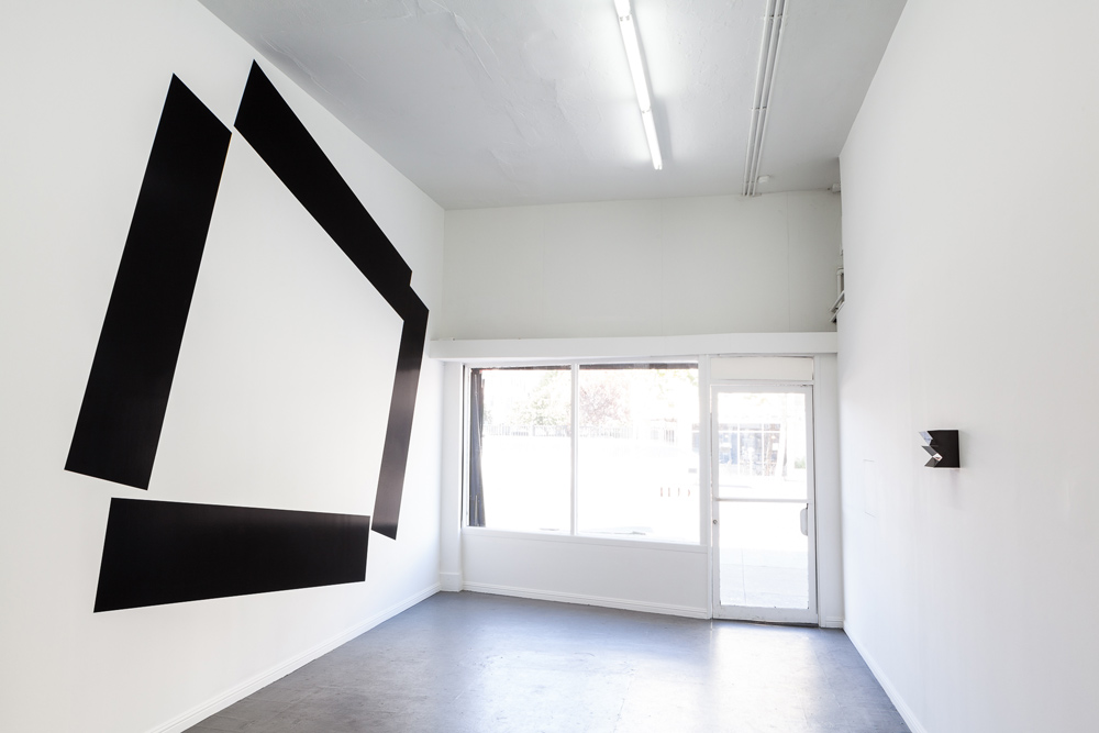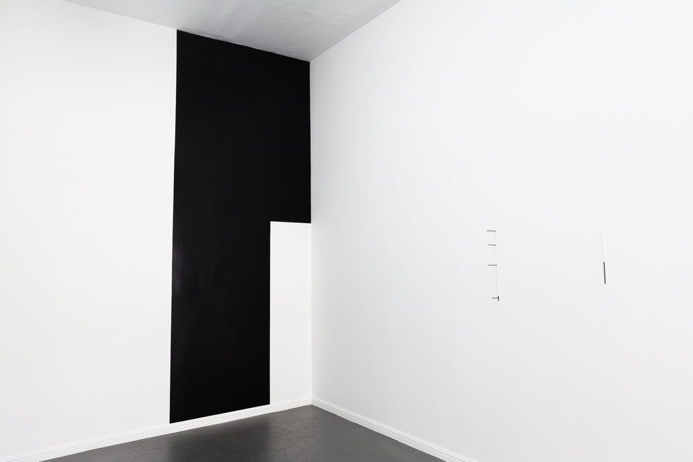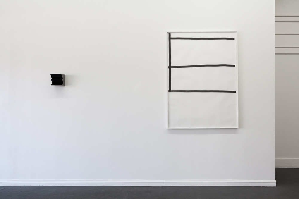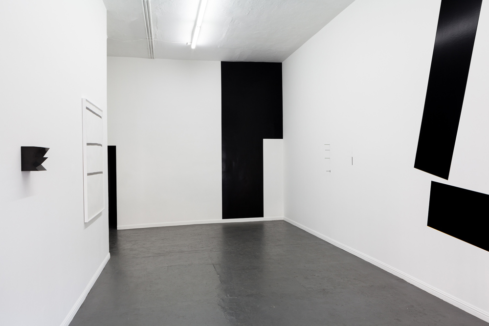 The sculptural works, while certainly evoking the traditions of Minimalism with their use of industrial aluminum and unitary geometry, in conversation with the drawings and site-specific space explorations, provoke another reading. A fractional sequence of metal parts, swaths of wallpaper, tethered shoelaces, and raw ink markings—ordinary, human gestures whose loose, irregular, asymmetrical, monochrome lines convey a sense of random assemblage. Free of boundaries, the streaks and shapes float in vast areas of untouched space as though waiting.