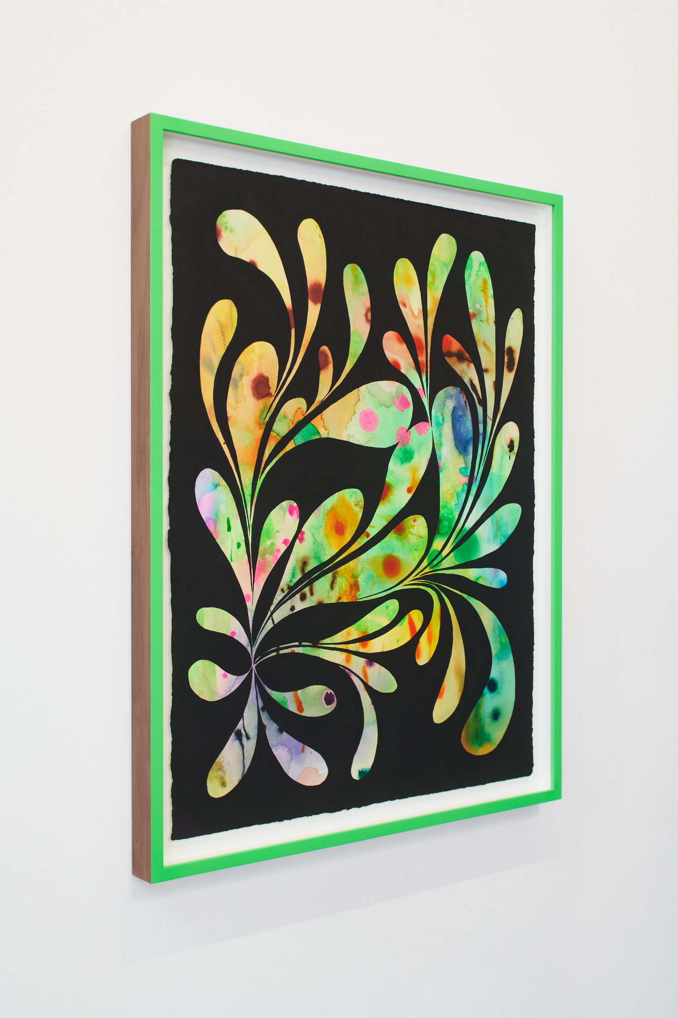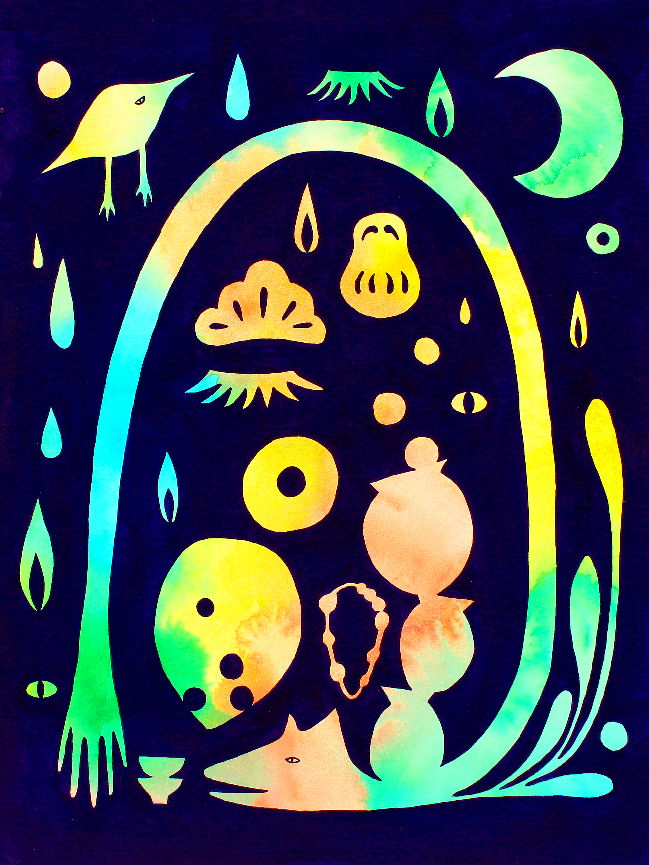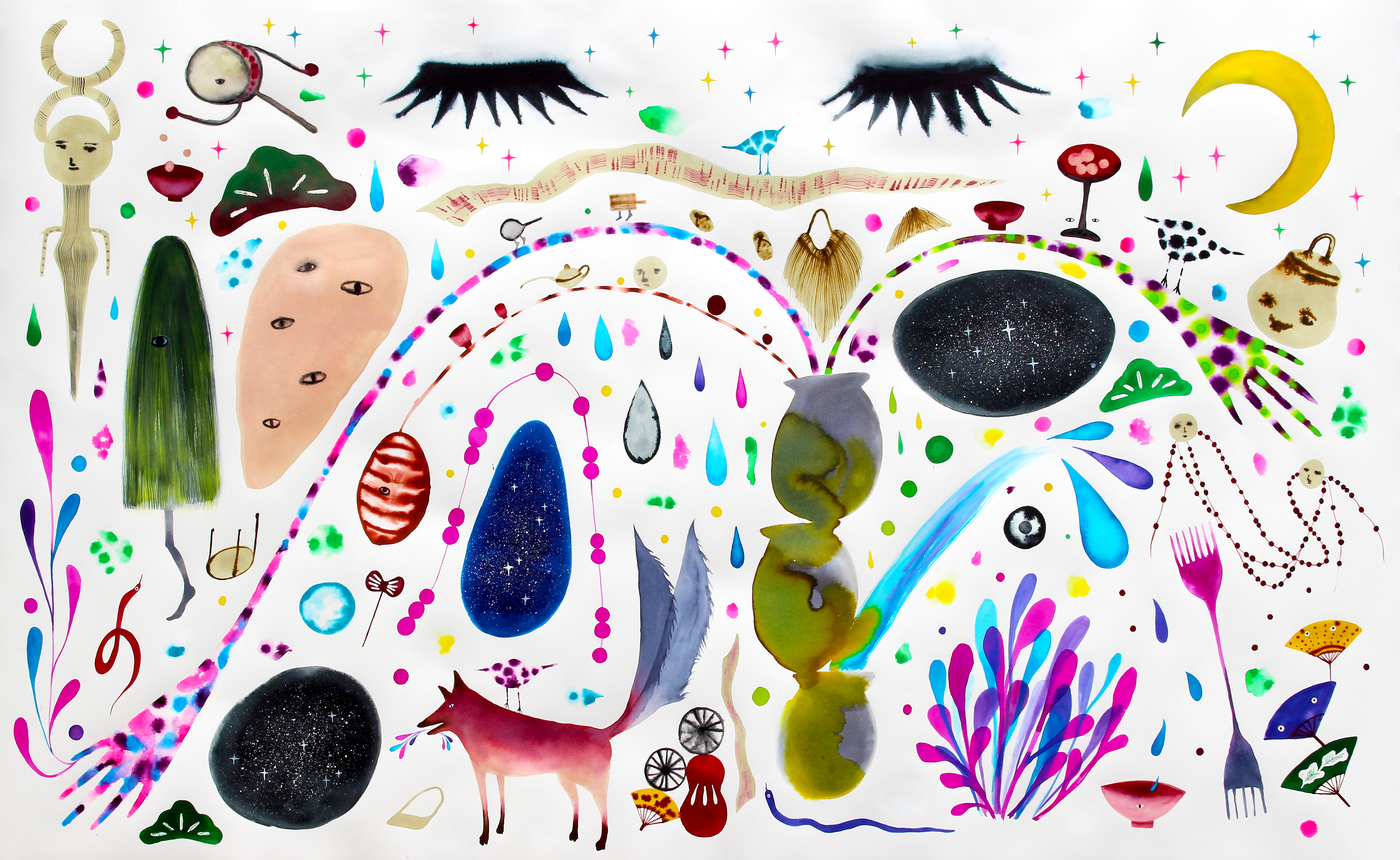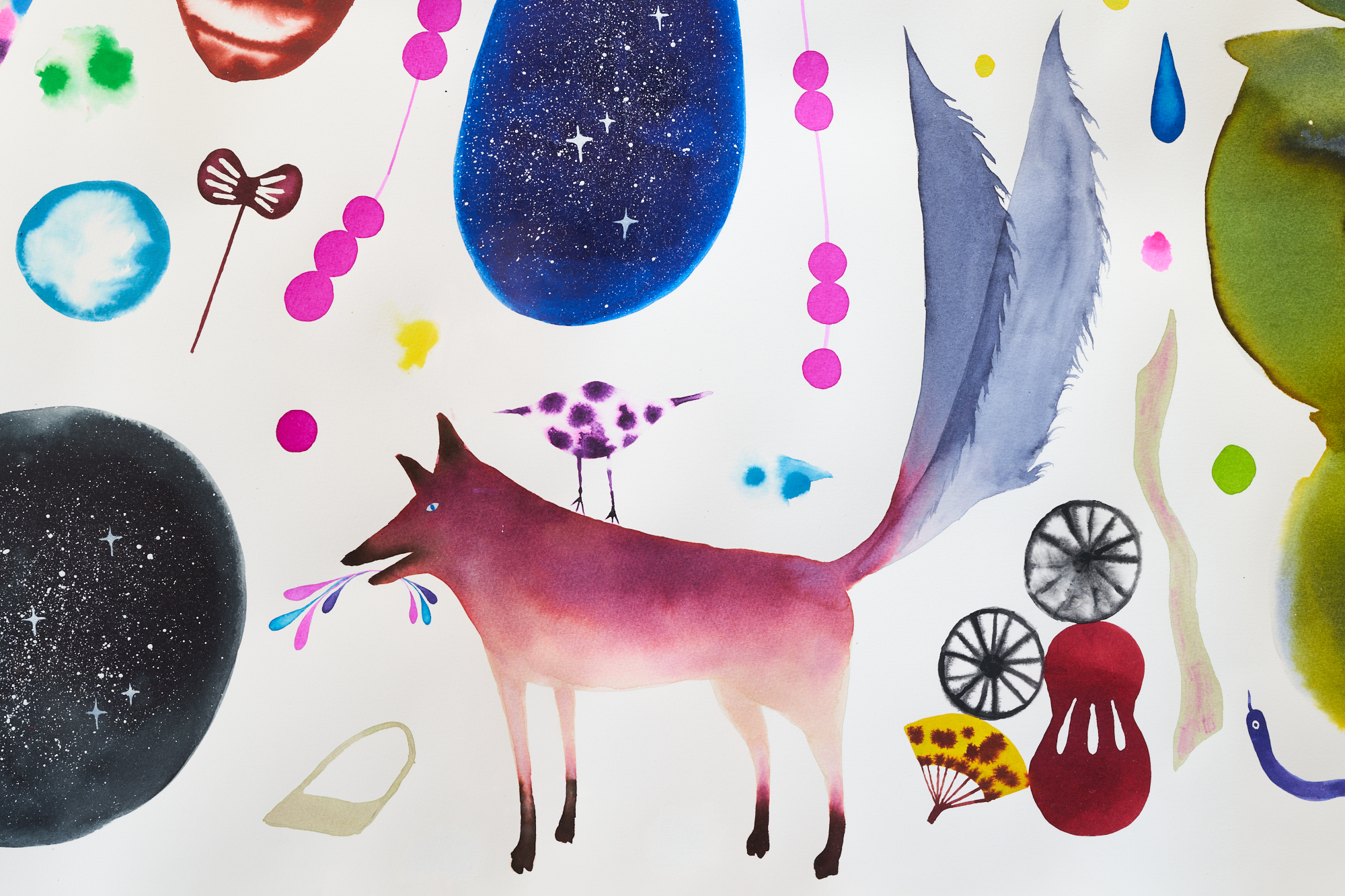 New Mythologies also includes new watercolor paintings offered in a range of sizes, including one large, wall-length artwork, that recall the appearance of Japanese scrolls. In yōkai tradition, the spirits saunter through the physical realm in a rhythmic night parade. The transparency of the watercolor medium underscores the fluidity of the spirits, who are depicted in the midst of their parade. Additionally, the artistic process of creating watercolor highlights the concept of chance and metamorphosis inherently embedded in the medium.