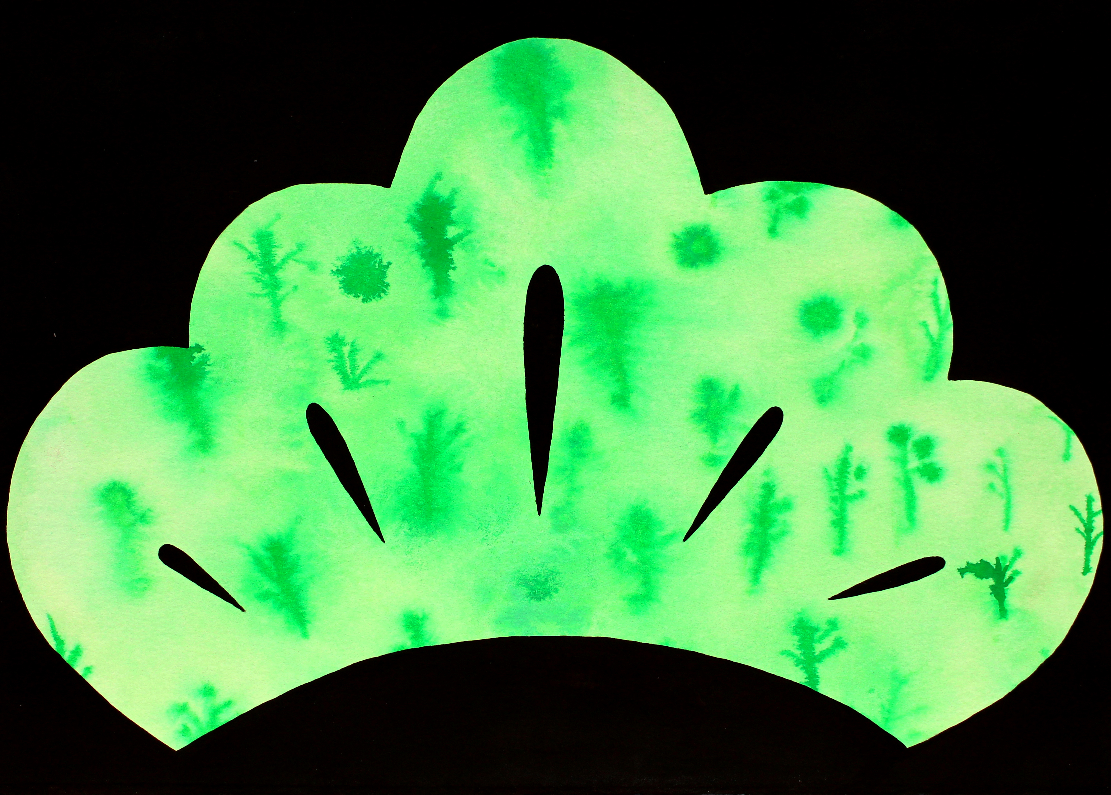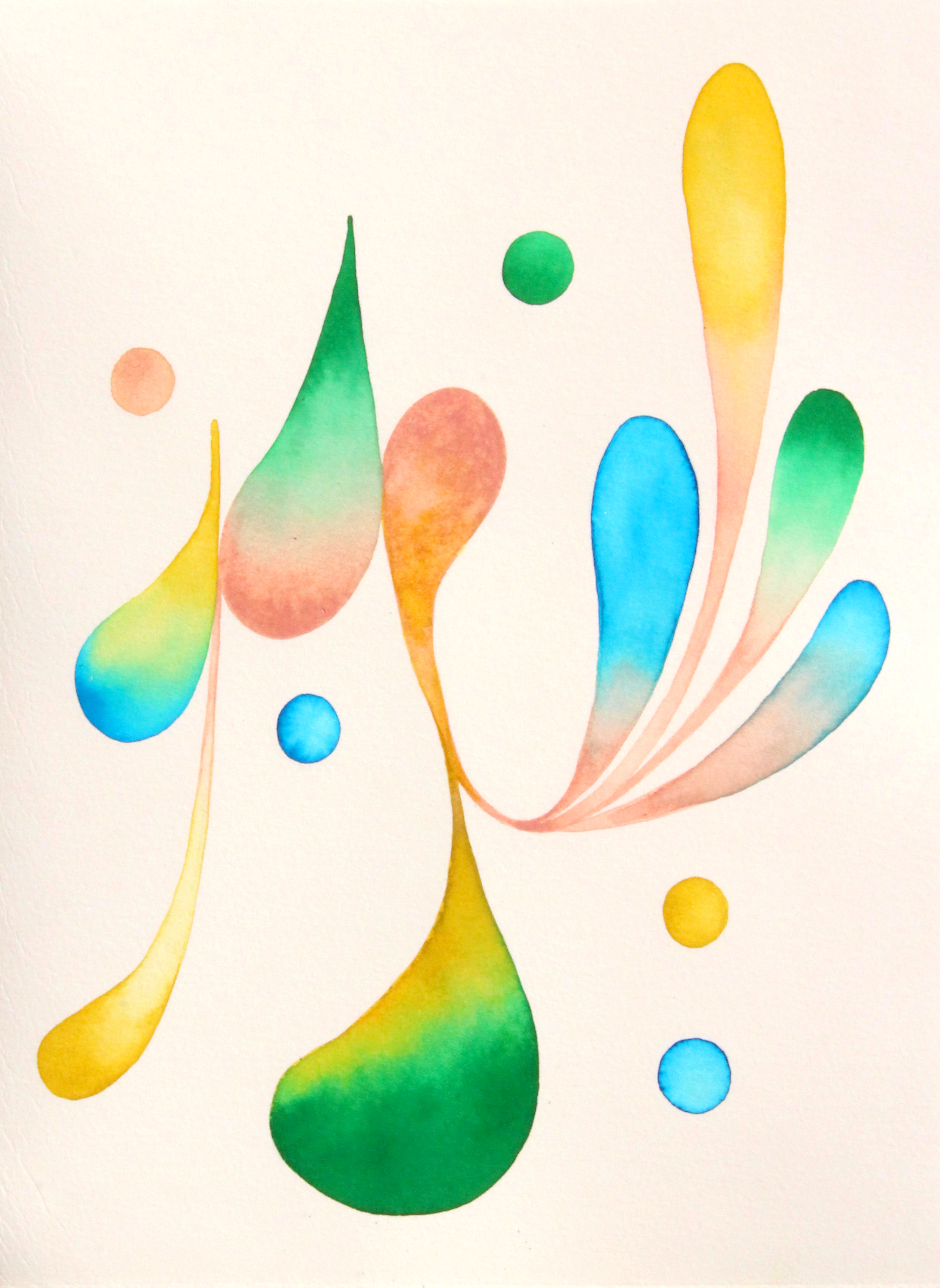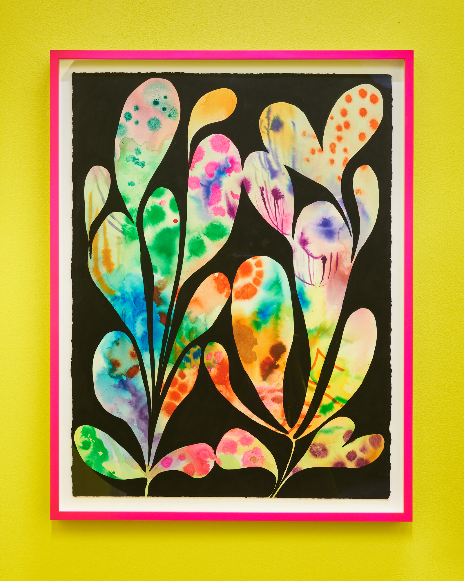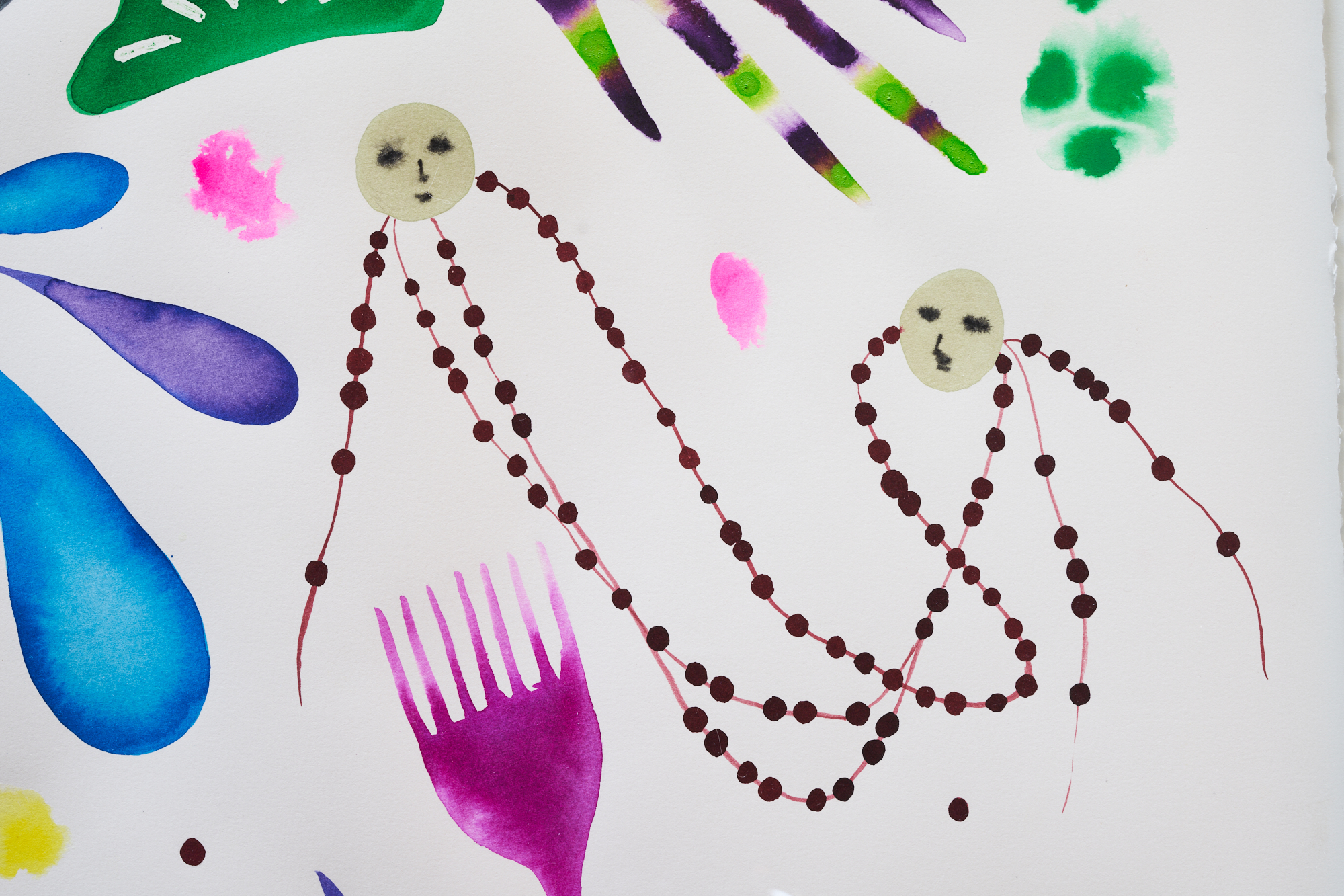 New Mythologies also includes new watercolor paintings offered in a range of sizes, including one large, wall-length artwork, that recall the appearance of Japanese scrolls. In yōkai tradition, the spirits saunter through the physical realm in a rhythmic night parade. The transparency of the watercolor medium underscores the fluidity of the spirits, who are depicted in the midst of their parade. Additionally, the artistic process of creating watercolor highlights the concept of chance and metamorphosis inherently embedded in the medium.