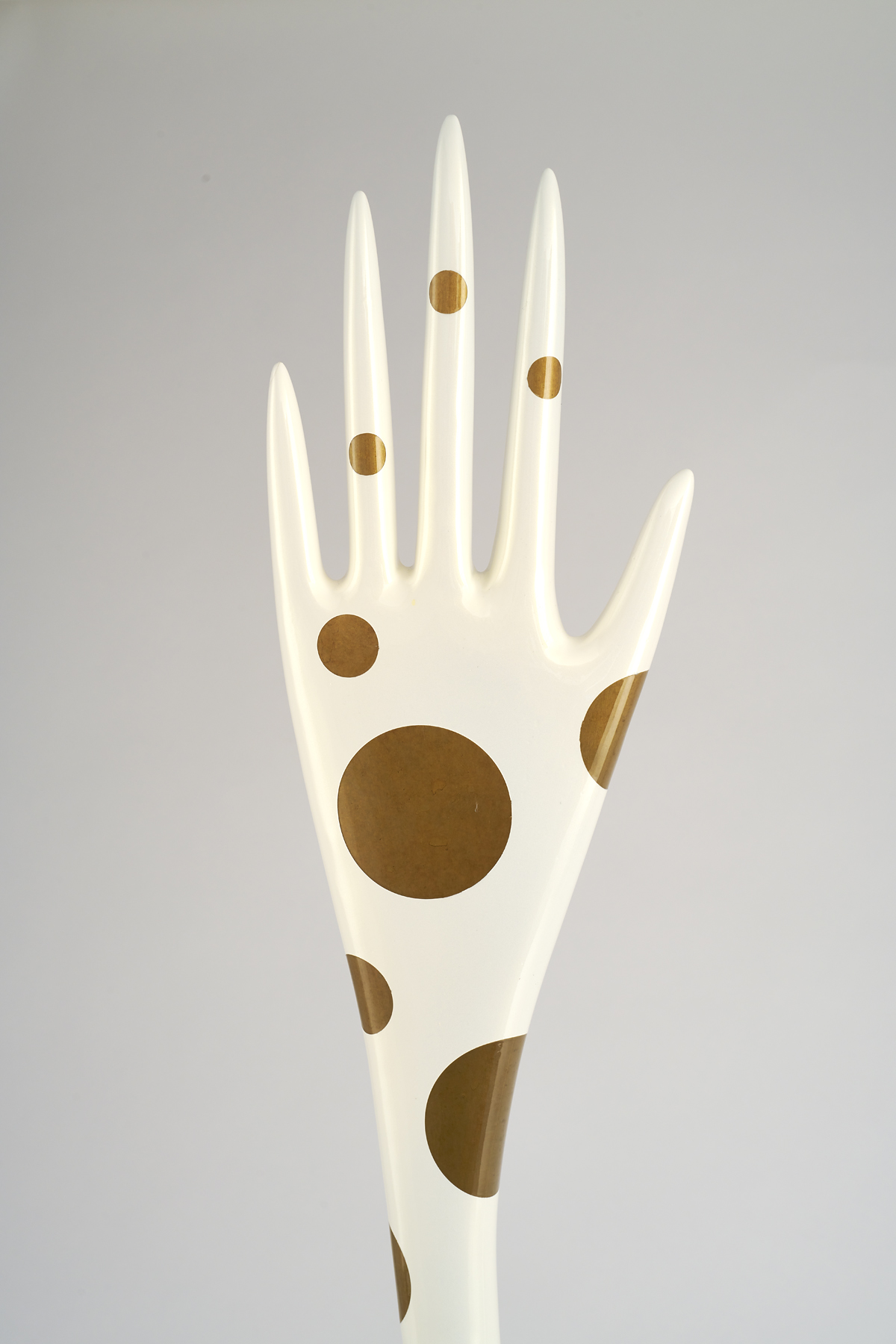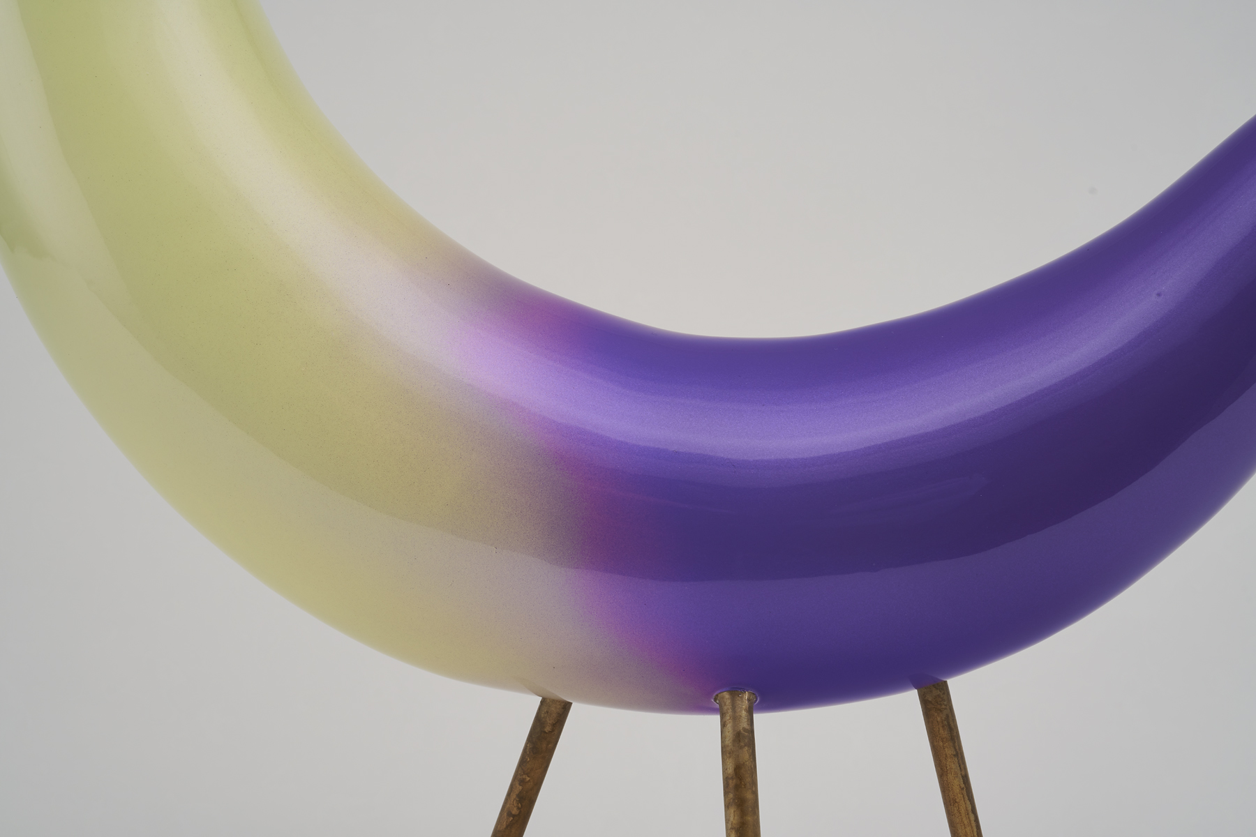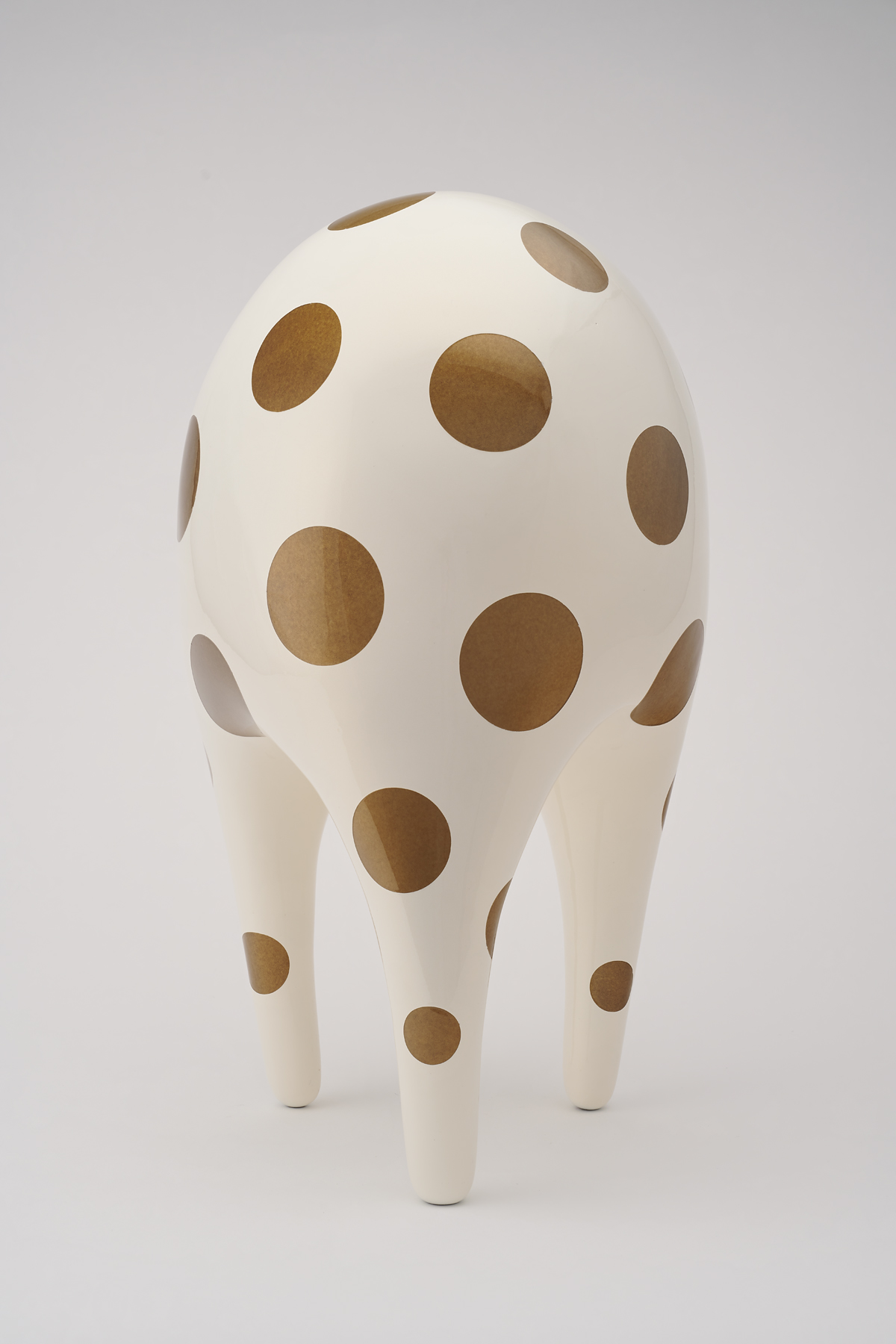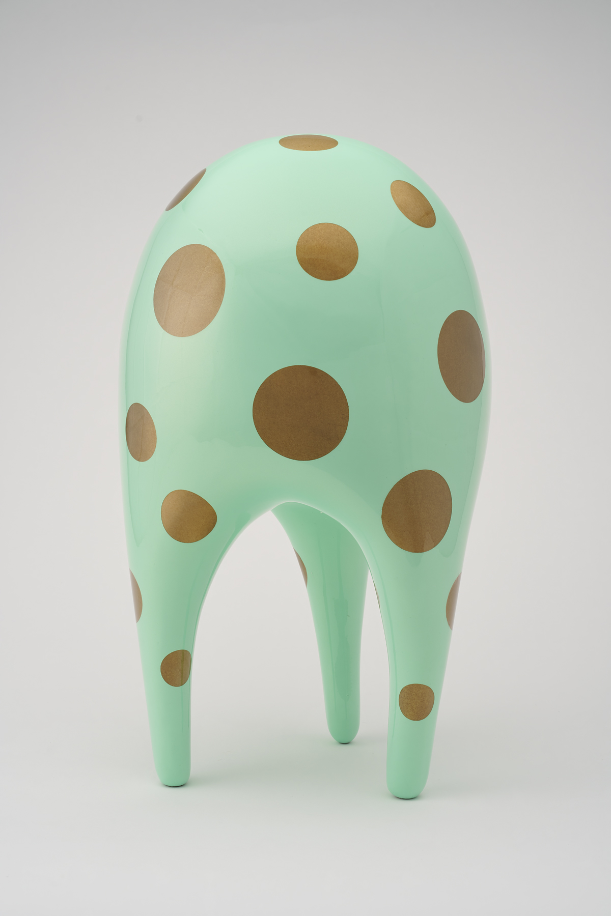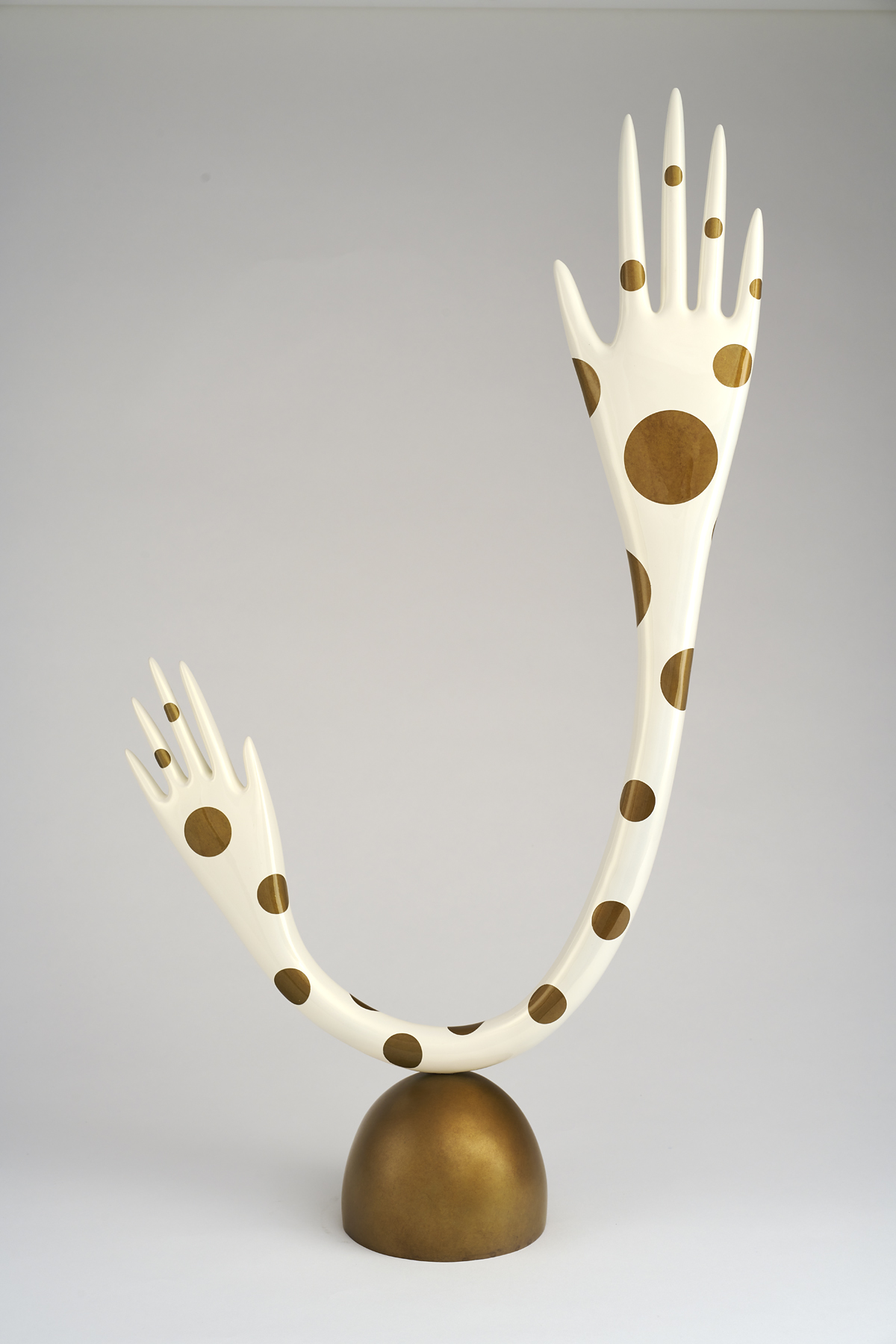 In collaboration with Artworks Foundry in Berkeley, Miki has expanded the boundaries of bronze casting to produce mirror-smooth, seamless surfaces. Further departing from traditional bronze work, Miki has synthesized patina with modern paint to imbue the medium with a new life. Of working with bronze as a medium, Miki states, "Bronze sculptures have a beautiful presence with patina finish that offer curvilinear movement in my work. I have combined both patina and very subtle layers of paint to create flickering optical illusions of colors, which emphasize movement and highlight the shape of form. My sculptures have been shape-shifting in materials from paper to felted wool and now, in innovating on the appearance of bronze with new form and materials for a contemporary audience. These evolutions are a natural process because the essence of the shapeshifters is fluidity."