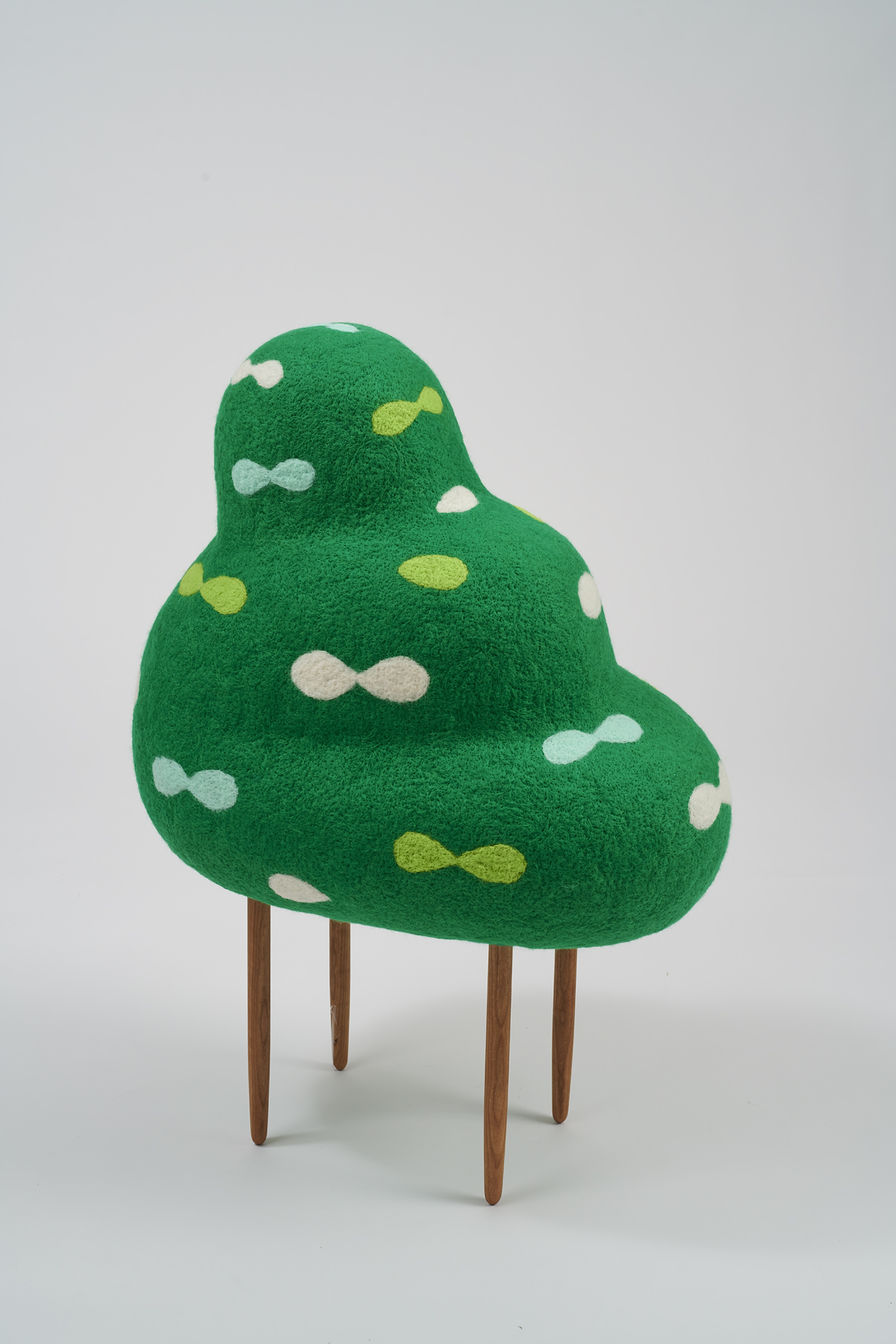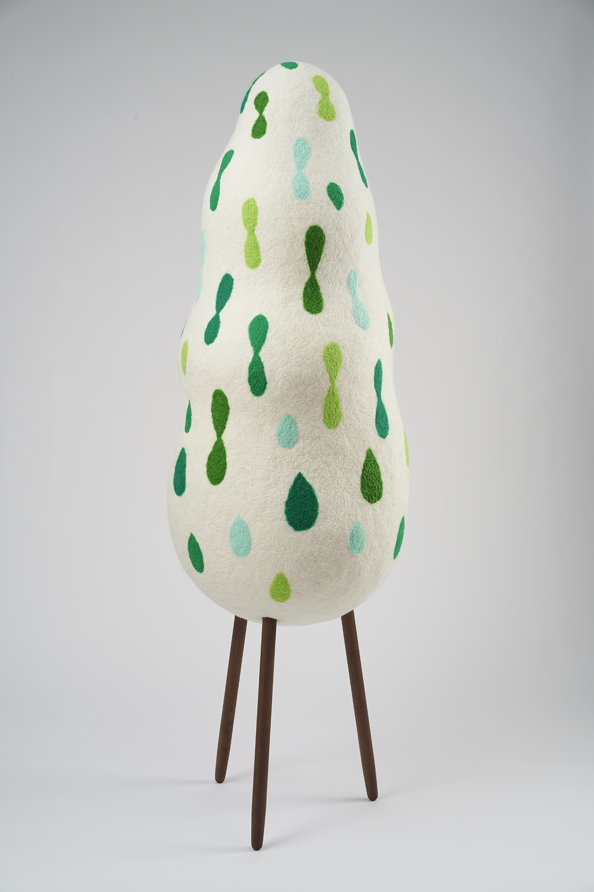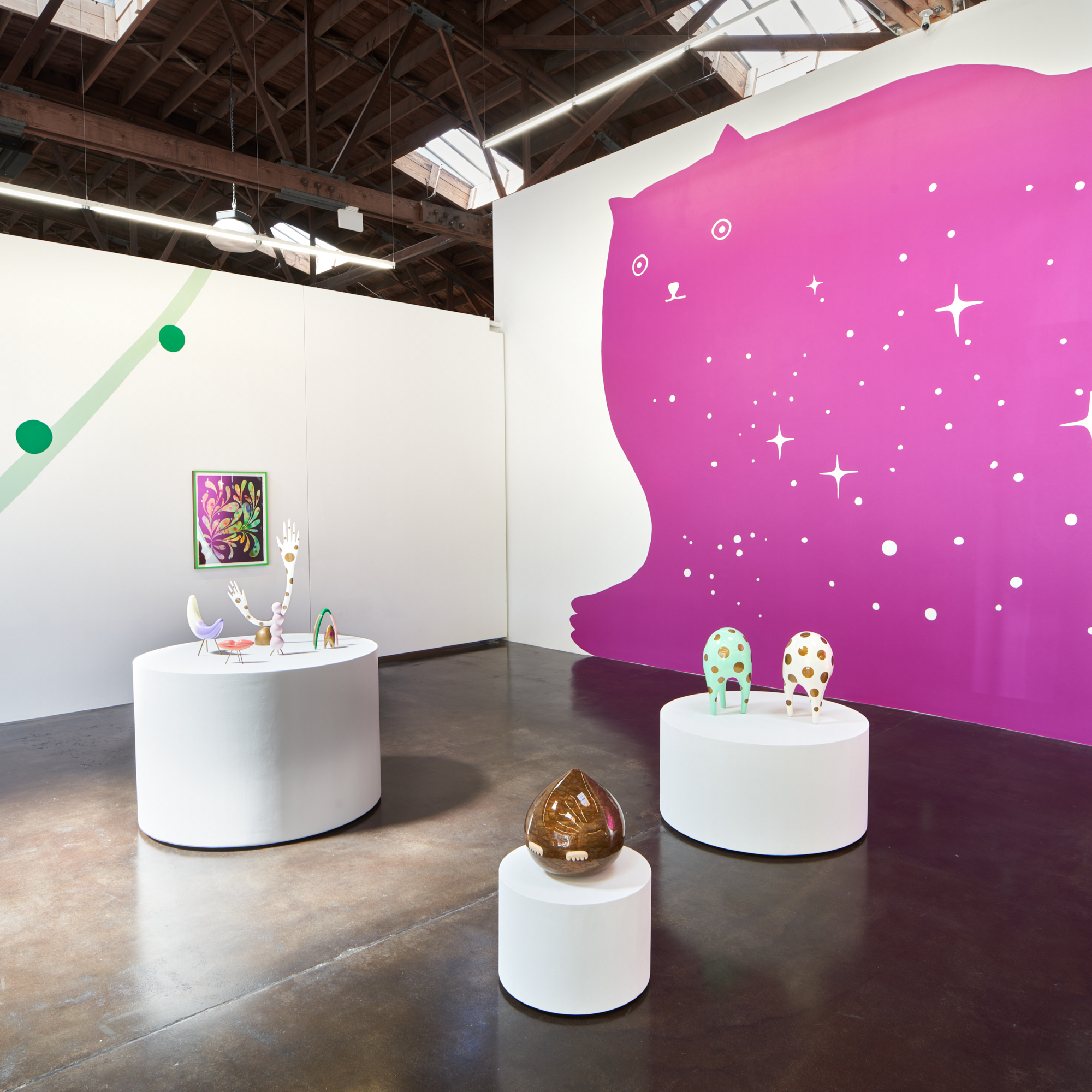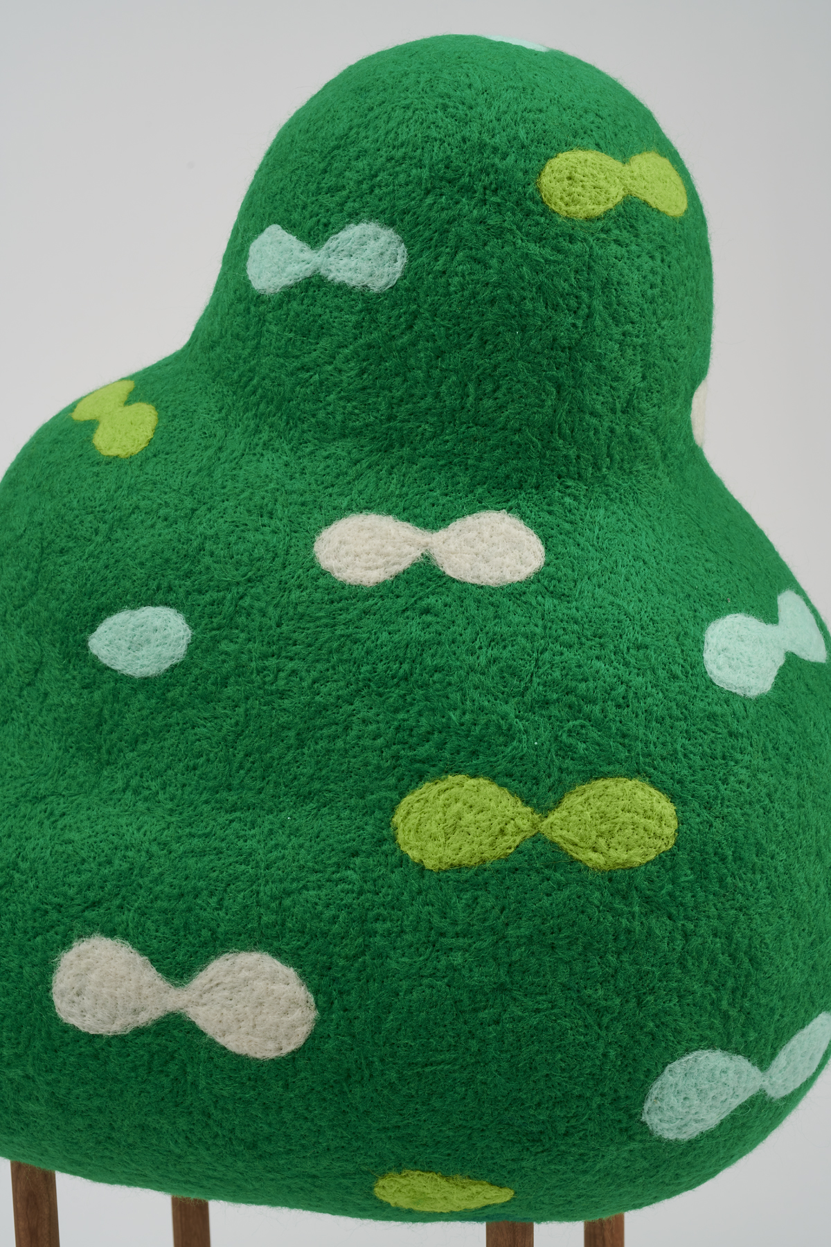 For her previous two solo exhibitions with CULT, Miki created the anamorphic yōkai in human scale from brightly-colored felt wool. The artist now contrasts the hand-felted wool medium with bronzes: densely layered in opalescent automobile paints that results in a glassy finish that continuously engages the eye through reflection and shifts in color. The figures—present in the gallery exhibition at table top size—are presented in monumental scale outdoors at the corporate installation. The varying scale of Miki’s yōkai allows viewers multitudinous engagements with the sculptures, aligning with the spiritual figures’ existence as fluid, frictionless forms.