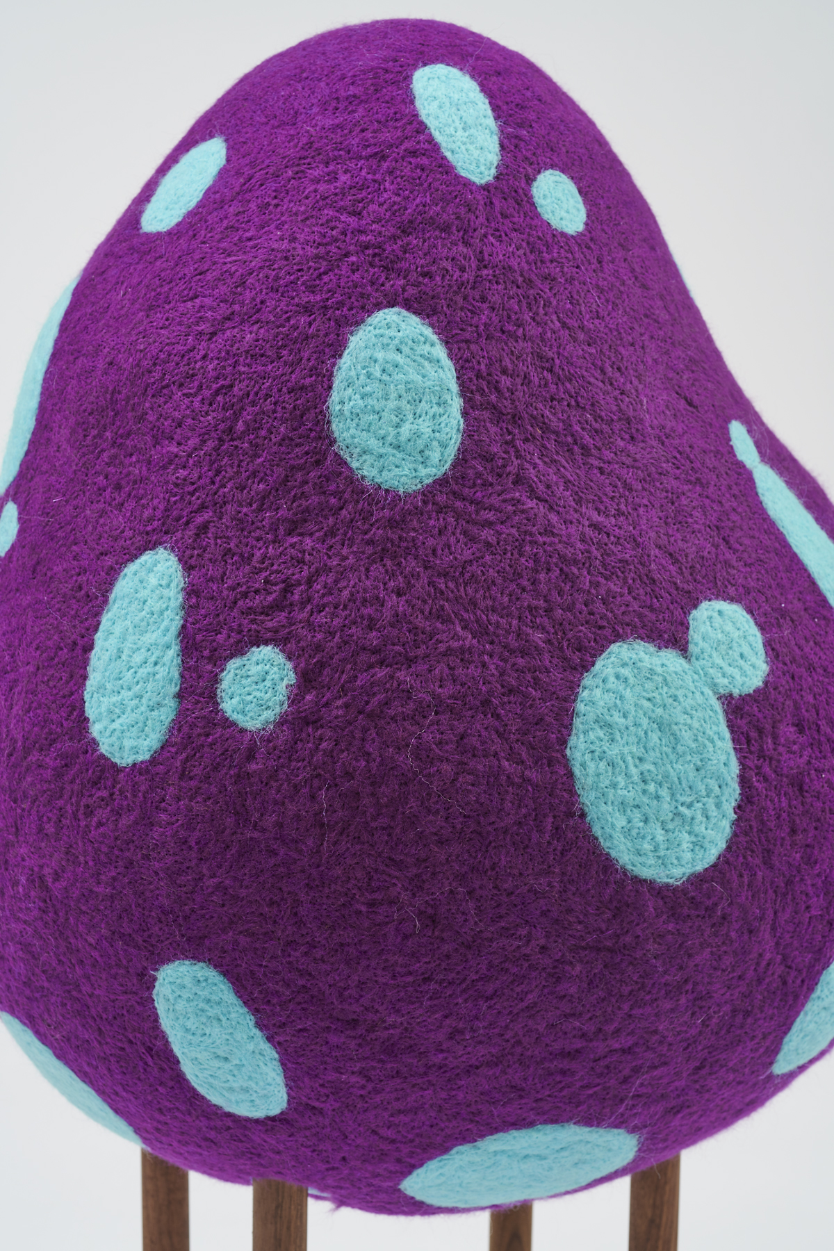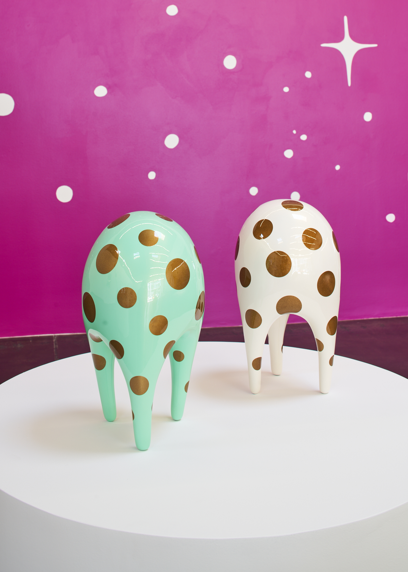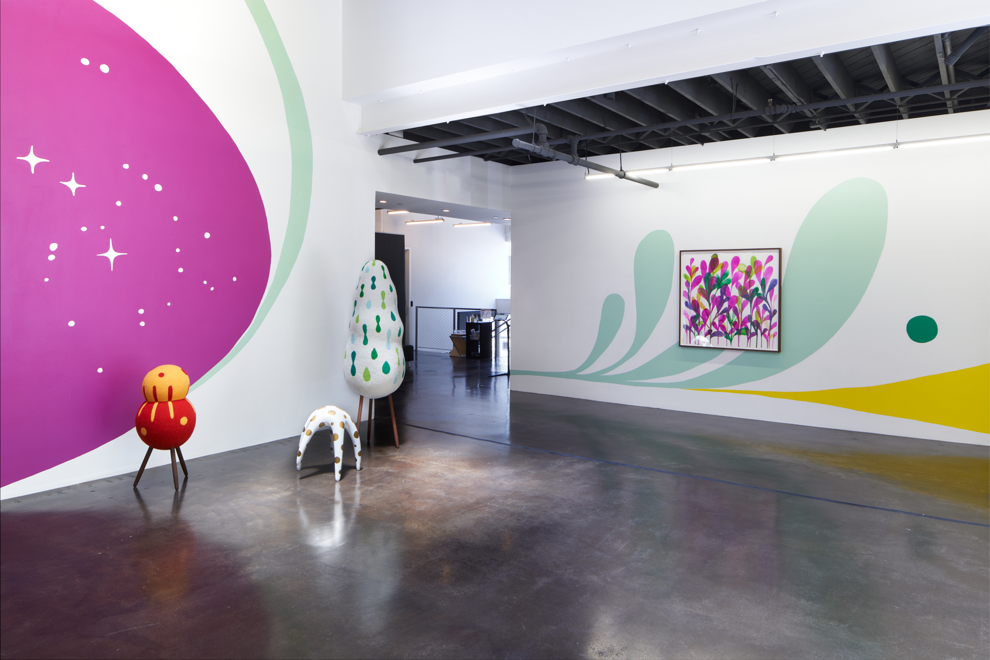 For her previous two solo exhibitions with CULT, Miki created the anamorphic yōkai in human scale from brightly-colored felt wool. The artist now contrasts the hand-felted wool medium with bronzes: densely layered in opalescent automobile paints that results in a glassy finish that continuously engages the eye through reflection and shifts in color. The figures—present in the gallery exhibition at table top size—are presented in monumental scale outdoors at the corporate installation. The varying scale of Miki’s yōkai allows viewers multitudinous engagements with the sculptures, aligning with the spiritual figures’ existence as fluid, frictionless forms.