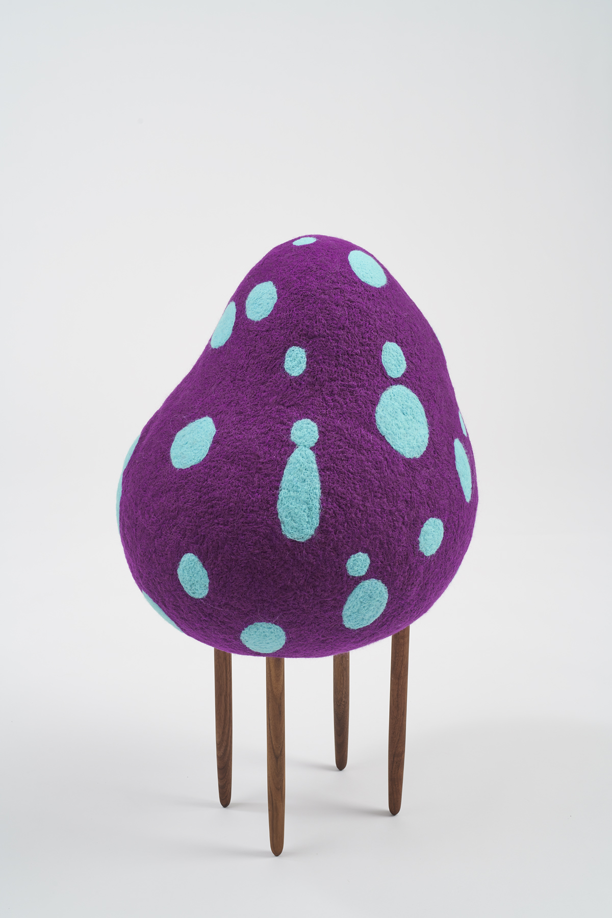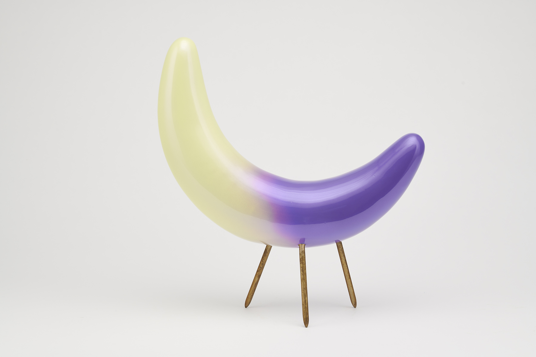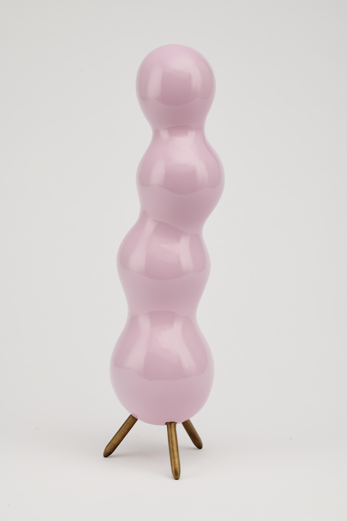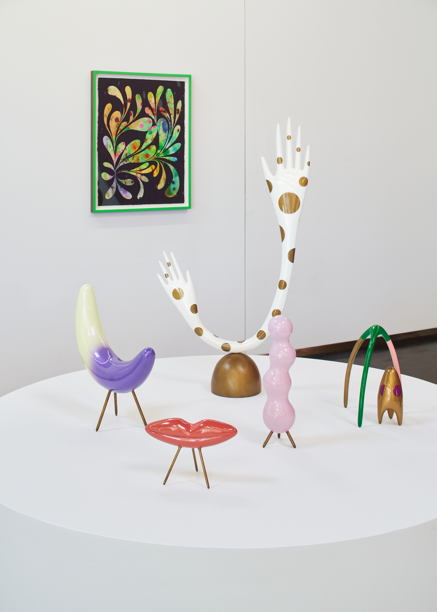 For her previous two solo exhibitions with CULT, Miki created the anamorphic yōkai in human scale from brightly-colored felt wool. The artist now contrasts the hand-felted wool medium with bronzes: densely layered in opalescent automobile paints that results in a glassy finish that continuously engages the eye through reflection and shifts in color. The figures—present in the gallery exhibition at table top size—are presented in monumental scale outdoors at the corporate installation. The varying scale of Miki’s yōkai allows viewers multitudinous engagements with the sculptures, aligning with the spiritual figures’ existence as fluid, frictionless forms.