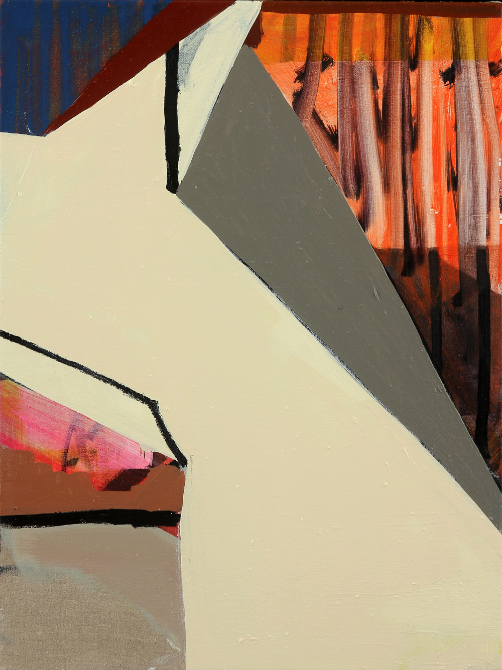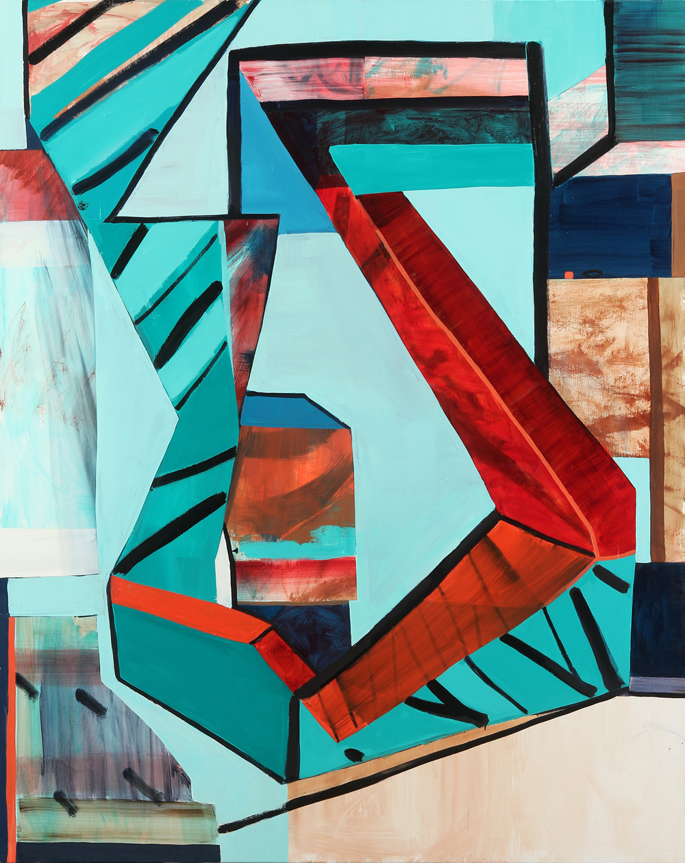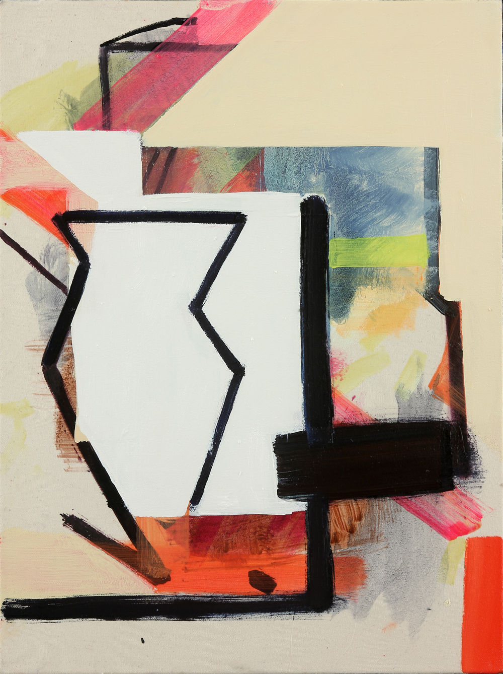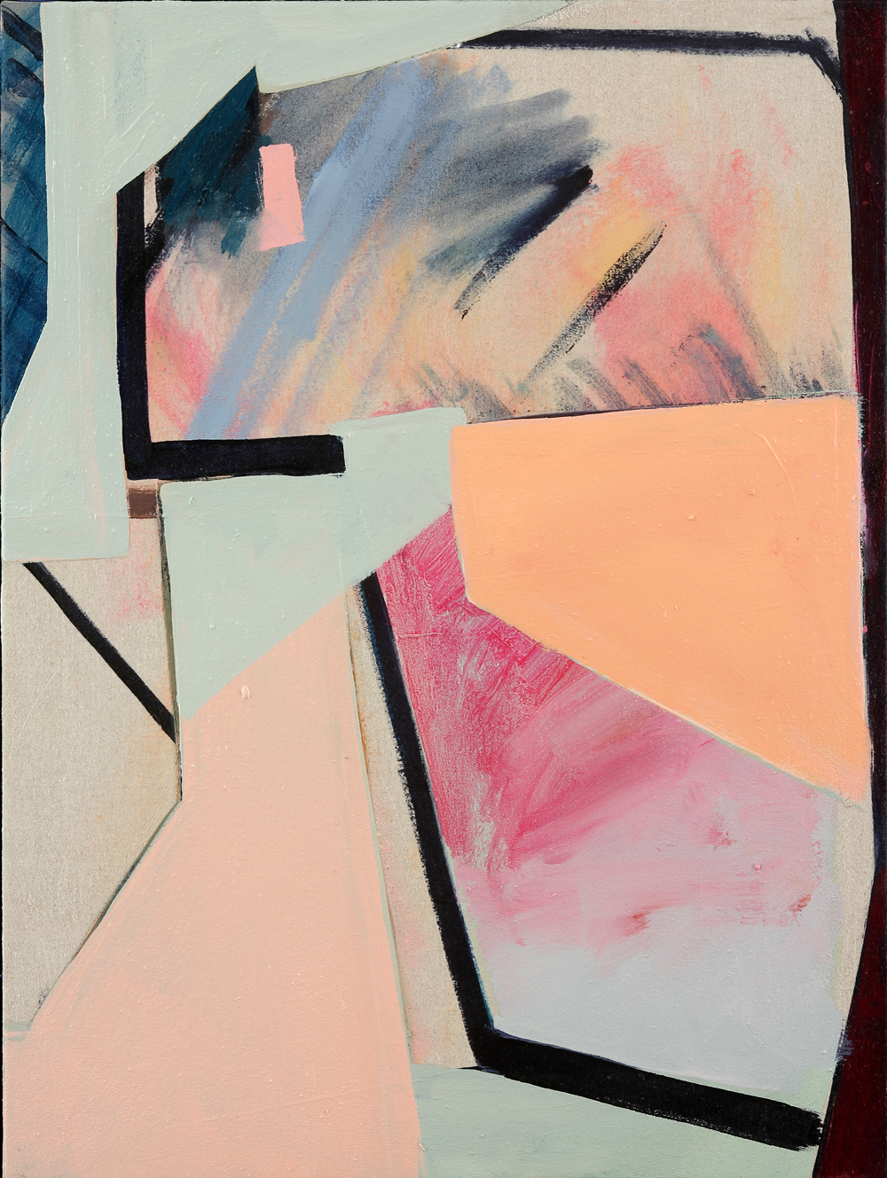 In this recent suite of paintings for Passenger, re-occurring elements suggest a loose, open-ended narrative of a mysterious figure that is at once present yet absent/hiding in all of the work. The canvas becomes a stage upon which the painterly fragments and symbols theatrically perform. The paintings draw on various art historical themes, including the Cubist still life, the avant-garde theater set, Op art, and geometric abstraction. Elements of everyday surroundings – parts of architecture, the living world, and human form – intersect with art historical references, creating forms that blur the lines between categories.