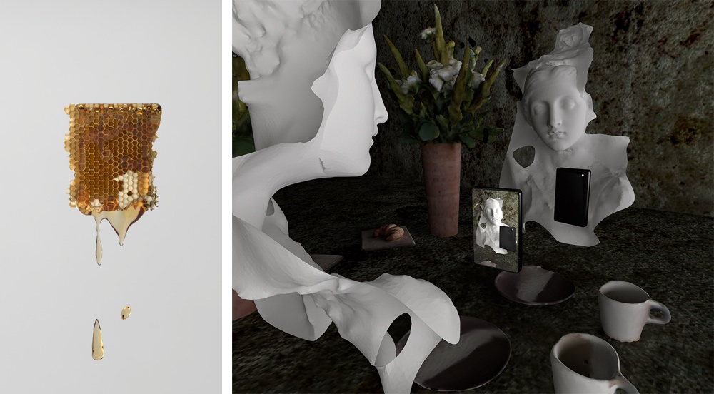 As the title Still Life suggests, this exhibition considers the relationship between stillness and life, inanimate and animate, in today’s image inundated world. While the commissioned still life painting was once a rarified symbol of status, this slow tradition now continues in streams of multiplicity. Holberton reflects upon the smart-phoned classes compulsively and carefully arranging, digitally displaying, and sharing their personal ephemera at incredible speed with both still images (Just This One Thing) and animations (The Drone is not Distracted by the Perfume of Flowers). Yet instead of photographs of her own mundane belongings, Holberton presents 3D scans carefully knitted together within a CGI programming environment. This belabored manufacture produces a new form of ‘objet’ that is nearly physical yet entirely artificial.