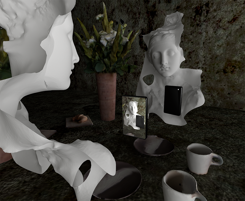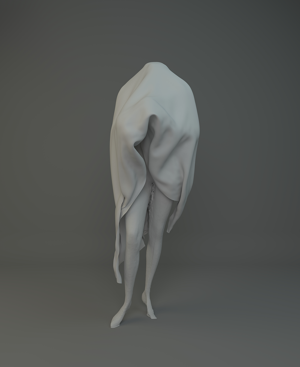 The works on view provide visual antiphon to the investigation within three groupings in the gallery. At the entry of the gallery is a headless male mannequin casually presiding over the goings on in the gallery. On the walls in the front room, 3D modeled images are woven into tapestries (Just This One Thing series) and animated into a digital video (The Drone is not Distracted by the Perfume of Flowers). These representations soften distinctions between illustration and allegory through the restaging of real objects that have been scanned and re-presented in virtual space. Taking cues from Instagram aesthetics & the curation of posts as expressions of self, these 3D renderings engage the historical context of computation and automation. The video installation, /no stats on the same, utilizes motion capture data from the artist’s own body movements transplanted onto a scan of a male model as an exercise in becoming other or mapping one’s avatar onto another biology. The performance of the artist and the virtual environment are both plotted onto the dimensions of the existing architecture of the gallery; uniting the space of two physical locations through the projection of virtual space.