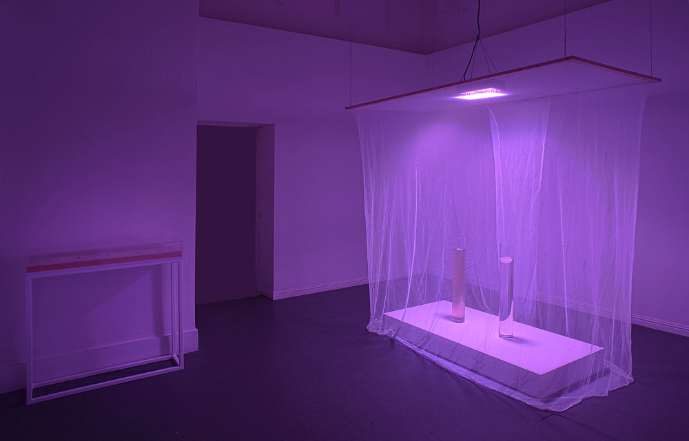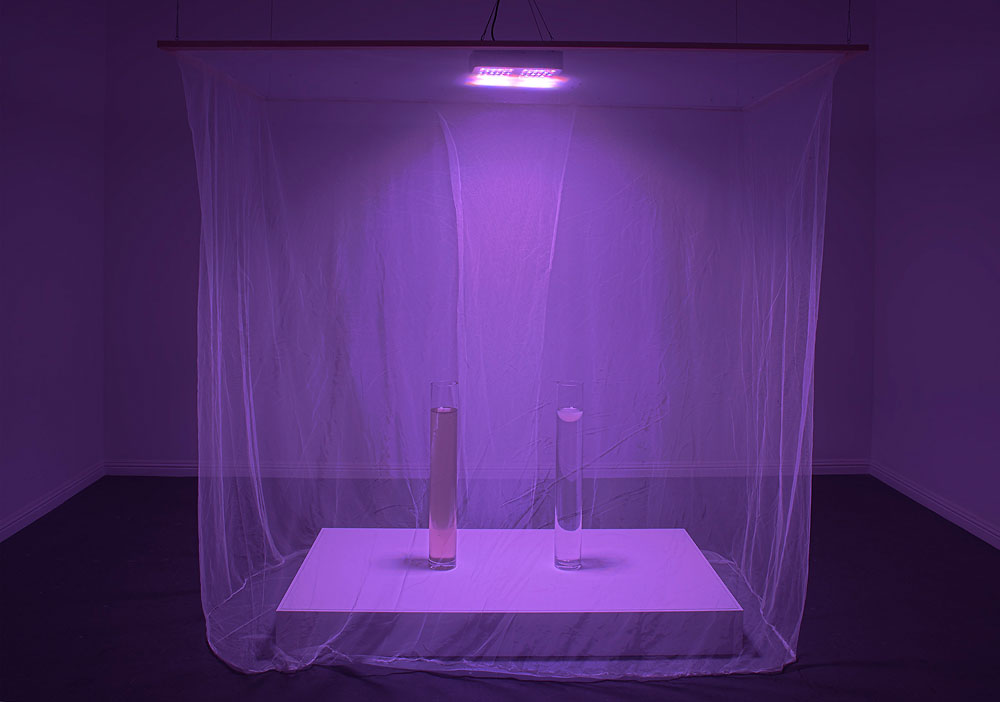 In the rear gallery, a netted veil is suspended from the ceiling illuminated by a full-spectrum hydroponic grow-lamp. Inside the net housing, mosquitoes feed on sugar water near recently harvested California gold measured by the gram. On the one hand, the works model extraction as method for value creation vis–à–vis material transformation through labor; the artist with the gold, the mosquitoes through blood meal. Meanwhile, the production and processing of marijuana are poised to take on the role of the next major viable California industry. On the other hand, the metaphors and histories of these very material things are embedded in stories of digital technologies, climate change, religion, and politics in ways that connect back to corporeality. Today, the technologists of Silicon Valley are compared to the 49ers of last century’s gold rush; both activities of value creation belong to a similar narrative belonging to a masculine entrepreneurial ideology. Similarly it’s hard not to think about the mosquito without thinking of the virus, currently one closely associated with fertility. These works offer a reminder that while the bio-technical divide grows ever more transparent, we are still very much dependent on the ‘six-inch layer of topsoil, and the fact that it rains.’