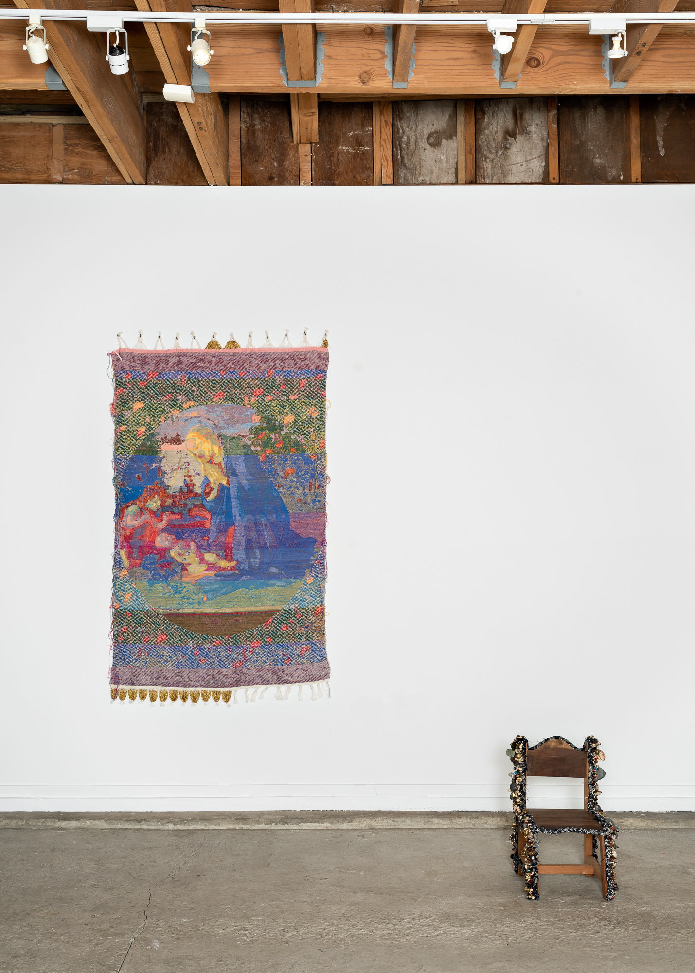 Referencing the history of tapestry and its relationship to religious and devotional iconography, John Paul Morabito reimagines this historical practice by weaving queerness into the tapestry template. By repositioning both the medium and its subject matter, Morabito conflates the sacred to create a new, more inclusive mystical plane. Similarly seeking to create a widening expanse in historical narratives, Yetunde Olagbaju threads multiple mediums in their video work to address the fantastical intersection of time travel and ancestral lineage. Through an examination of nonlinear time, Olagbaju’s recent work is about myth and its transformation into effigy and eventual commodity to illuminate myth legends or folklore surrounding Black people and their labor.