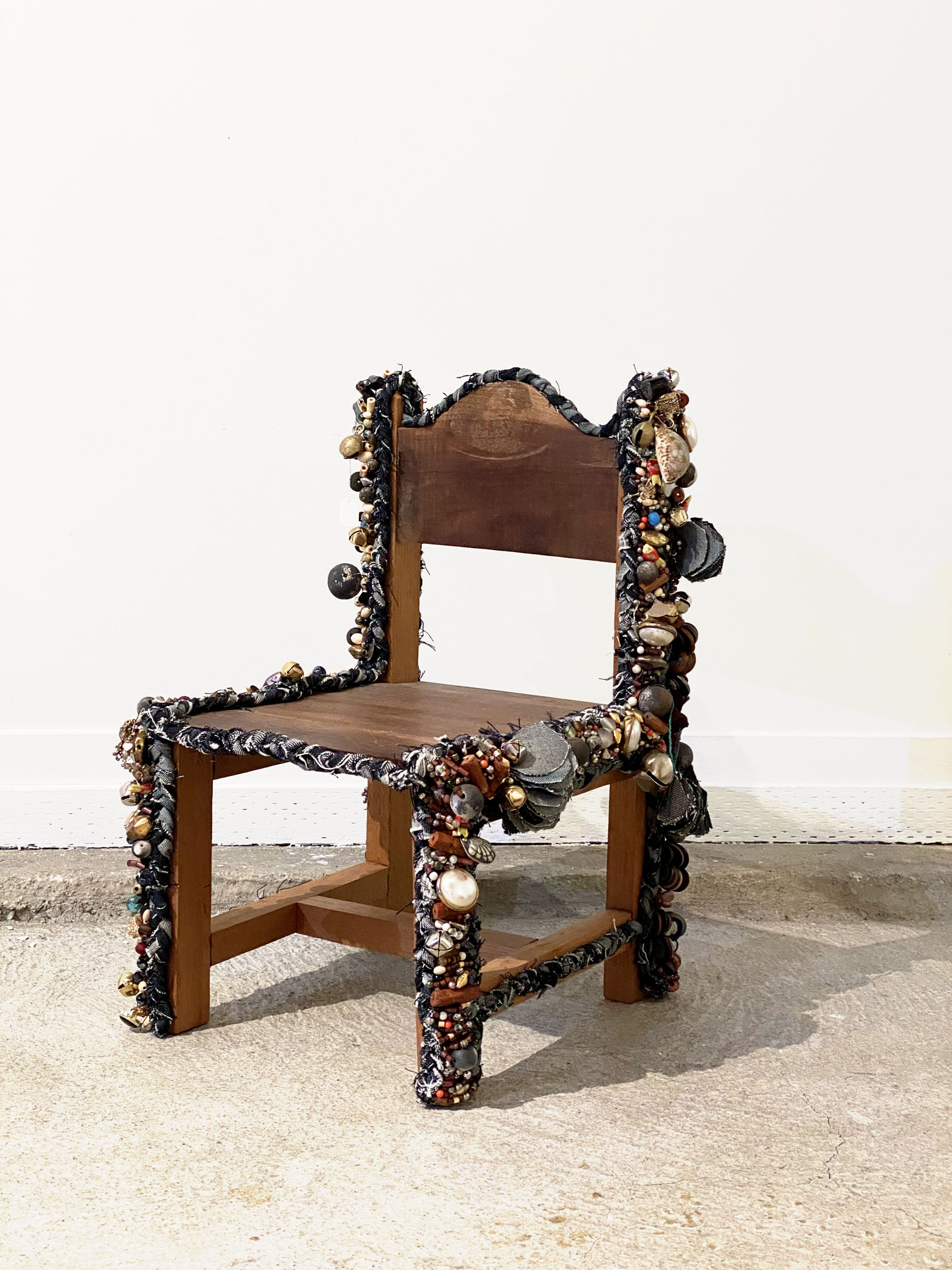 Llane Alexis, Throne, 2019, Beads, Jewlery and Ceramics on reclaimed Cuban cedarwood 18 x 10 x 10 inches