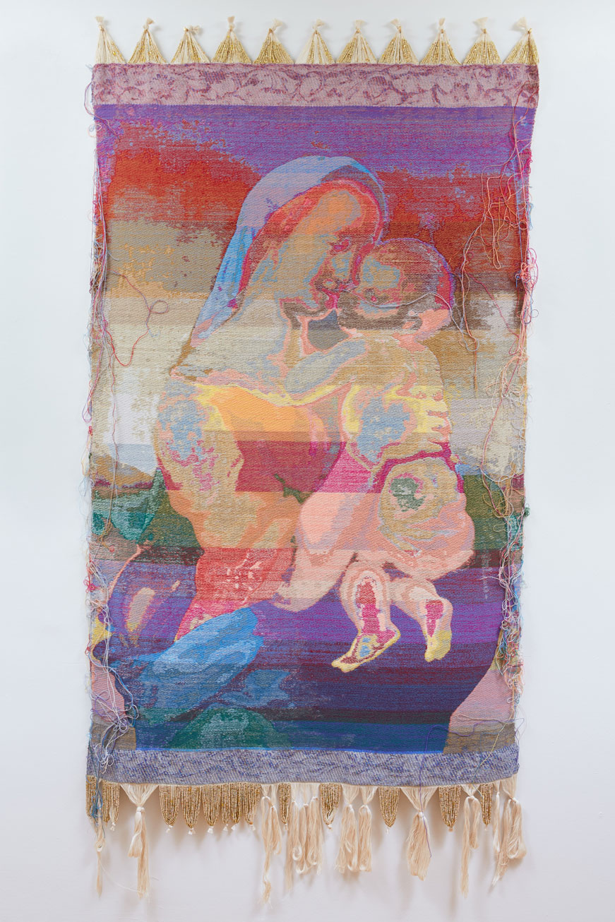 John Paul Morabito, La Madonna dei Tempi (dopo Raffaello Sanzio da Urbino), 2019, Cotton, wool, glass beads, gilded masonry nails 85”x 42”