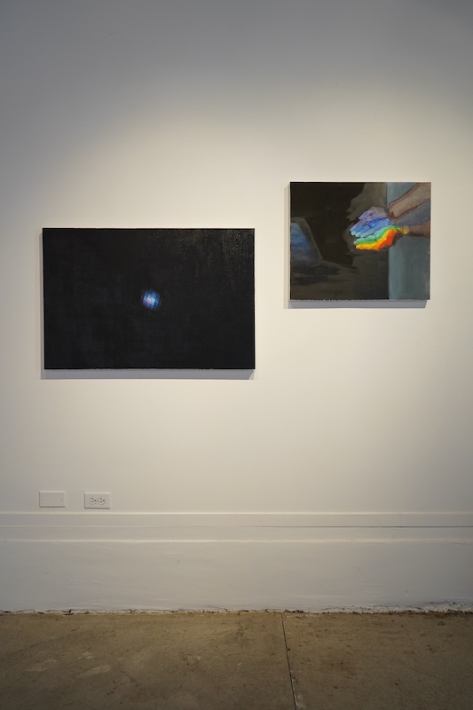 Whether depicting moonlight on hands, various renderings of a tesseract, celestial bodies or un-folded paper with zeros and ones suggesting one's place in our solar system, Zhang’s work offers a moment to reflect on the significance we give to the objects that give us perspective. Zhang meticulously renders moments over and again, referencing previous paintings through a mediated layer of time and space. Using humor and nostalgia, Zhang’s work floats between the familiar and the bizarre. Toilet bowls, lovingly rendered, float in space, and faceless figures embody empty architectural spaces. Zhang’s process utilizes photography and depictions of paintings within paintings within paintings to alter time and space and present an uncanny reality that defies easy answers.