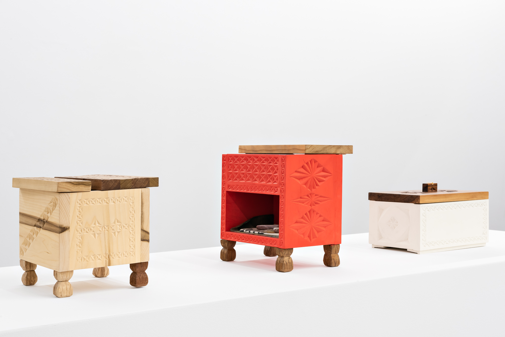 Patricia Fernández applies an archeological approach to traditional vessel design. She seeks to investigate histories and literatures forgotten, misplaced, or buried, and embeds them into the everyday objects. Her boxes, hand-carved with Moorish patterns she learned from her father, signal the intimate rituals of making. Masako Miki draws on the ancient mythological traditions of her Japanese ancestry to fuse these symbols and stories with modernist architectural shapes and forms. The resulting sculptural works use the Shinto concept of yōkai, or “shape-shifters” as a metaphorical departure point to explore blurred boundaries and dichotomies within the human condition. Rashaad Newsome, who will be showing concurrently his work across San Francisco this winter at Fort Mason’s Center for Art and Culture, MoAD, and Untitled Art Fair, revisits history and socio-cultural moments of alleged authorship to re-assign credit where it is due. Traditional design aesthetics from West Africa that are often attributed to Cubism are re-inserted to new narratives correcting the inaccuracies of the art historical record. Eamon Ore-Giron examines art historical legacies of the Global South and those of the Western canon side by side. Traditional shapes from ancient Meso-American painters meet the bold edges of the modern Russian avant-garde. Through this visual excavation he bends time in such a way that the past floats to the present and the historical and contemporary find themselves in direct dialogue. Curtis Talwst Santiago’s work considers the absence of certain narratives in dominant culture and draws on the tradition of storytelling to question the production of historical understanding. Working in miniature, his ring boxes and African Knight masks present a functioning design that can transport precious and functional objects through generations, becoming symbolic of oral historical practices.