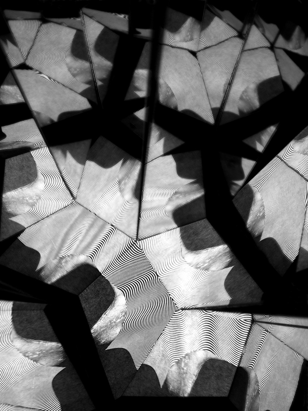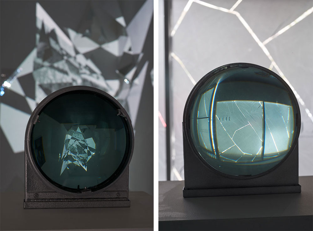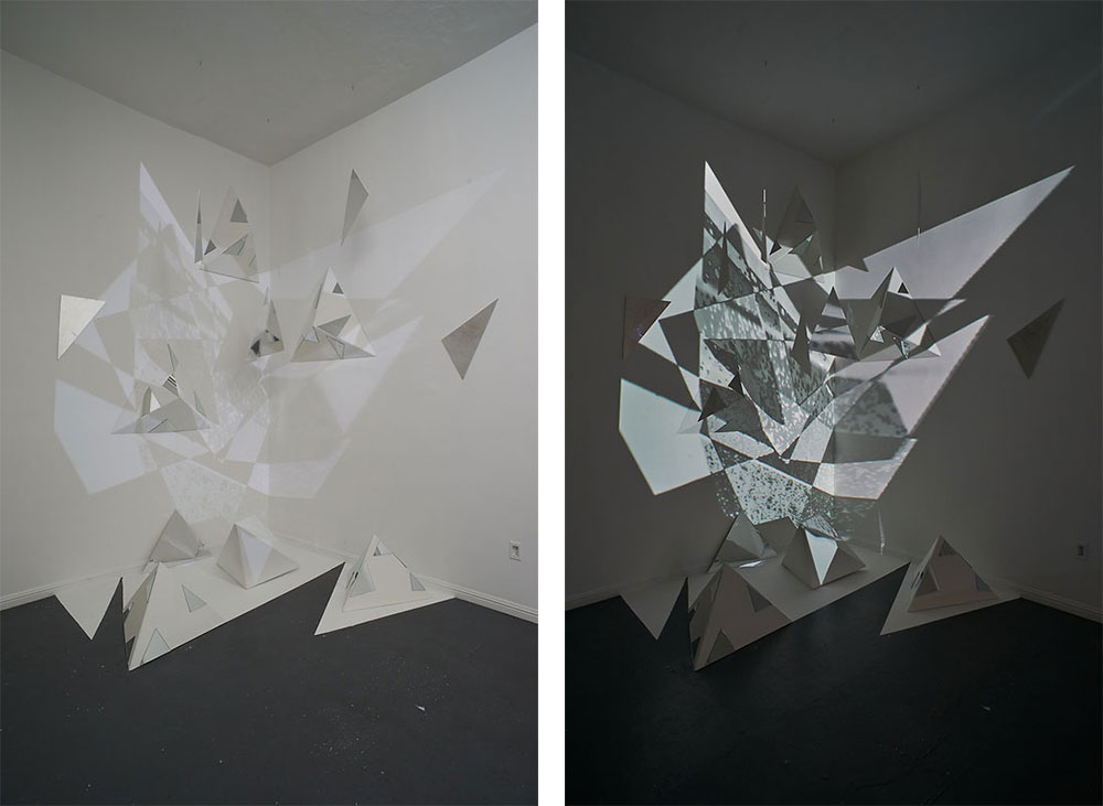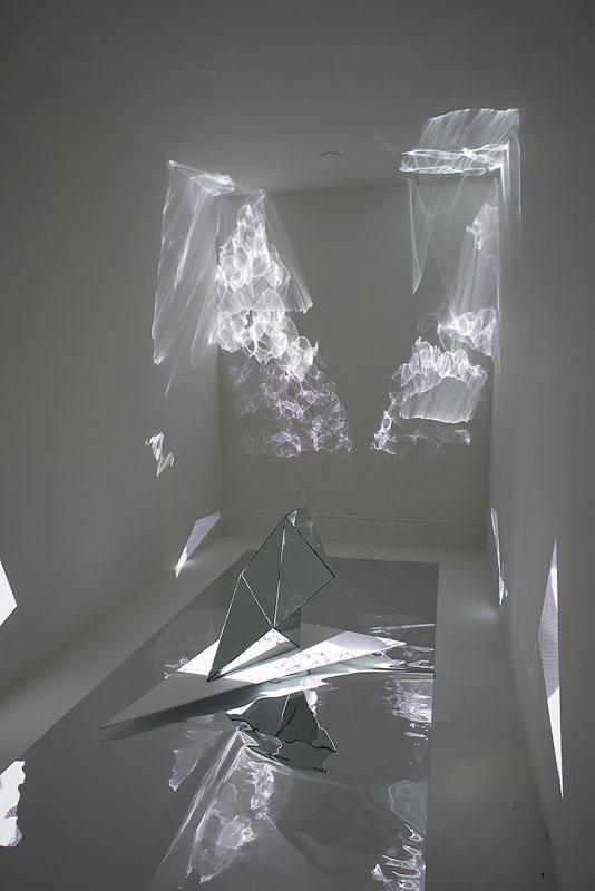 The title of the exhibition, Total Internal Reflection shares its name with the optical phenomenon that occurs when traveling light encounters a lesser dense medium, and as a result its path is diverted, such as light passing from glass to air or water to air. The title also invites reference to the mind seeking internal reflection. This new body of work explores cyclical forces of nature, transformation and the phenomenon of sound and light through a single channel video projection, photographs, site-specific sound and light installation and performance. Poling’s light installations experiment with scale and spatial coherence as altered through the use of mirrors, lenses and optics. Poling explains: “Scale is an important component to my work; constructing and shooting from the miniature models allows me to reference vastly massive landscapes, architectural matrices, portals and inter-dimensional space.”