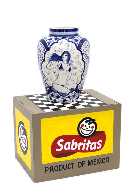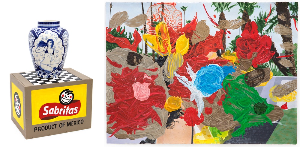 Images (from left): Eduardo Sarabia, Untitled (Sabritas), 2017, hand painted ceramic vase, hand painted wood box; Eduardo Sarabia, Sticky Green, 2017, acrylic on paperEduardo Sarabia’s work utilizes folklore, traditional craft and a mythology of Mexico’s recent and past history. His series of traditional blue and white Talavera ceramics (produced in collaboration with Guadalajara based Suro Ceramics) depicts contemporary imagery of the Mexican narcos. Whether proffered as a temptation directed at youth to join cartels or badges of worth, the ‘girls, drugs, and power that come hand in hand with goods of the drug trade’ are translated here into traditional motifs. For his resent paintings, Sarabia uses photographic snap shots as a palette to paint larger paintings, obscuring the original subject by the blobs of paint – the final result is a palimpsest of experiences altered, reminding us how the past is shaped over time.