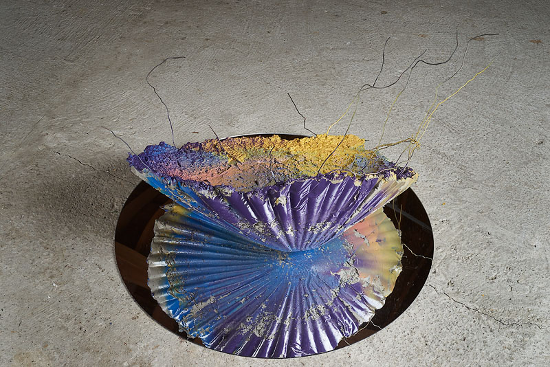 Also recontextualizing found objects and common materials, Gwladys Alonzo melds and re-appropriates forms into sculptures that demonstrate a precarious vulnerability. She utilizes classic materials such as metal, wax, concrete, marble and stone, while using unconventional techniques. Her structural gestures embody humor, and question stereotypes associated with the predominantly male practice of sculpture, where eminently phallic verbs such as ‘erect’, ‘raise’, ‘train’ and ‘recover’ are part of the vocabulary. Her works Acapulco I and Acapulco II are site-specific interventions made on site at the new gallery location with concrete, wire, spray enamel and mirrored Plexiglas.