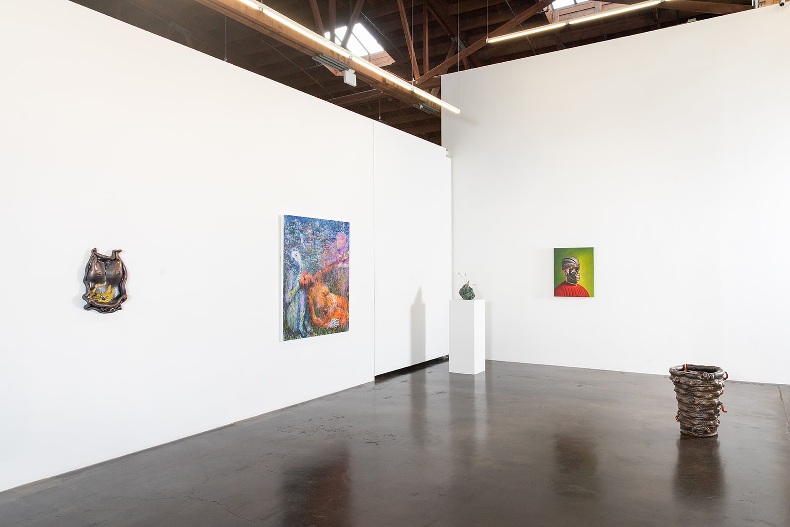 In The Veil Between, each artist approaches the space between worlds as a site of inquiry—where belief, memory, labor, and imagination take form. Anthony Olubuni Akinbola reconfigures everyday materials such as durags, palm oil, and hair tools into charged surfaces that hold cultural, spiritual, and diasporic meaning. Miya Ando translates fleeting natural phenomena—light, fire, and time—into precise material systems using charred wood, indigo, metal, and paper to register impermanence and duration. Ashwini Bhat works through clay as an extension of the body, merging feminine form, land stewardship, and ritual into sculptures that honor nature as sacred and position material as a conduit for transformation and regeneration. Nicki Green, working primarily in clay, employs ornamentation and transness as lenses through which to question history, spirituality, and aesthetics of otherness, crafting objects that operate simultaneously as vessels, relics, and speculative futures. Soleé Darrell’s intuition-driven paintings bridge inner and outer worlds, using layered media, gesture, and color to map unseen emotional and spiritual terrain with quiet optimism.